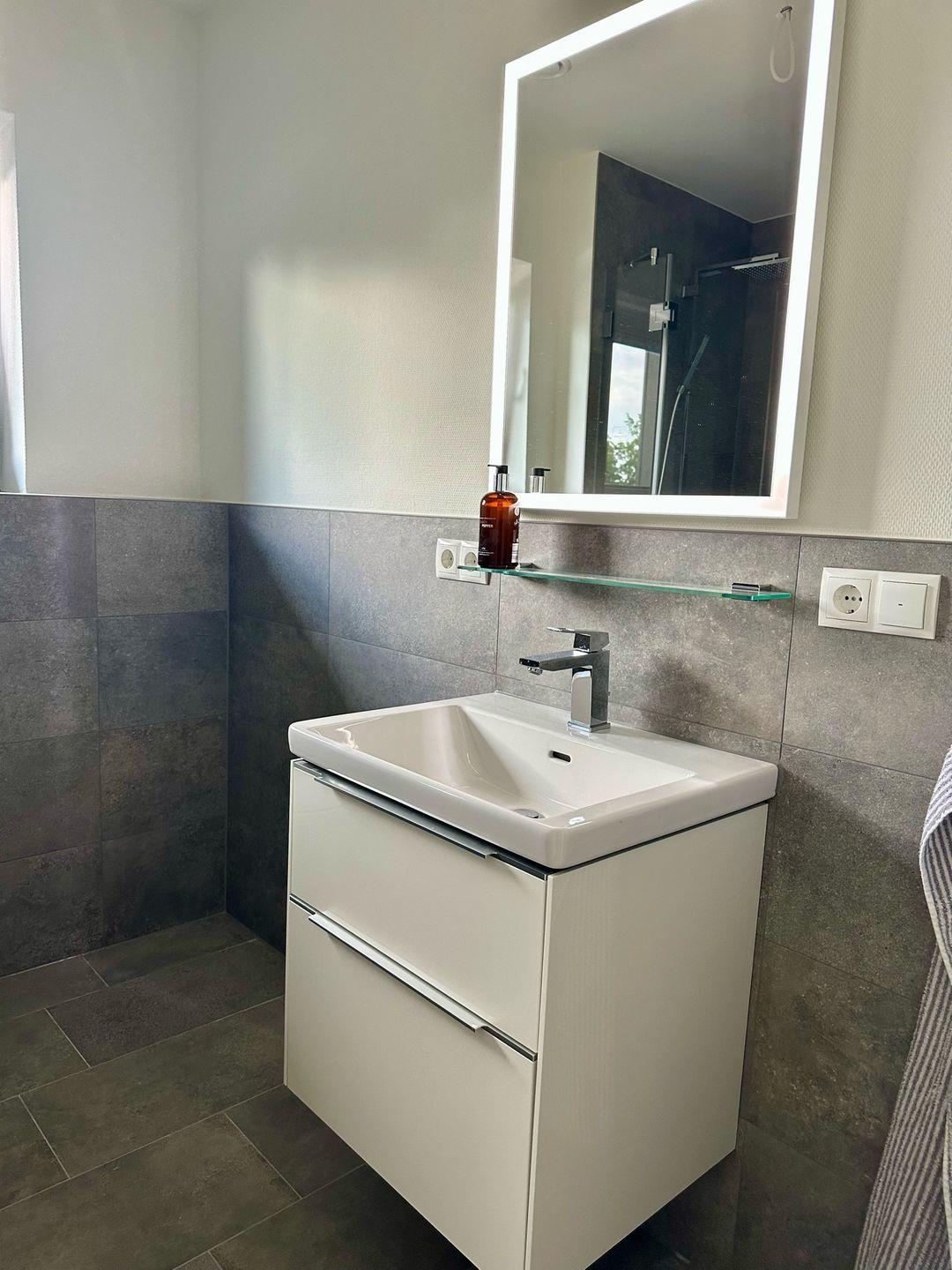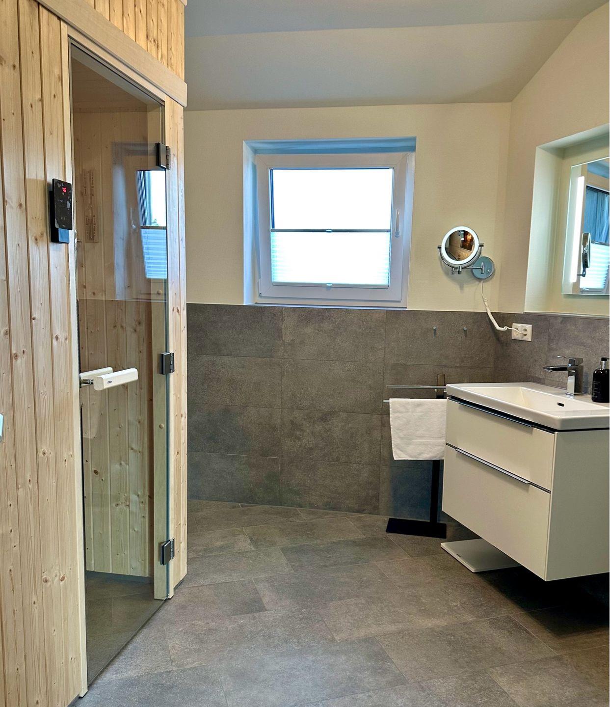 Die Bäder, mit Fenstern, verfügen über Dusche, Waschbecken, WC, Föhn und Handtuchtrockner. Eine private Sauna sorgt an kühlen Tagen für wohlige Wärme.