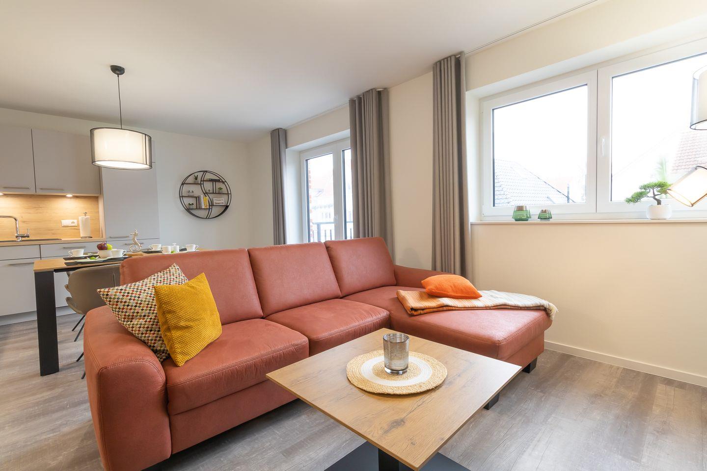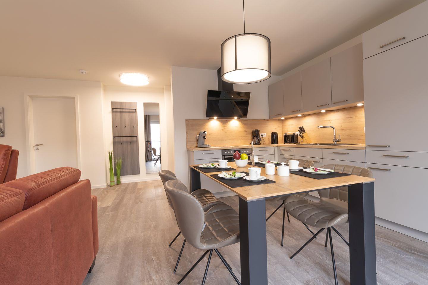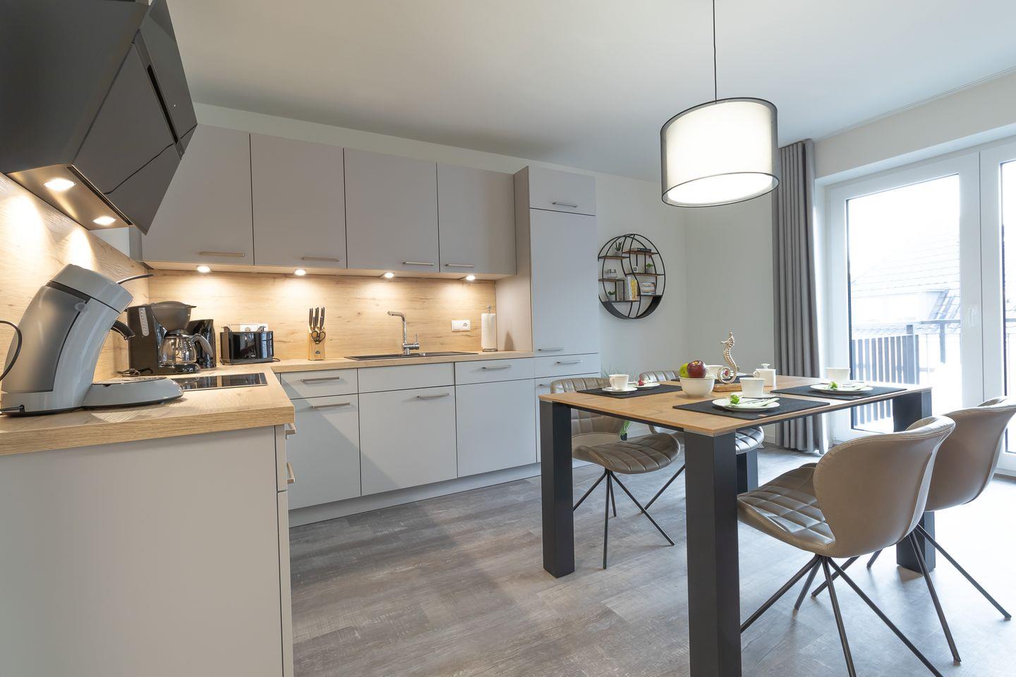 Der lichtdurchflutete Wohnbereich schafft mit seiner geschmackvollen Einrichtung eine entspannte Atmosphäre. Von hier gelangst du auf den sonnigen Südbalkon, auf dem du Meeresbrise und Sonnenstrahlen genießen kannst. Die offene, voll ausgestattete Küche mit Senseo-Kaffeemaschine lädt zu gemeinsamen Kocherlebnissen ein. Am angrenzenden Esstisch findet ihr Platz für gemütliche Mahlzeiten.