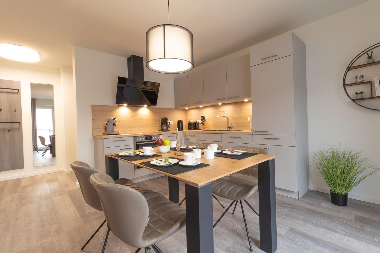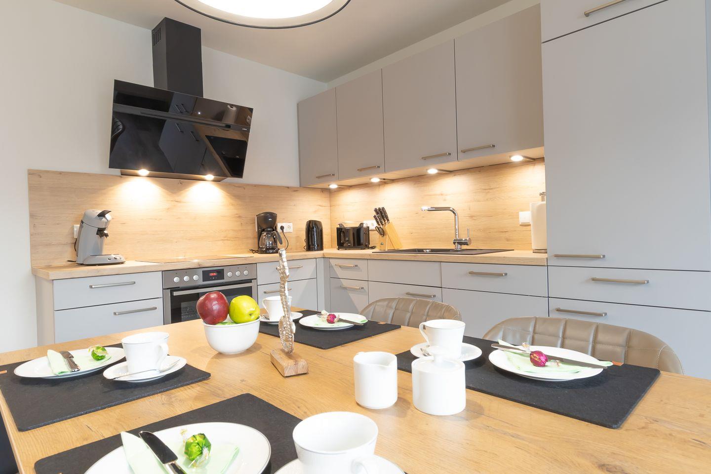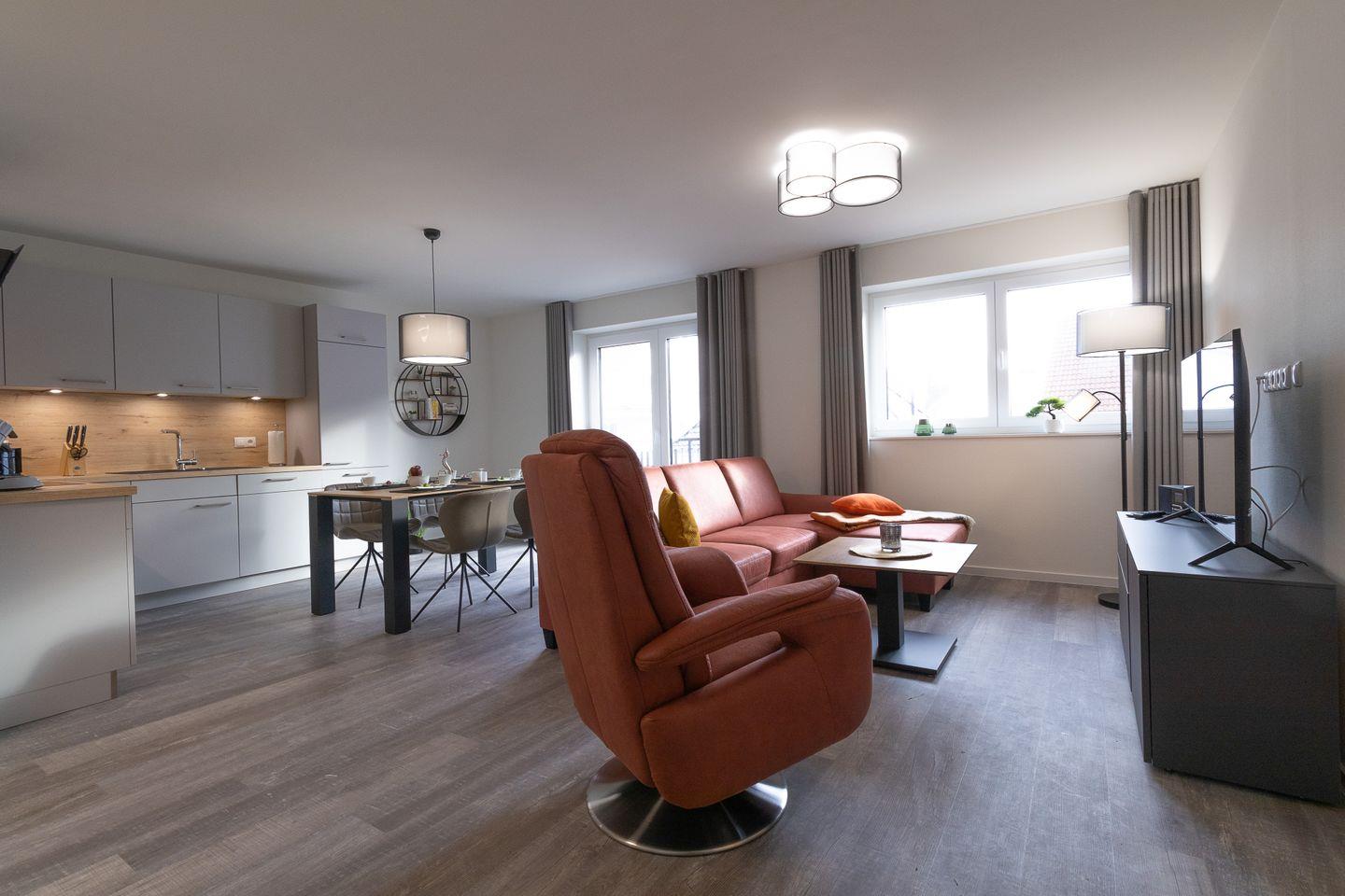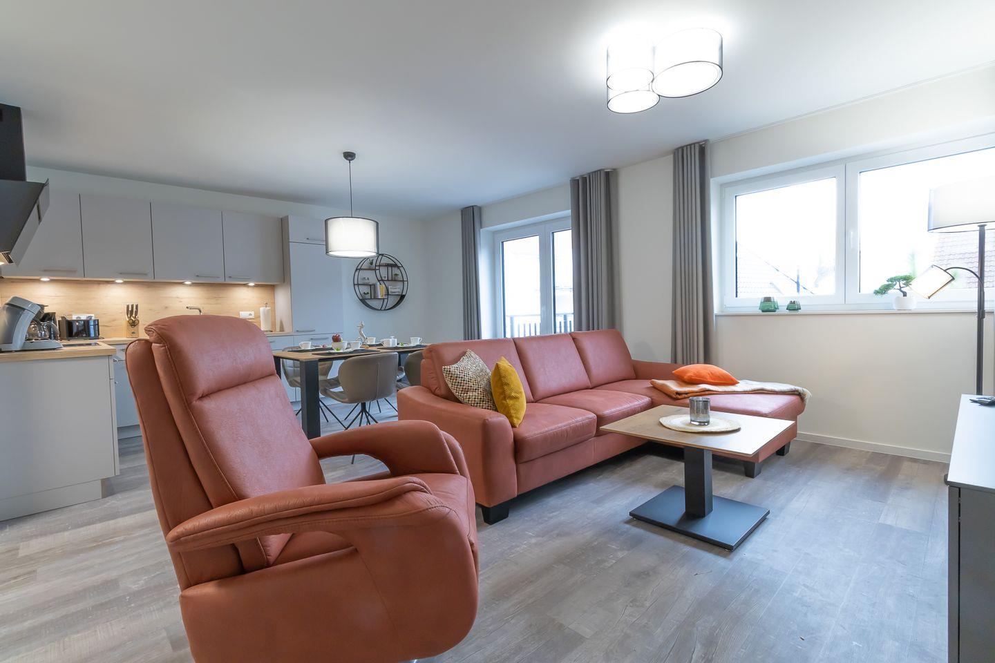 Der lichtdurchflutete Wohnbereich schafft mit seiner geschmackvollen Einrichtung eine entspannte Atmosphäre. Von hier gelangst du auf den sonnigen Südbalkon, auf dem du Meeresbrise und Sonnenstrahlen genießen kannst. Die offene, voll ausgestattete Küche mit Senseo-Kaffeemaschine lädt zu gemeinsamen Kocherlebnissen ein. Am angrenzenden Esstisch findet ihr Platz für gemütliche Mahlzeiten.