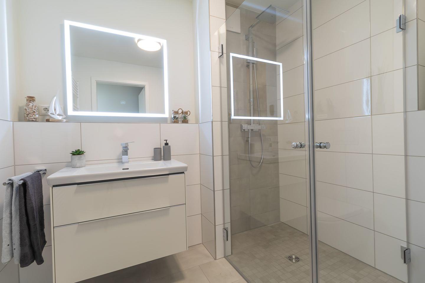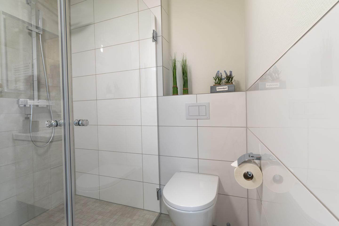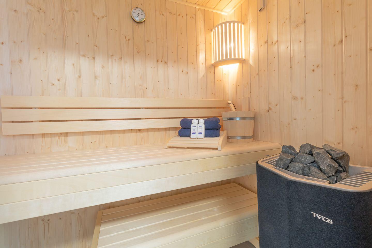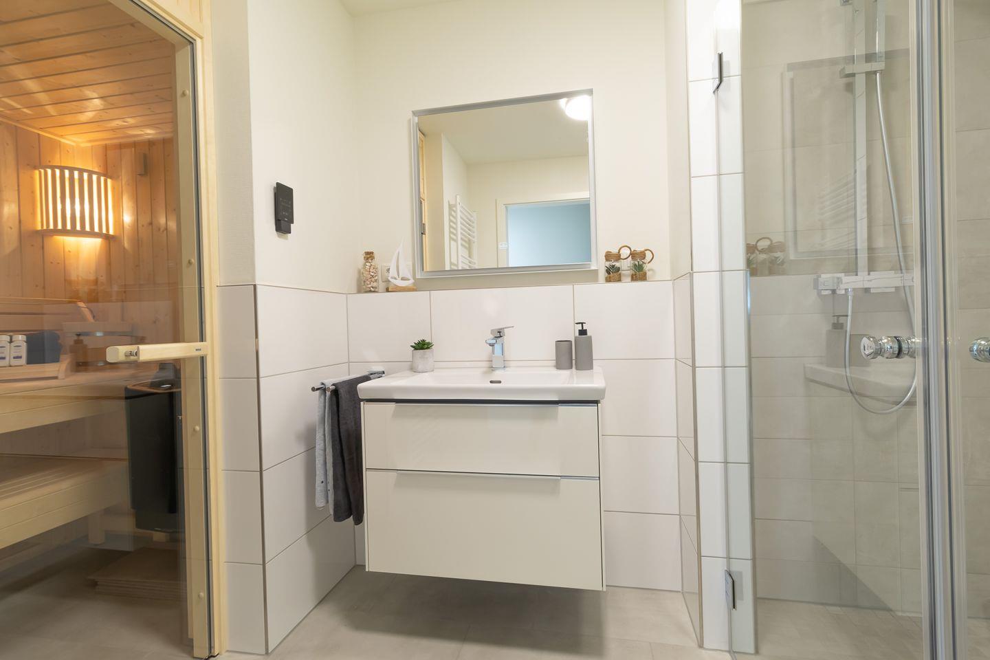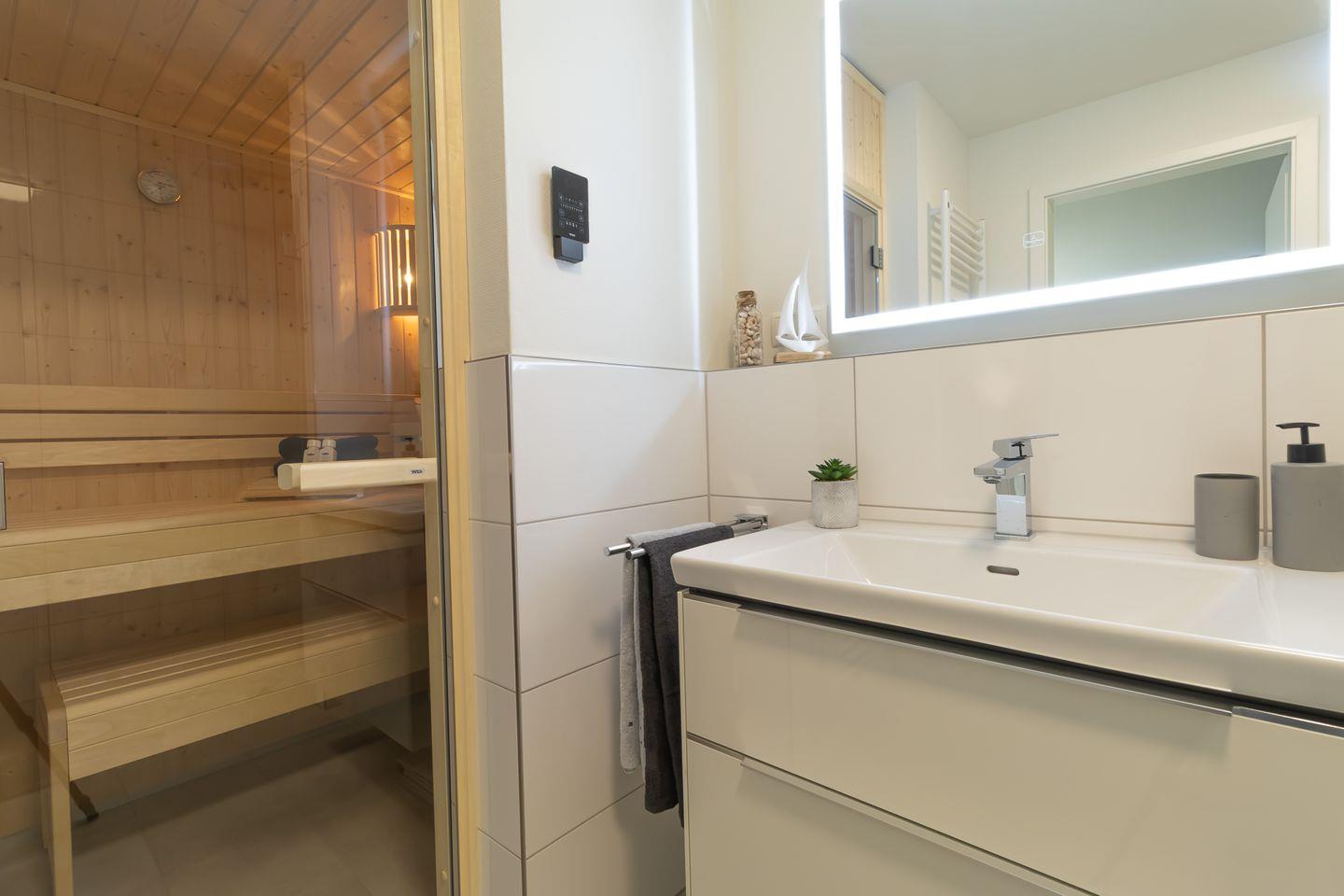 Im großzügigen Bad erwartet dich eine bodentiefe Dusche sowie eine private Sauna – ideal, um nach einem Strandtag zu entspannen oder dich an kühleren Tagen aufzuwärmen.
