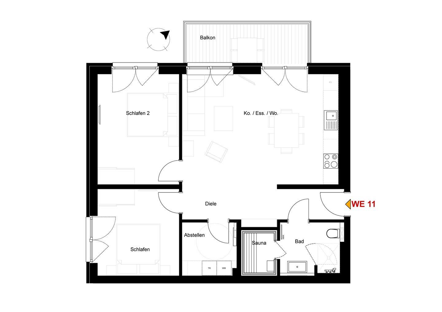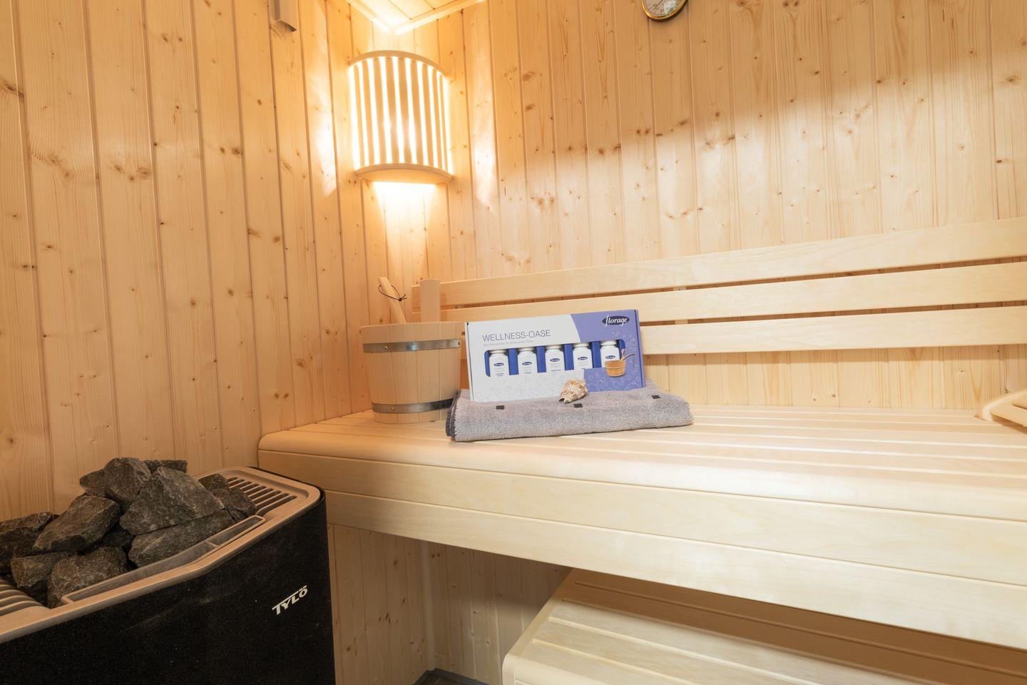 Das stilvolle Bad mit bodengleicher Dusche und privater Sauna macht deine Auszeit perfekt. Entspanne dich nach einem langen Strandspaziergang oder genieße einfach dein tägliches Wellnessritual direkt in der Wohnung.