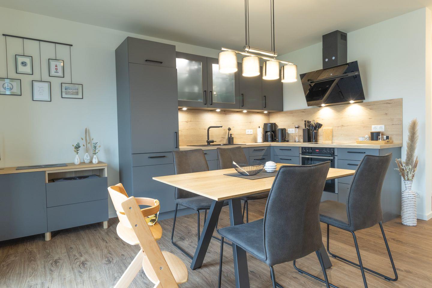 Der helle Wohnbereich überzeugt mit moderner Einrichtung, großen Fenstern und gemütlicher Atmosphäre. Viel Platz zum Verweilen, Entspannen oder gemeinsamen Spielen. Die offene Küche mit grauer Betonoptik ist voll ausgestattet und bietet alles, was du für gemeinsame Kochmomente brauchst – vom Frühstück bis zum Abendessen.