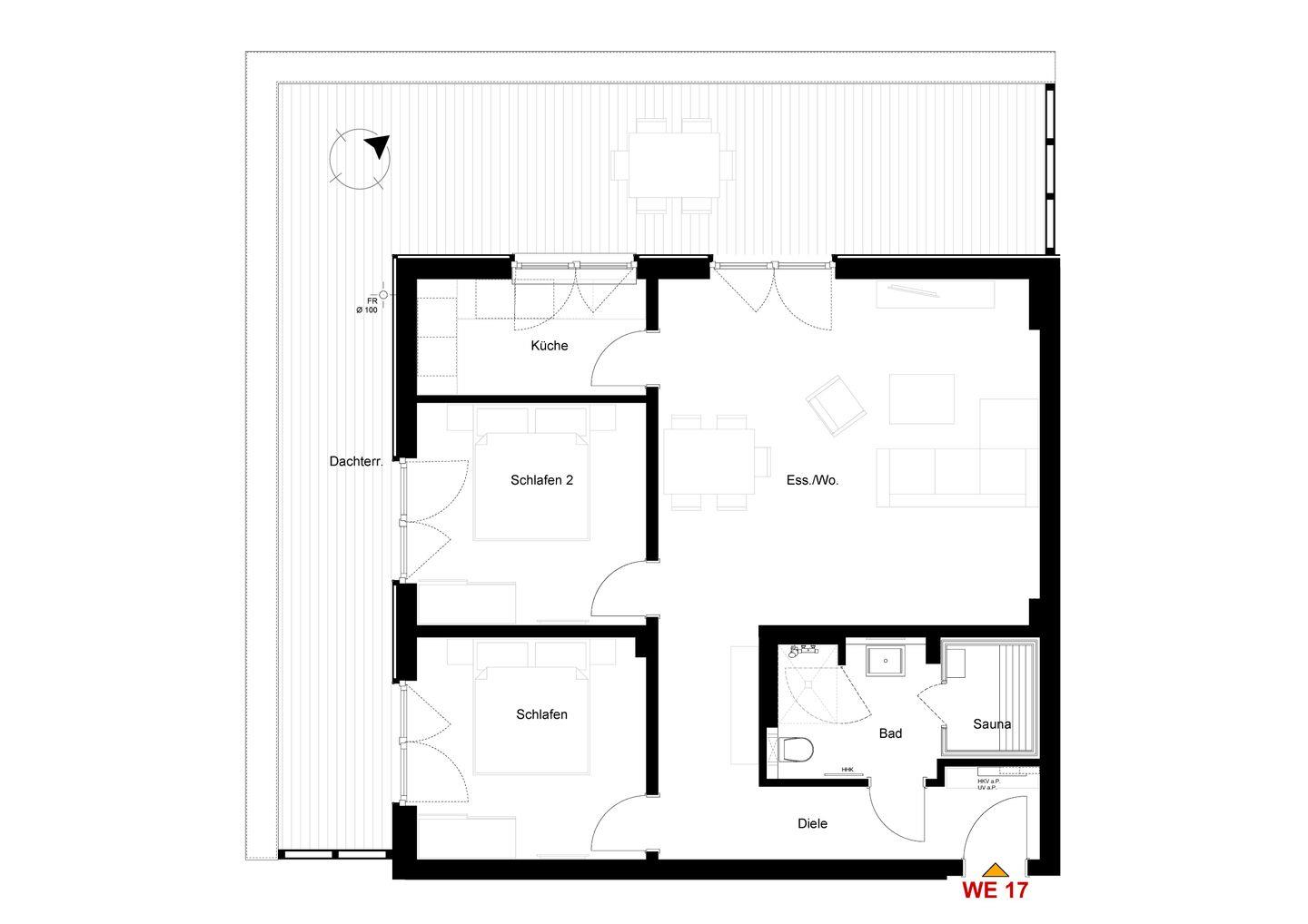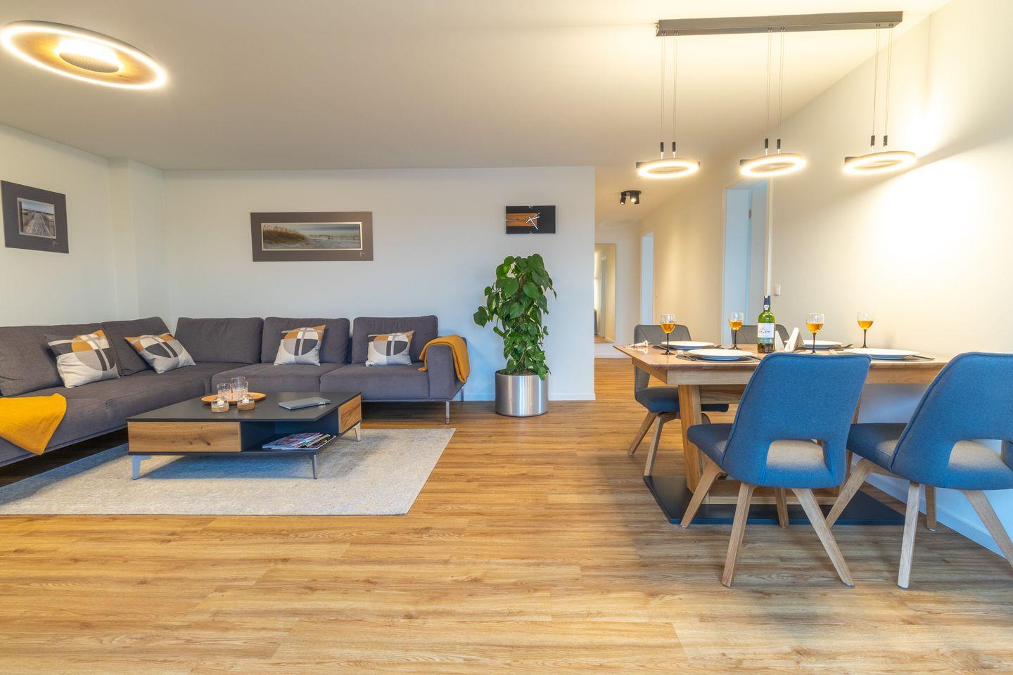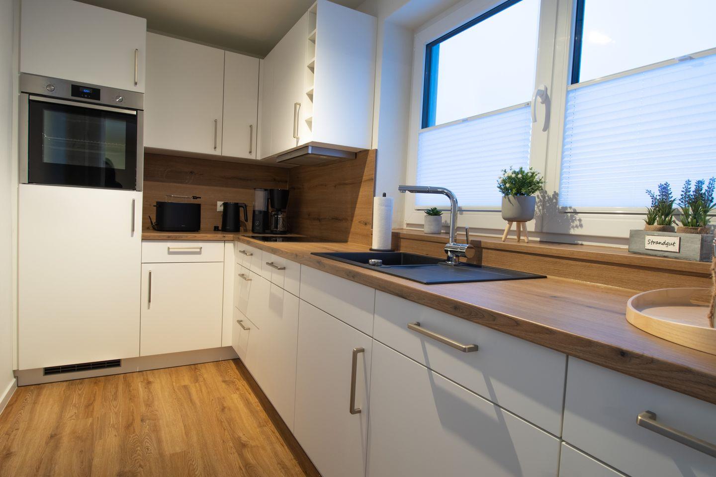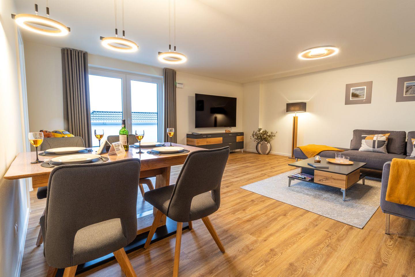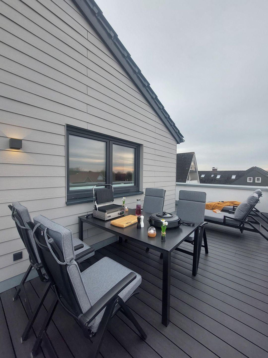 Der offene Wohn- und Essbereich ist großzügig geschnitten. Bequeme Sitzmöbel und Smart-TV mit MagentaTV stehen für entspannte Abende bereit. Große Fenster schaffen viel Licht. Du gehst direkt auf die Dachterrasse und genießt den weiten Blick über Kellenhusen. Die offene Küche ist separat angeordnet und vollständig ausgestattet. Backofen, Geschirrspüler und hochwertige Geräte unterstützen dich beim Kochen. Am Esstisch sitzen alle gemeinsam.