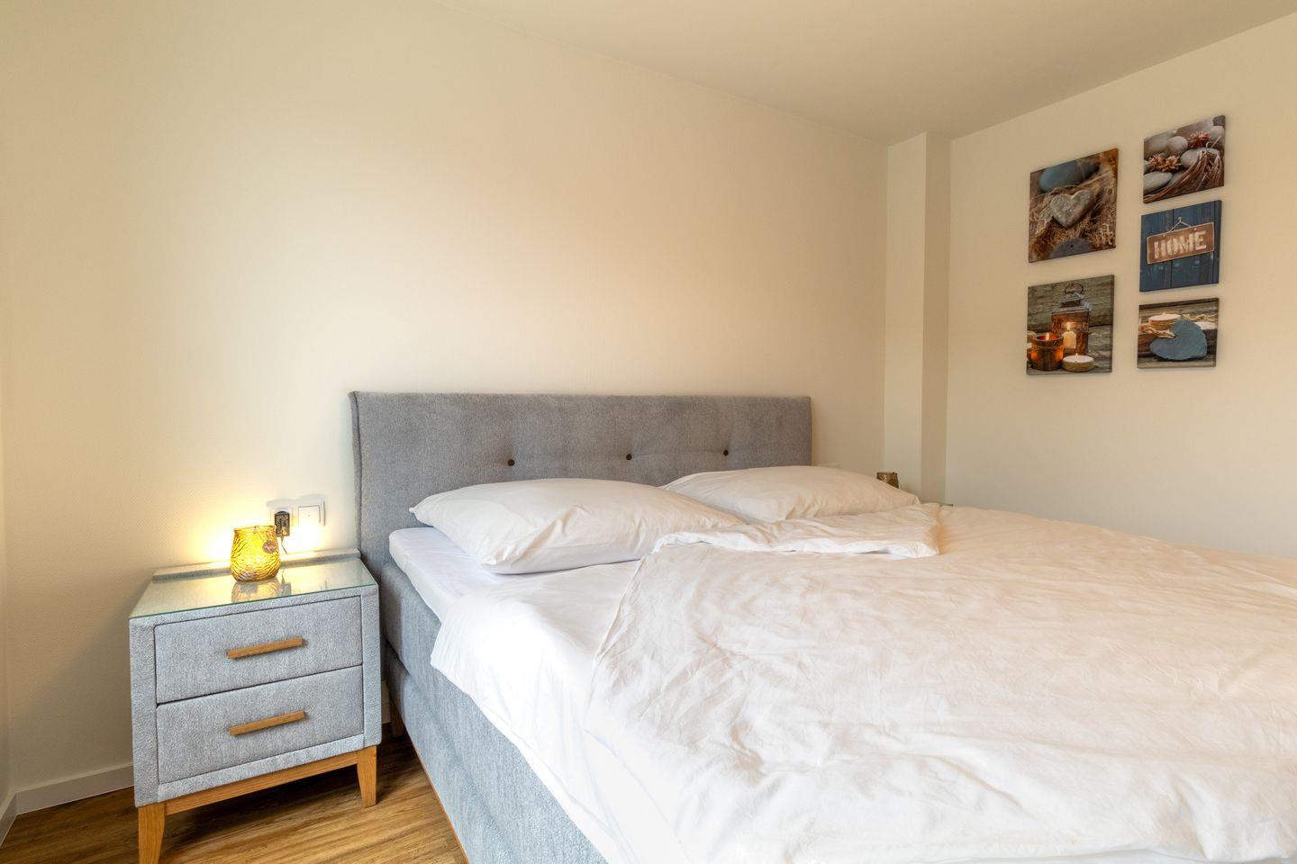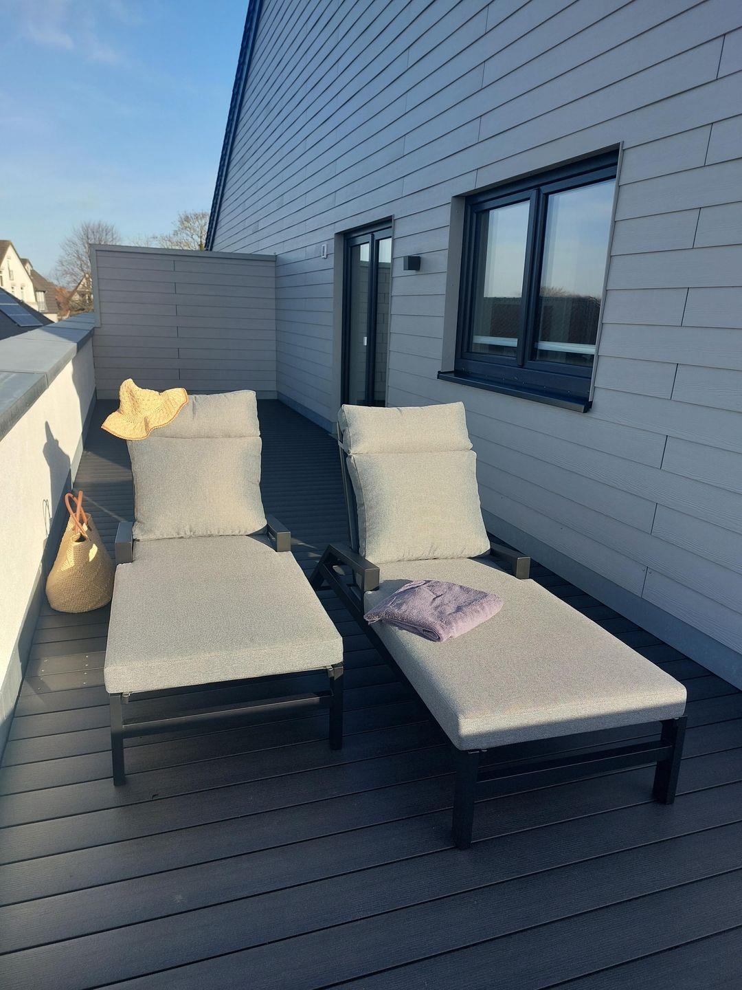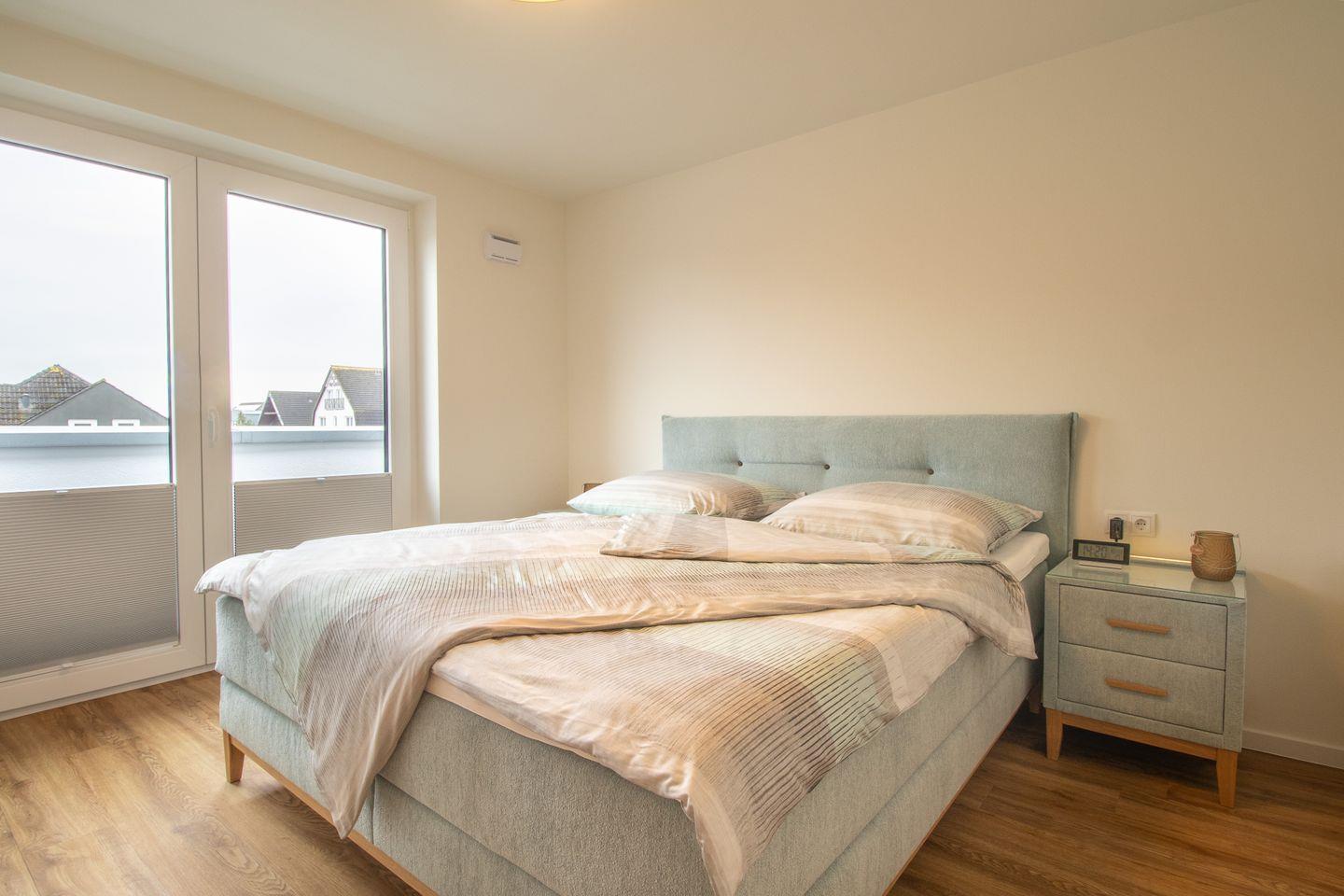 Zwei Schlafzimmer bieten dir ruhige Rückzugsorte. Beide Räume sind mit Boxspringbetten ausgestattet. Verdunkelungsplissees sorgen für erholsamen Schlaf. Von beiden Schlafzimmern hast du direkten Zugang zur Dachterrasse. Geräumige Kleiderschränke bieten ausreichend Stauraum.