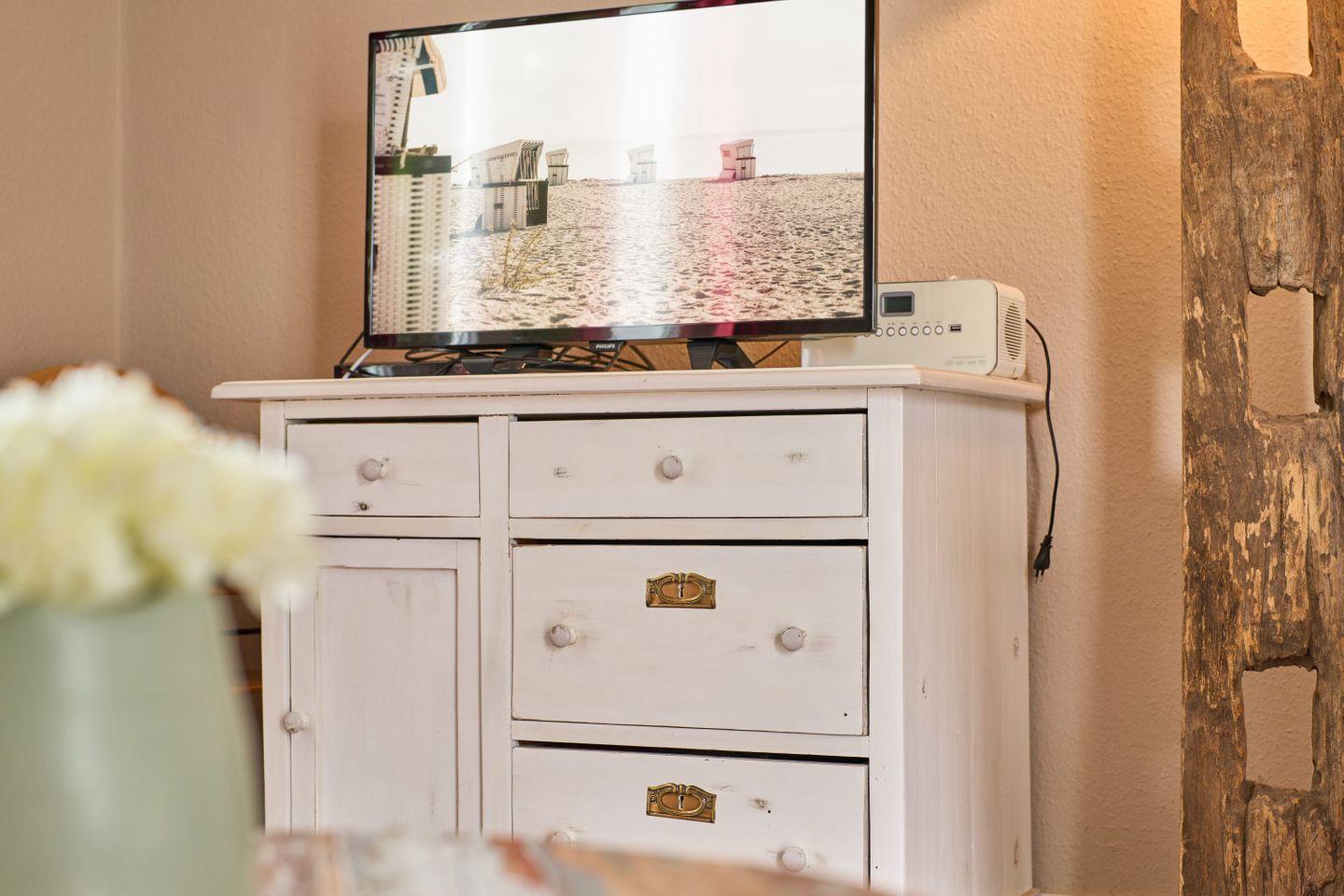 Der offene Wohn- und Essbereich lädt zum Verweilen und Entspannen ein. Hier finden Sie einen komfortablen Sofa-Bereich, ideal zum Entspannen nach einem erlebnisreichen Tag an der Ostsee. Der Esstisch bietet genügend Platz für gemeinsame Mahlzeiten und lustige Abende. Die kleine, aber funktionale Küche ist mit einem Cerankochfeld, einem Kühlschrank, einer Spülmaschine und allen notwendigen Küchenutensilien ausgestattet. Egal, ob Sie ein einfaches Frühstück zubereiten oder ein festliches Abendessen planen, hier finden Sie alles, was Sie dafür benötigen. Auch Kaffeemaschine und Toaster sind vorhanden, um Ihren Tag perfekt zu beginnen.