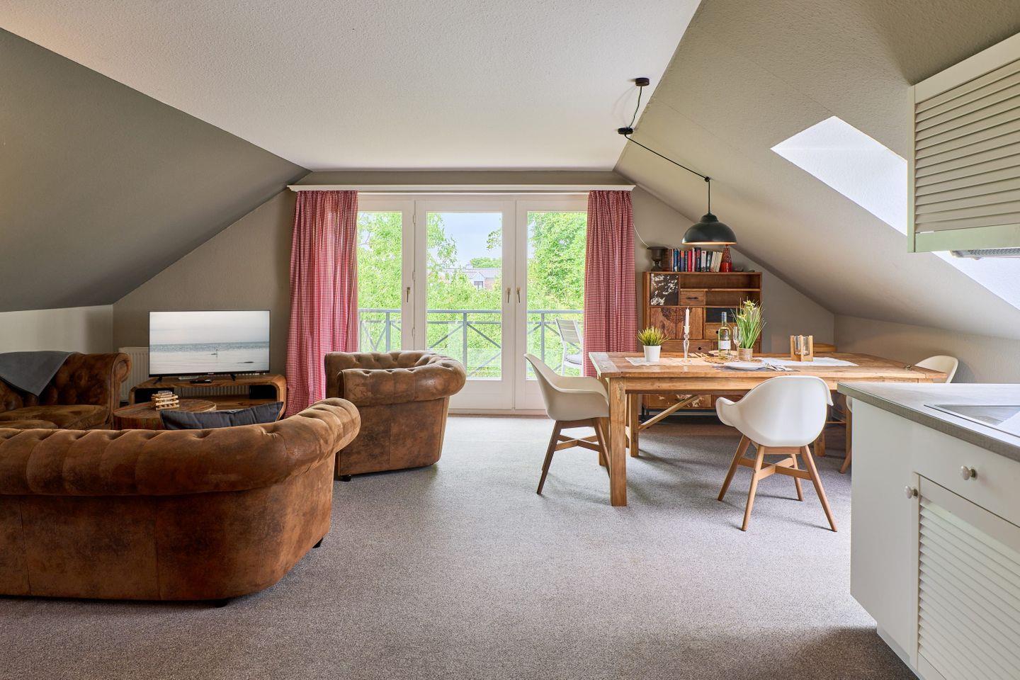 Der Wohnbereich ist liebevoll eingerichtet und verfügt über ein Sofa, einen Sessel sowie einen Esstisch, an dem Sie gemeinsam speisen oder entspannen können. Für Ihre Unterhaltung ist ein Fernseher vorhanden, und dank des kostenfreien WLANs bleiben Sie auch im Urlaub mit der digitalen Welt verbunden.