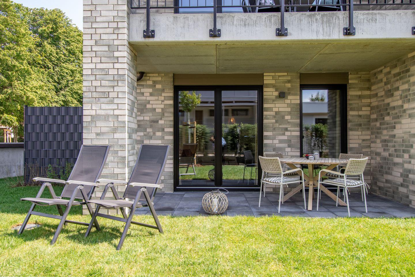 Der helle Wohnbereich mit bodentiefen Fenstern öffnet sich zur sonnigen Terrasse mit Zugang zum eigenen Garten. Die offene Küche ist voll ausgestattet – perfekt für gemeinsames Kochen und Genießen. Dank Fußbodenheizung und Wohnraumlüftung mit Wärmerückgewinnung herrscht ganzjährig ein angenehmes Raumklima.