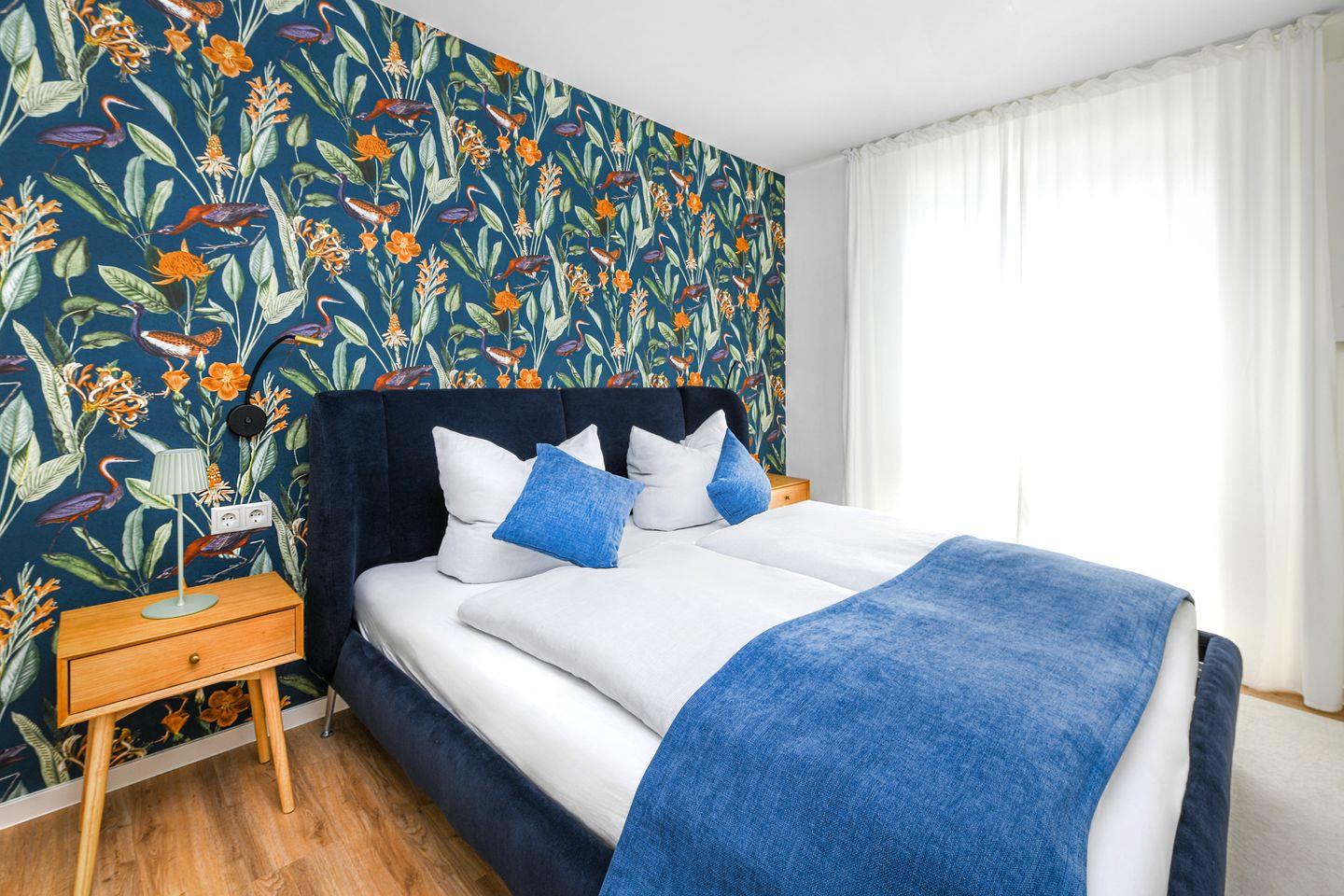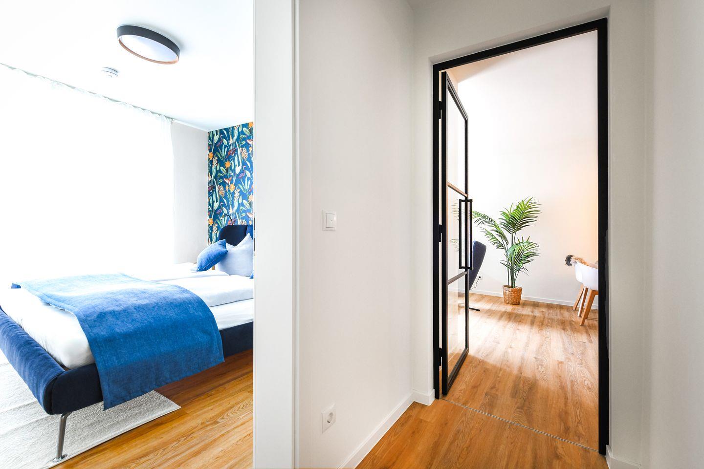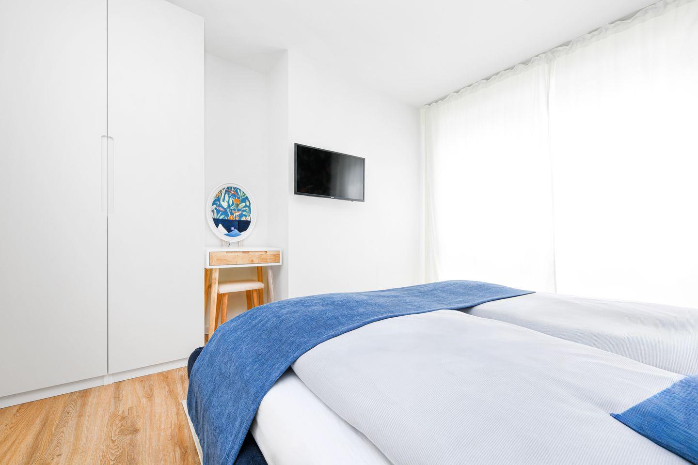 Beide Schlafzimmer sind liebevoll eingerichtet und mit Smart-TV sowie bequemen Doppelbetten ausgestattet. Verdunkelungsplissees sorgen für erholsamen Schlaf, und das ruhige Farbkonzept schafft eine entspannte Atmosphäre – ideal für Paare, Freunde oder Familien.