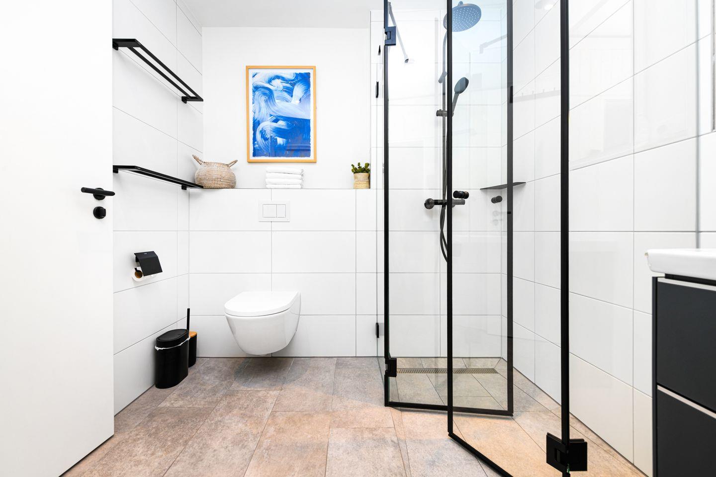 Das moderne Badezimmer ist eine kleine Wellnessoase. Eine bodengleiche Dusche, stimmiges Design und deine eigene Sauna laden zum Abschalten ein – perfekt nach einem Tag am Meer oder einer Radtour durch die Region.