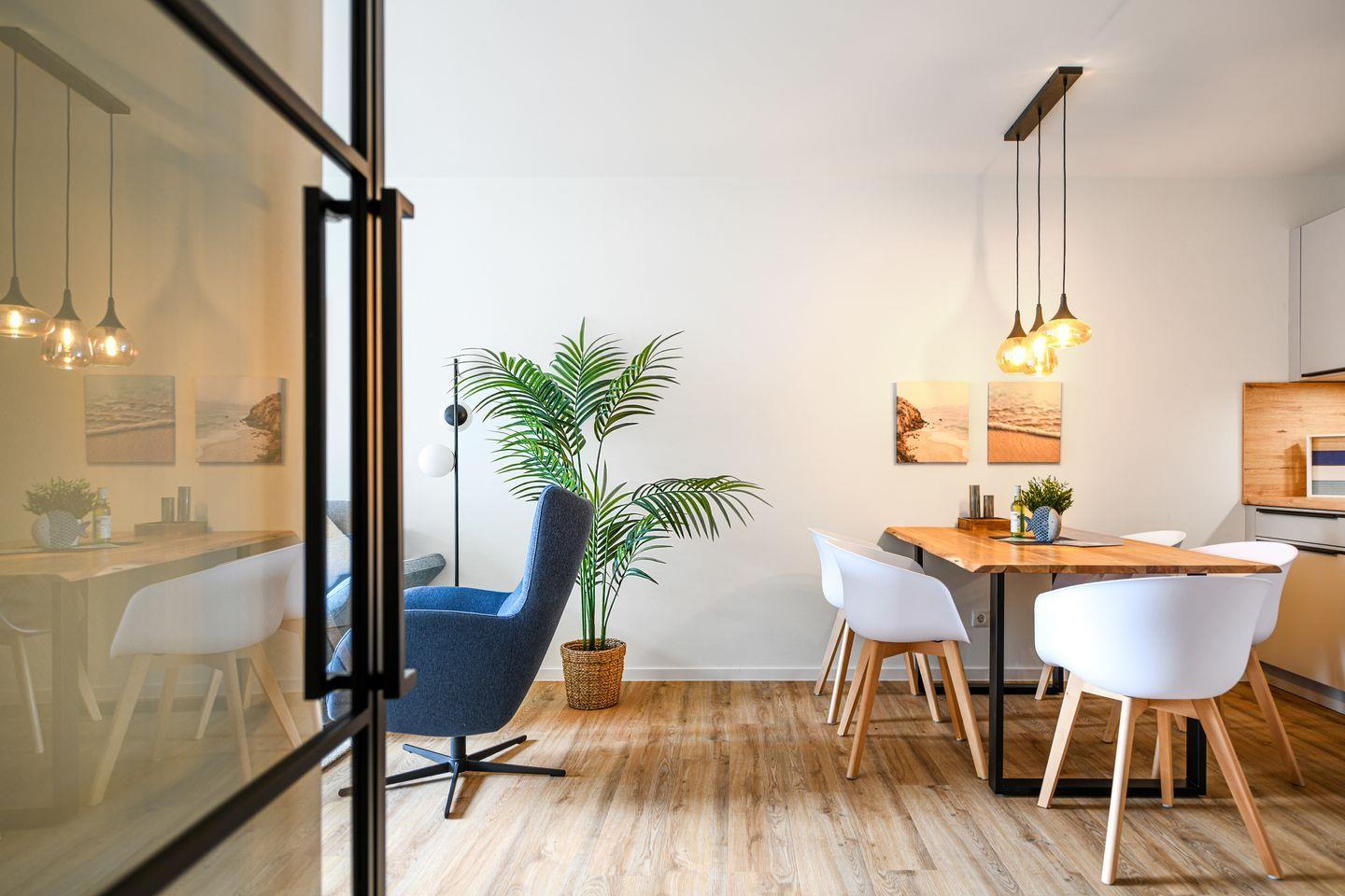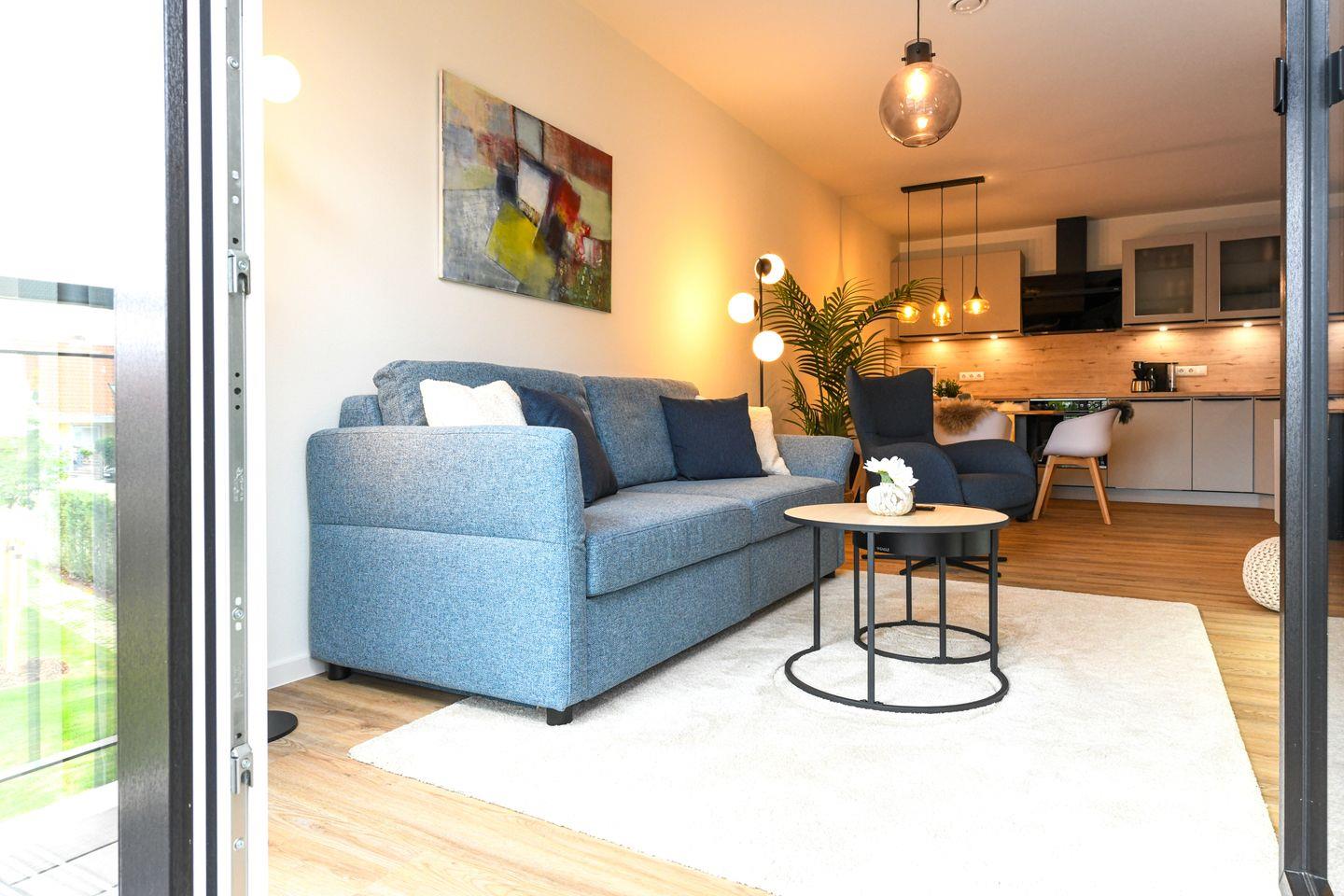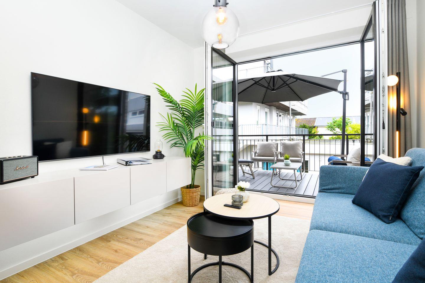 Der großzügige Wohnbereich empfängt dich mit viel Tageslicht, bodentiefen Fenstern und geschmackvoller Einrichtung. Die offene Küche ist voll ausgestattet – ideal für gemeinsame Mahlzeiten oder ein entspanntes Frühstück am angrenzenden Esstisch. Auf dem sonnigen Balkon lässt sich die Ostseeluft besonders gut genießen. Für zwei zusätzliche Gäste bietet die gemütliche Schlafcouch im Wohnzimmer eine bequeme Übernachtungsmöglichkeit.