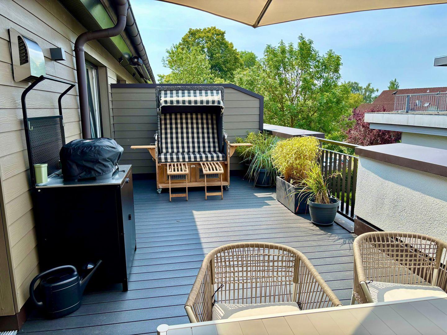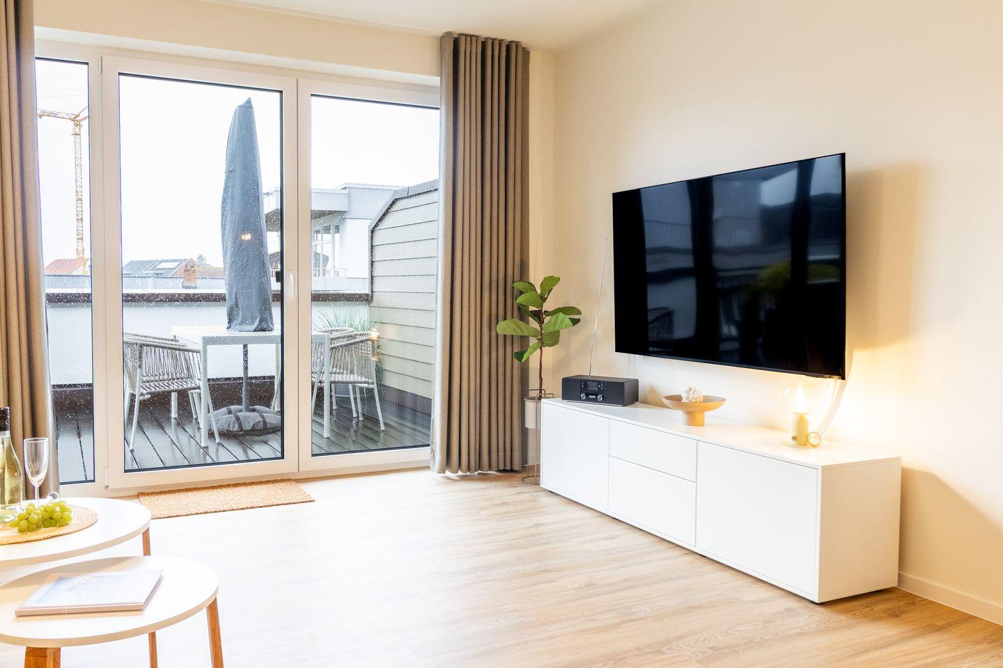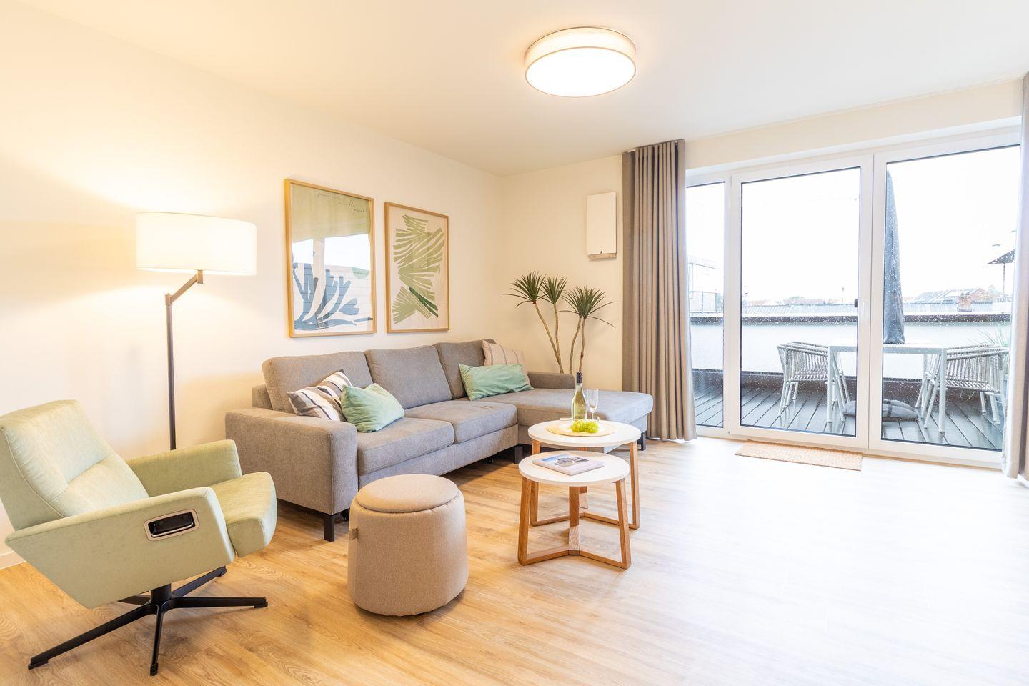 Der lichtdurchflutete Wohnbereich mit 65-Zoll-Smart-TV ist dein gemütlicher Mittelpunkt – offen, modern und mit direktem Zugang zur rund 26?m² großen Dachterrasse. Hier genießt du Sonne, Meerluft und Entspannung im eigenen Strandkorb. Zusätzlich lädt eine windgeschützte Nische mit Tisch zur Kaffeepause am Morgen ein. Die offene Küche ist hochwertig ausgestattet – ideal für genussvolle Mahlzeiten und gesellige Abende. Für wohlige Wärme sorgt eine Fußbodenheizung, die Lüftungsanlage mit Wärmerückgewinnung garantiert ein angenehmes Raumklima.