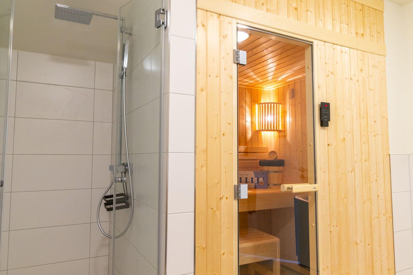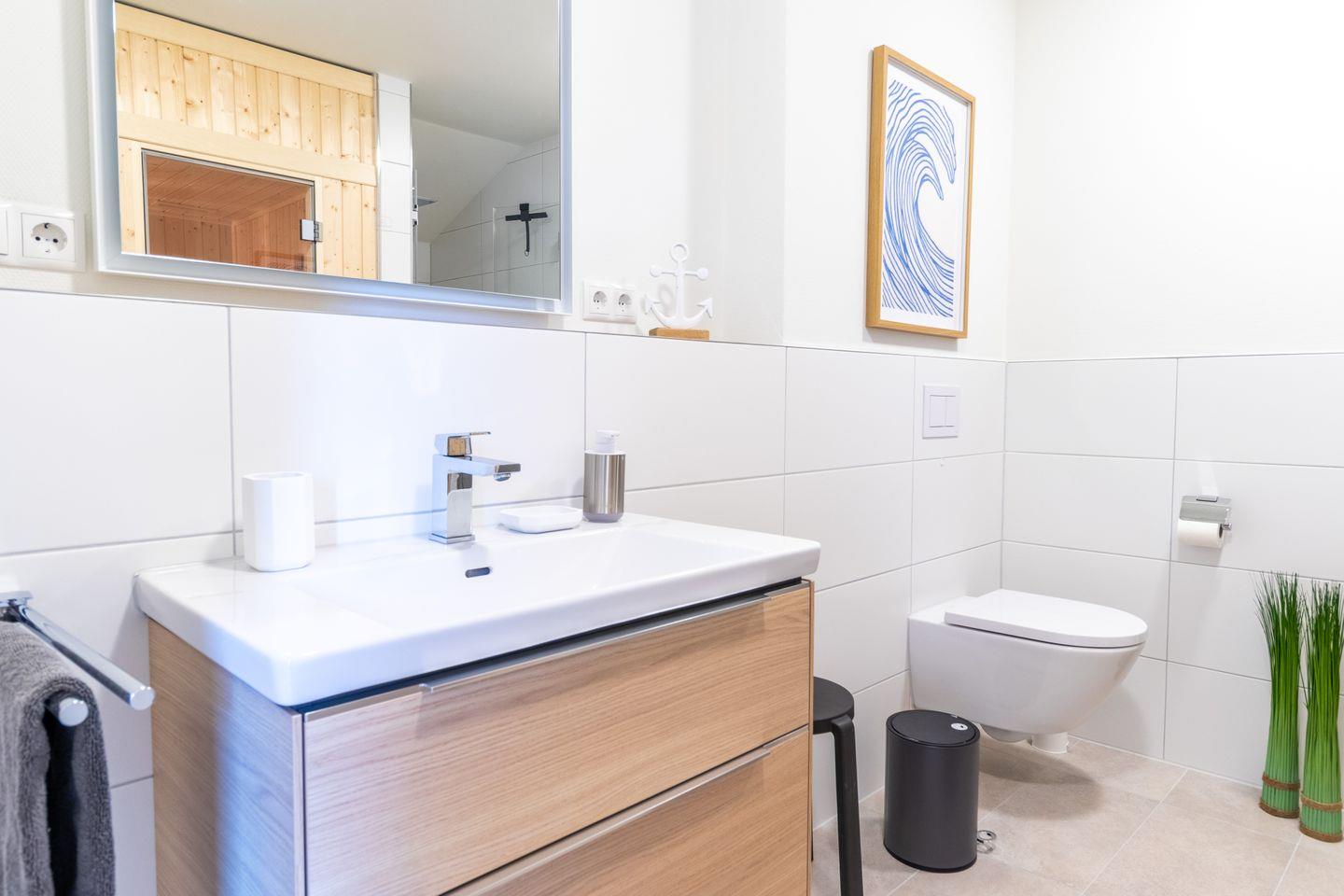 Entspannung pur verspricht deine private Sauna – besonders nach aktiven Tagen am Strand. Das Badezimmer ist modern gestaltet und sorgt in Kombination mit der Fußbodenheizung für echtes Spa-Feeling.