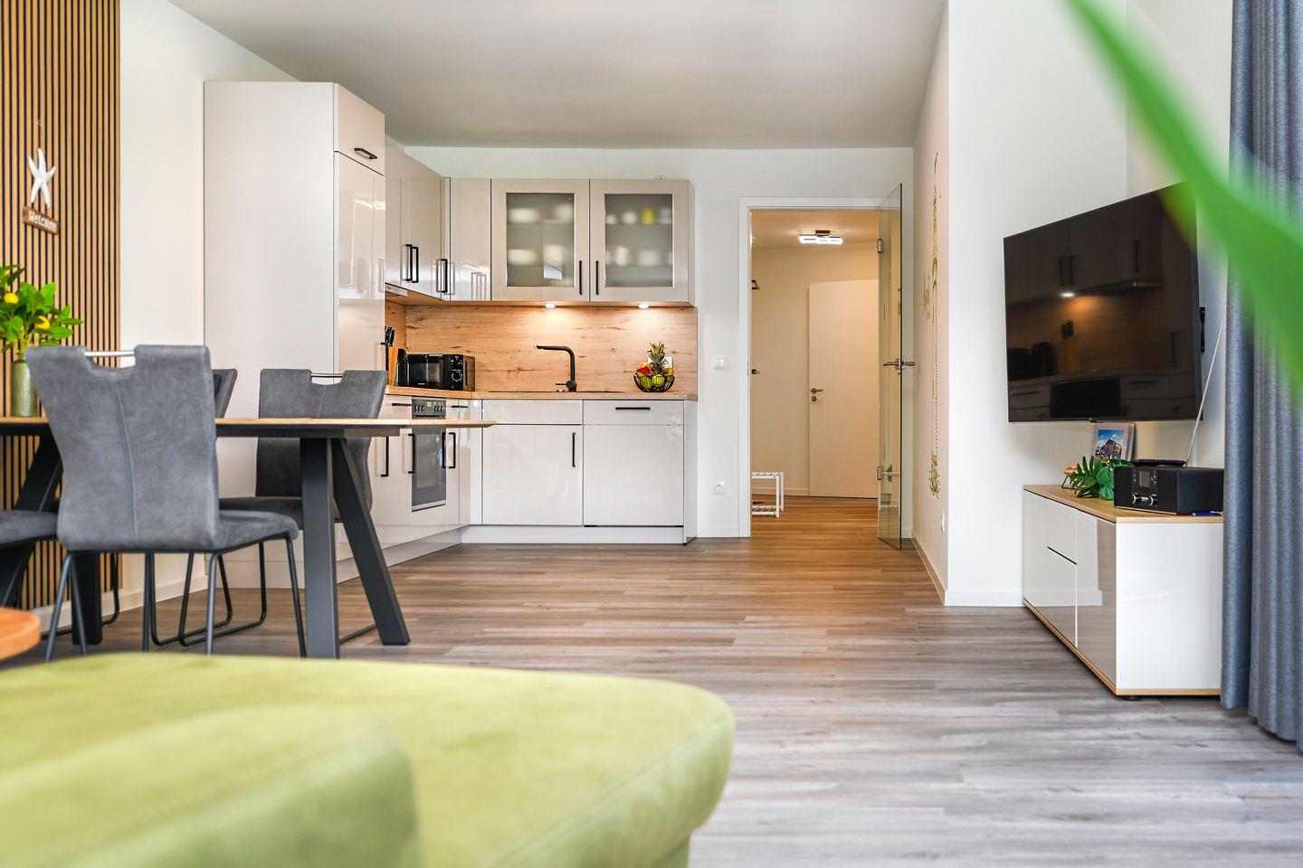 Ein fester Tiefgaragenstellplatz (Durchfahrtshöhe 2,15 m), eine eigene Waschmaschine sowie ein praktischer Abstellraum in der Wohnung stehen dir zur Verfügung. Vor dem Haus findest du eine E-Ladestation für dein Elektroauto. Fahrräder und Sportausrüstung kannst du im abschließbaren Fahrradraum sicher abstellen. Der kontaktlose Check-in per Schlüsseltresor ermöglicht dir maximale Flexibilität bei der Anreise.