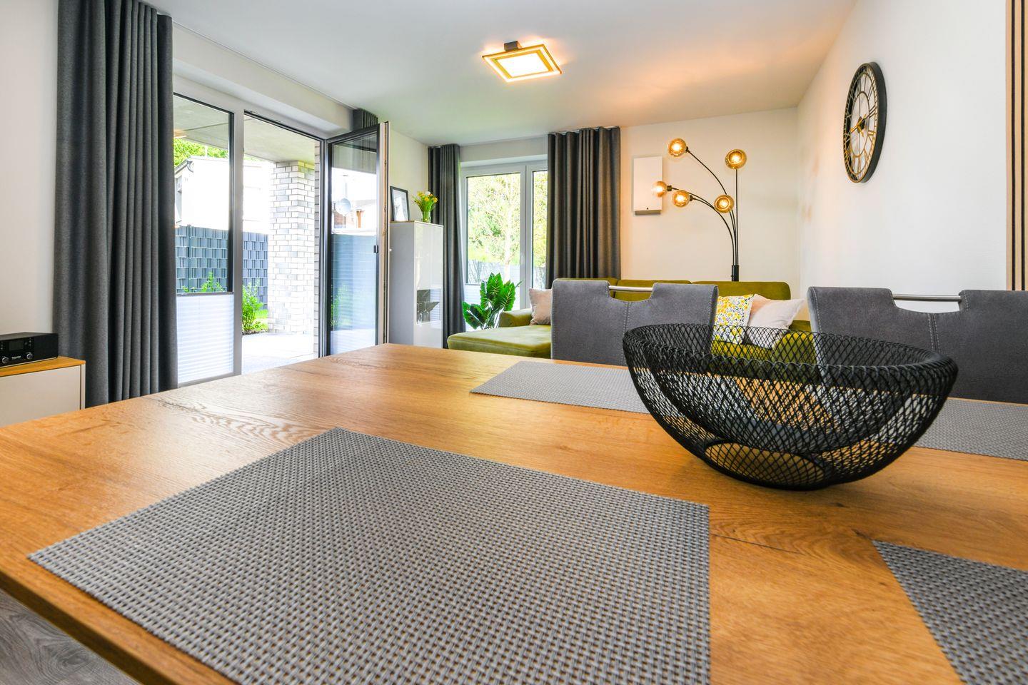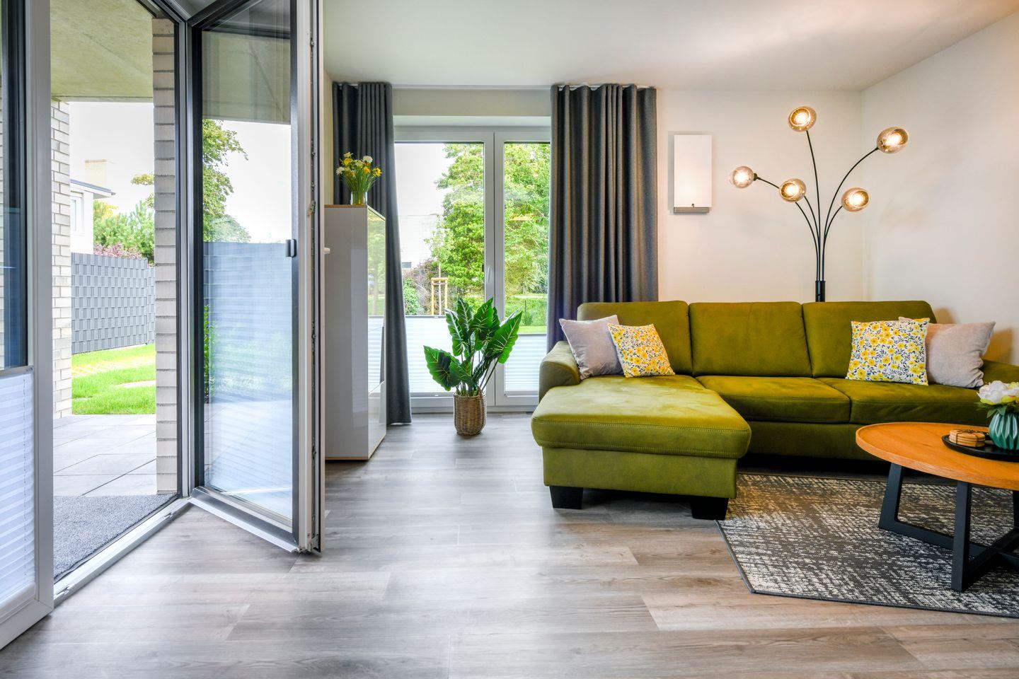 Der lichtdurchflutete Wohnbereich mit großen Fenstern führt direkt auf die überdachte Terrasse – perfekt für ein gemütliches Frühstück im Freien oder entspannte Abende an der frischen Luft. Die offene, voll ausgestattete Küche macht gemeinsames Kochen zum Vergnügen, während die Wohnraumlüftung für ein angenehmes Klima sorgt.