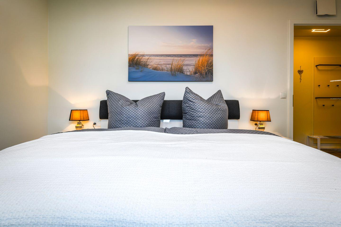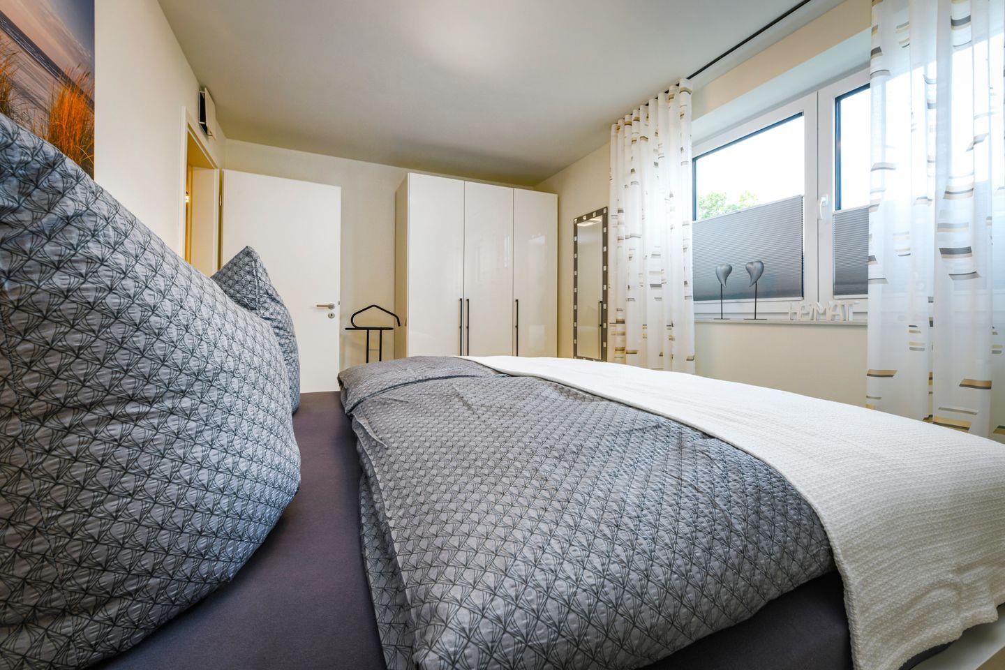 Nur 100 m bis zum Strand: In der charmanten Ferienwohnung SeeEckchen erwarten dich ein gemütliches Schlafzimmer, private Sauna, überdachte Terrasse und ein gemütliches Sofa – ideal für romantische Auszeiten zu jeder Jahreszeit.