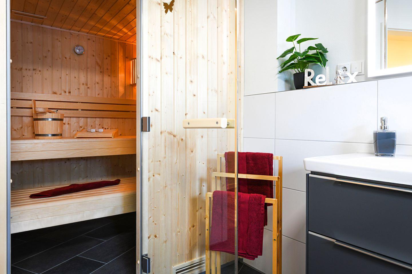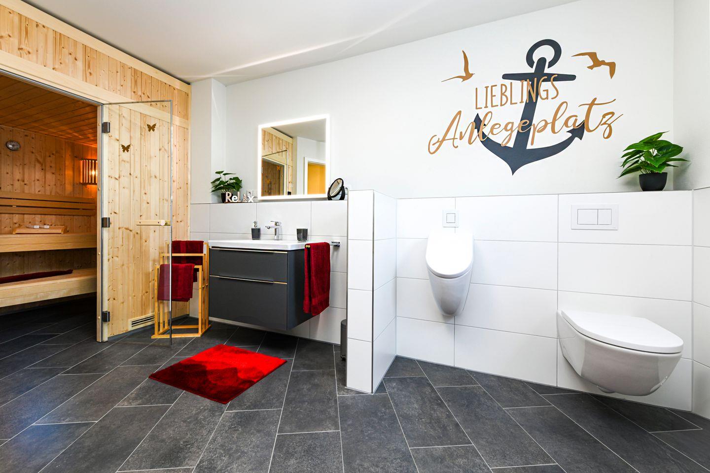 Das moderne Bad mit Tageslicht und ebenerdiger Dusche besticht durch sein stilvolles Design. Highlight ist die private Sauna, in der du nach einem Strandspaziergang wunderbar entspannen kannst.