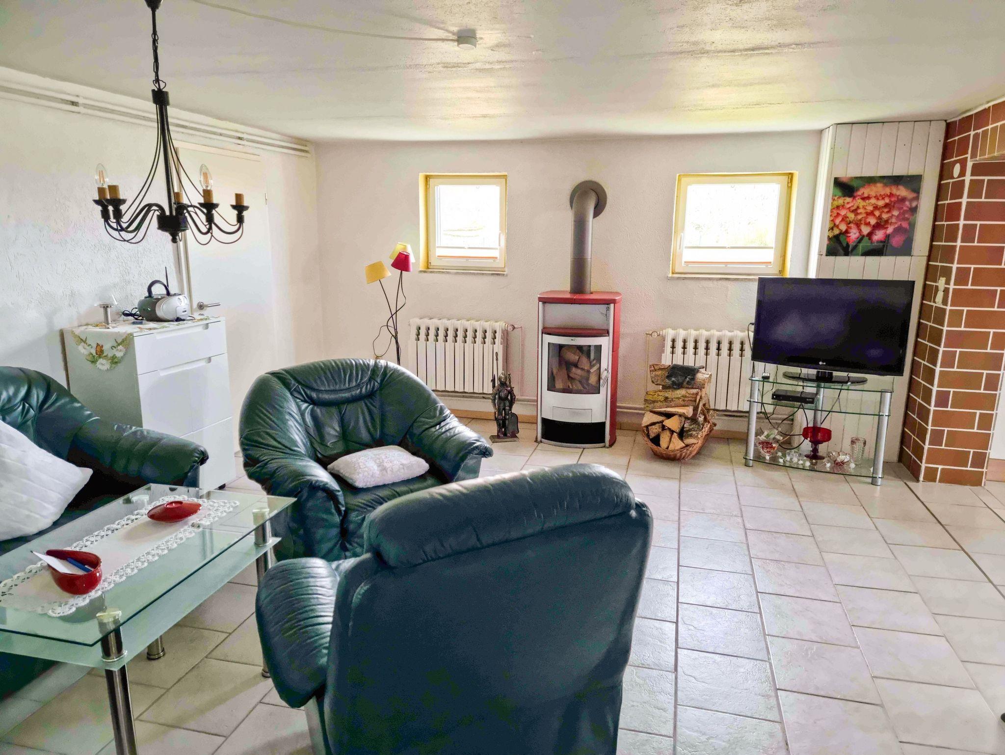 Die 70m²-Ferienwohnung befindet sich im Souterrain. Sie ist aufgeteilt in Bad, Schlafzimmer für 2-3 Personen (Doppelbett + Schlafcouch) und Wohnzimmer mit Kamin und integrierter Küche mit Gasherd. Im Wohnzimmer sind 2 Aufbettungen auf der Schlafcouch möglich. Ein selbst mitgebrachtes Baby-Reisebett kann im Schlafzimmer aufgestellt werden. Das Bad ist ausgestattet mit Dusche, WC und Waschmaschine (gegen Gebühr).