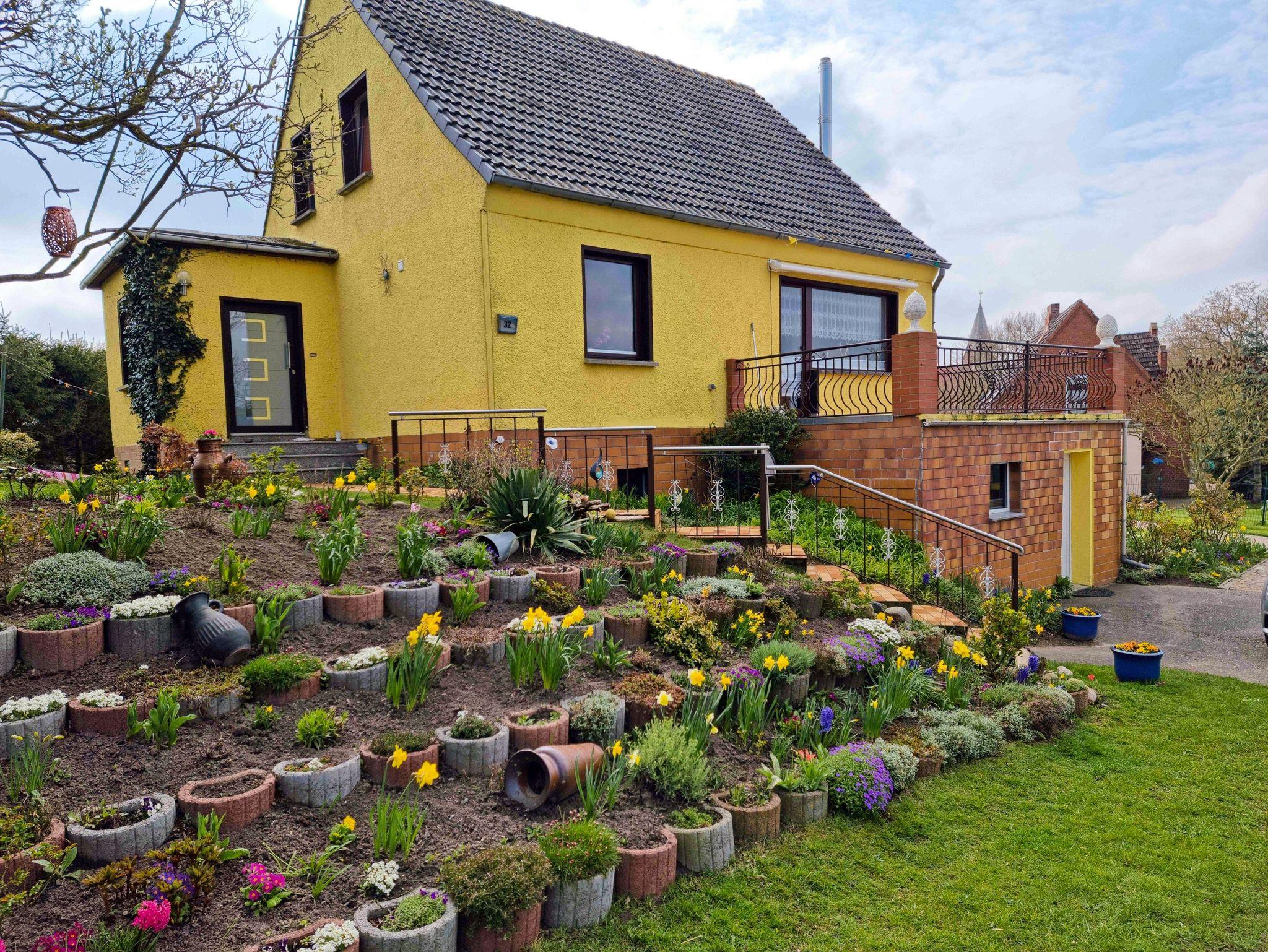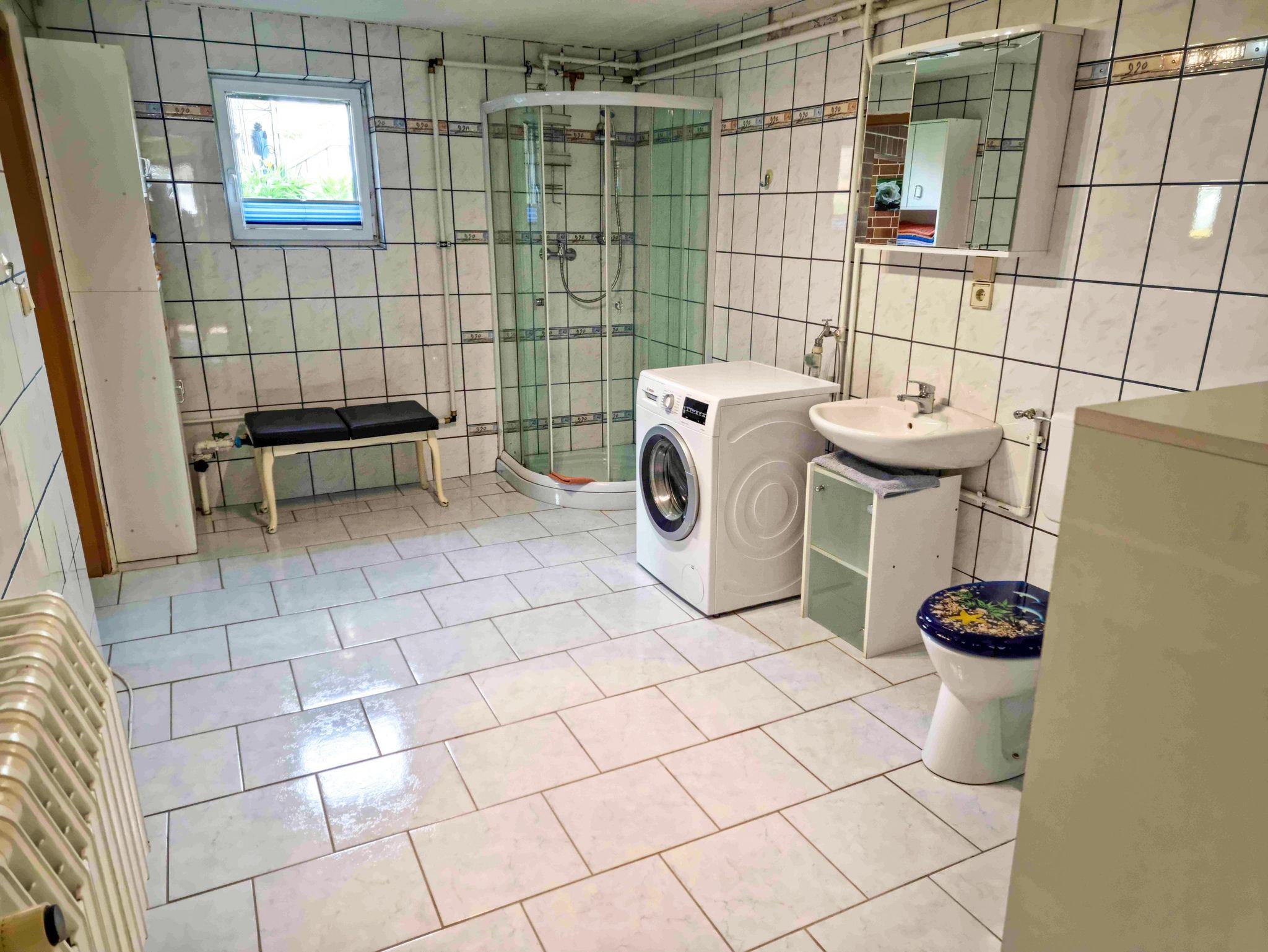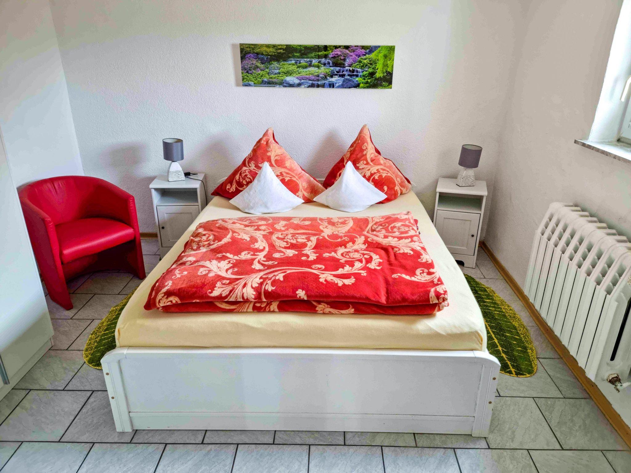 Die 70m²-Ferienwohnung befindet sich im Souterrain. Sie ist aufgeteilt in Bad, Schlafzimmer für 2-3 Personen (Doppelbett + Schlafcouch) und Wohnzimmer mit integrierter Küche mit Gasherd. Im Wohnzimmer sind 2 Aufbettungen auf der Schlafcouch möglich. Ein selbst mitgebrachtes Baby-Reisebett kann im Schlafzimmer aufgestellt werden.