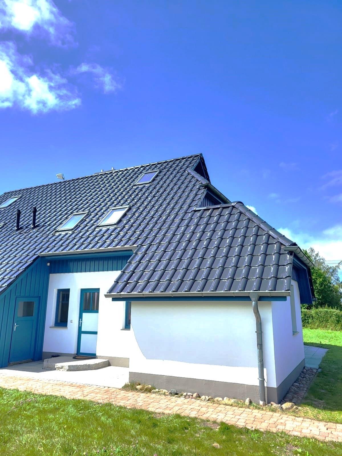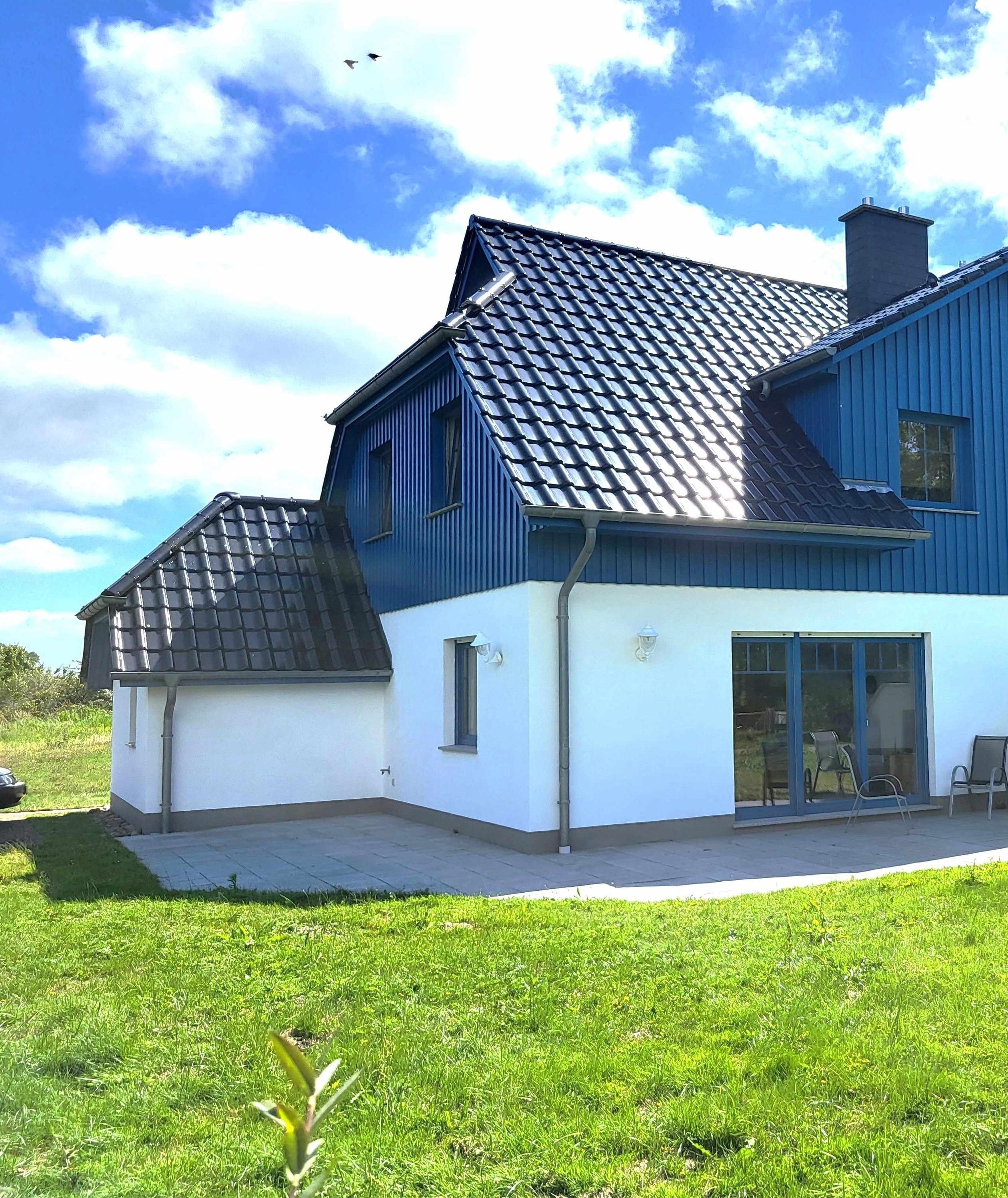Von der über 40 m² großen Terrasse (mit Tisch, Stühlen, Rollliege) hat man einen sehr schönen Weitblick über Wiesen und Felder. Die malerische Bucht Grabow an der Ostsee ist vom Haus sichtbar. Bei klarem Wetter sieht man die Insel Hiddensee.
