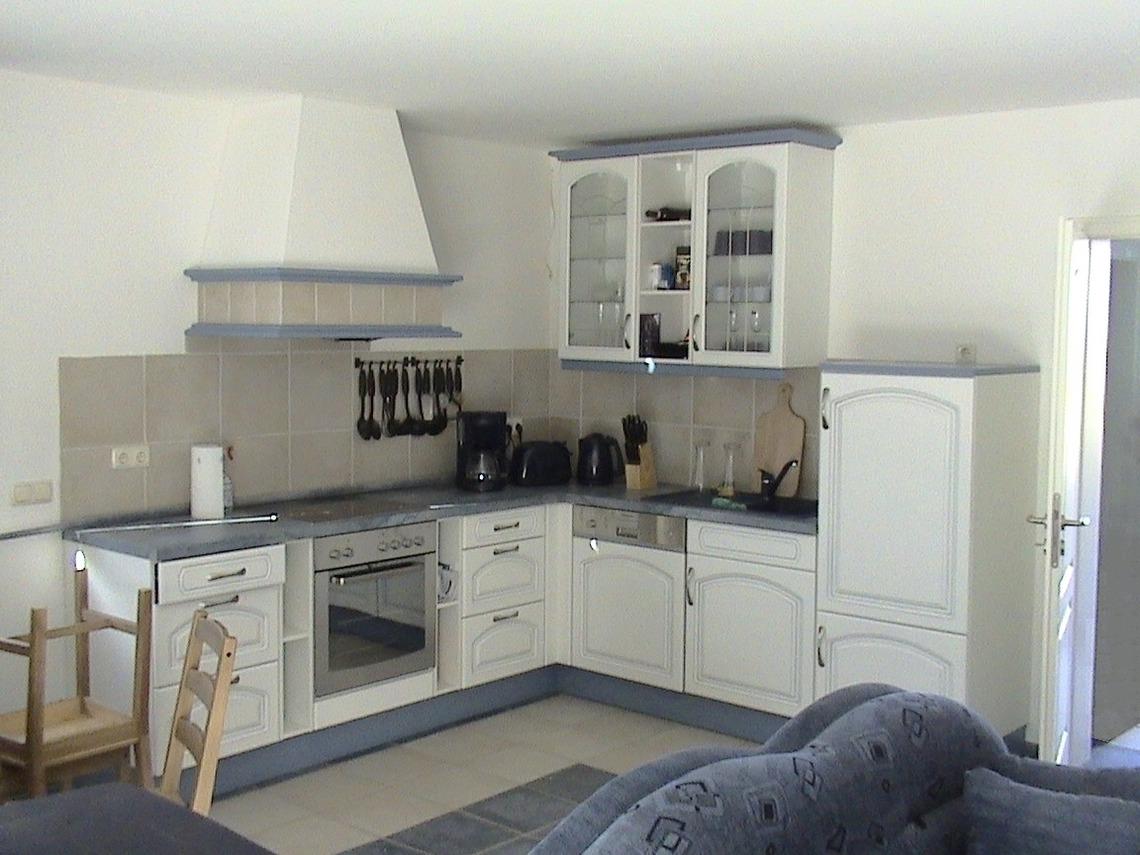 Koch/Essbereich 8 m², mit geschmackvoller Landhausküche, Geschirrspüler, Kühlschrank, Backofen, Kaffeemaschine, Toaster, Wasserkocher, Geschirr für 8 Personen