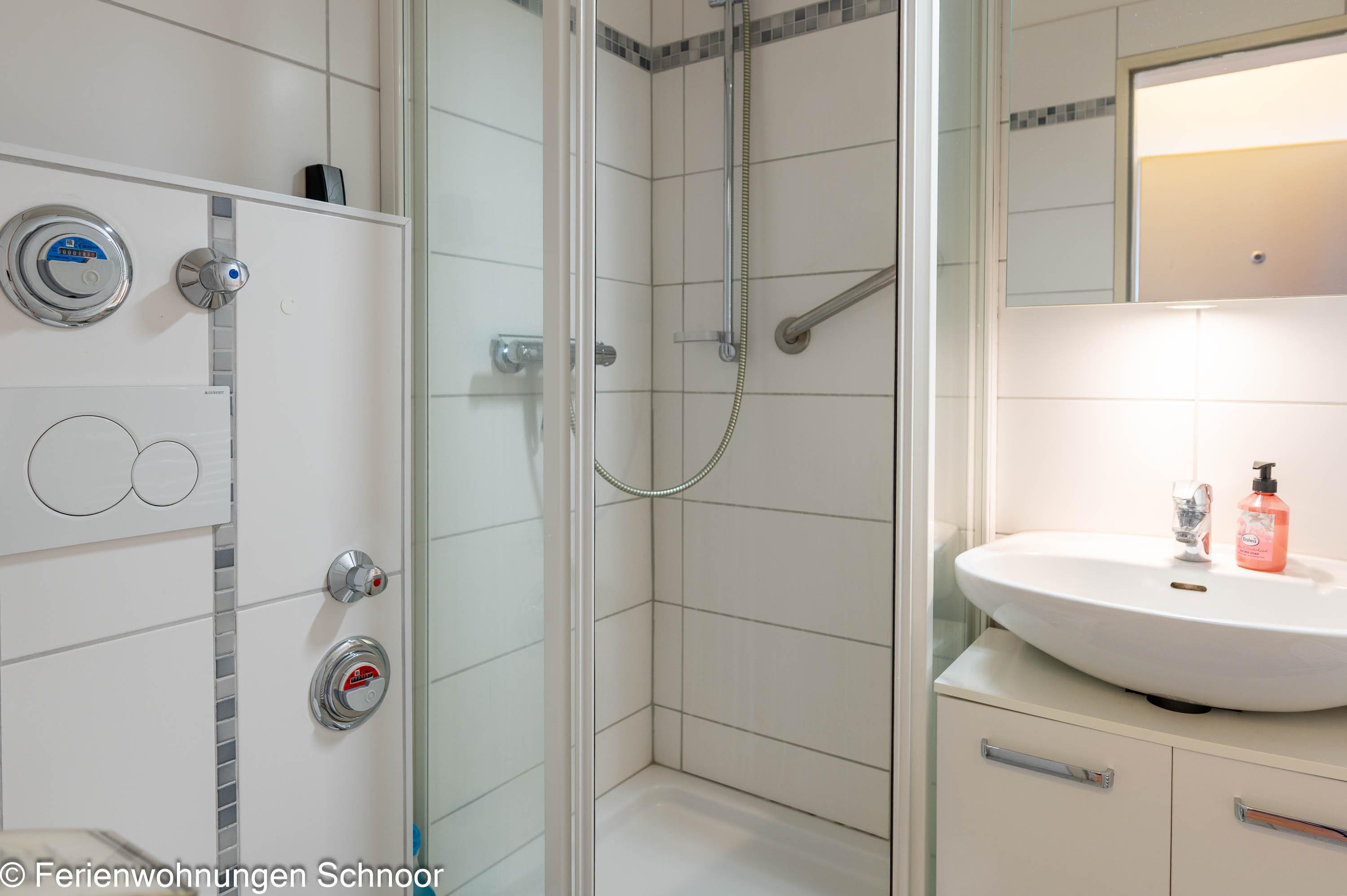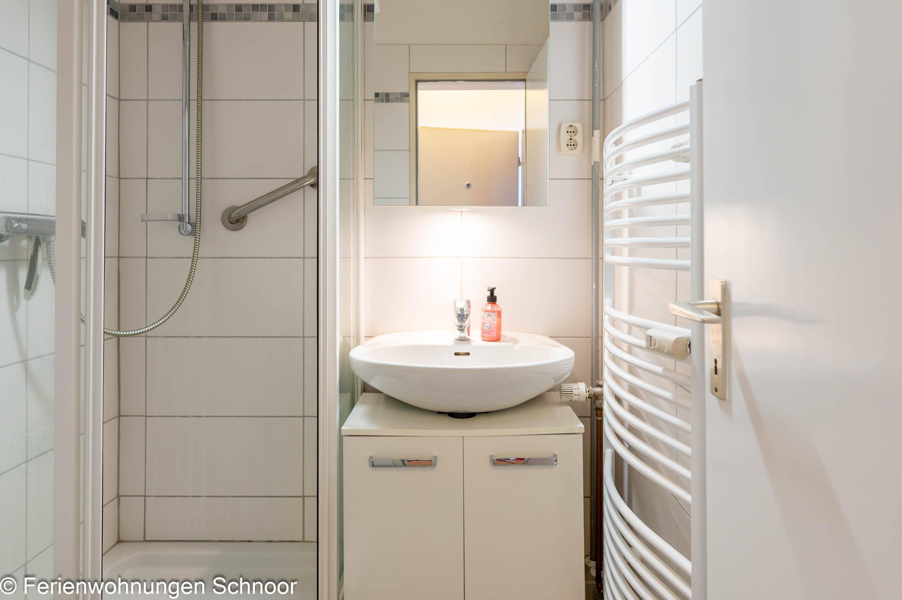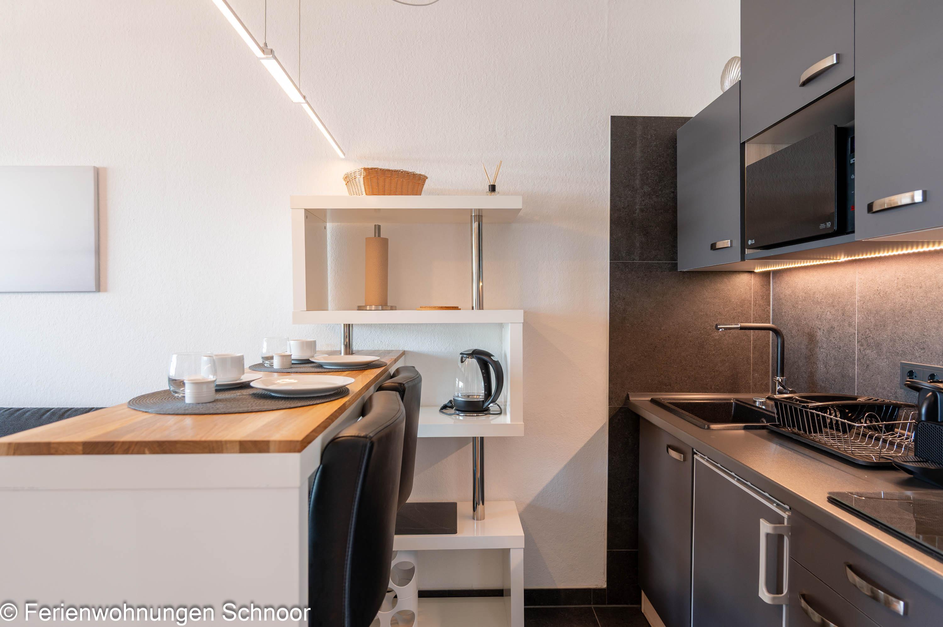 In der zum Wohn- und Essbereich angrenzenden Küchenzeile, ausgestattet für den täglichen Bedarf, stehen ein Kühlschrank als auch ein Ceranfeld für Sie zur Verfügung. Das innenliegende Badezimmer besticht durch seine helle Optik. Neben einem WC ist auch ein Waschbecken vorhanden, dessen Unterschrank ausreichend Stauraum bietet. Die Dusche sorgt für einen bequemen Zugang und die Trennwände für uneingeschränktes Duschvergnügen.