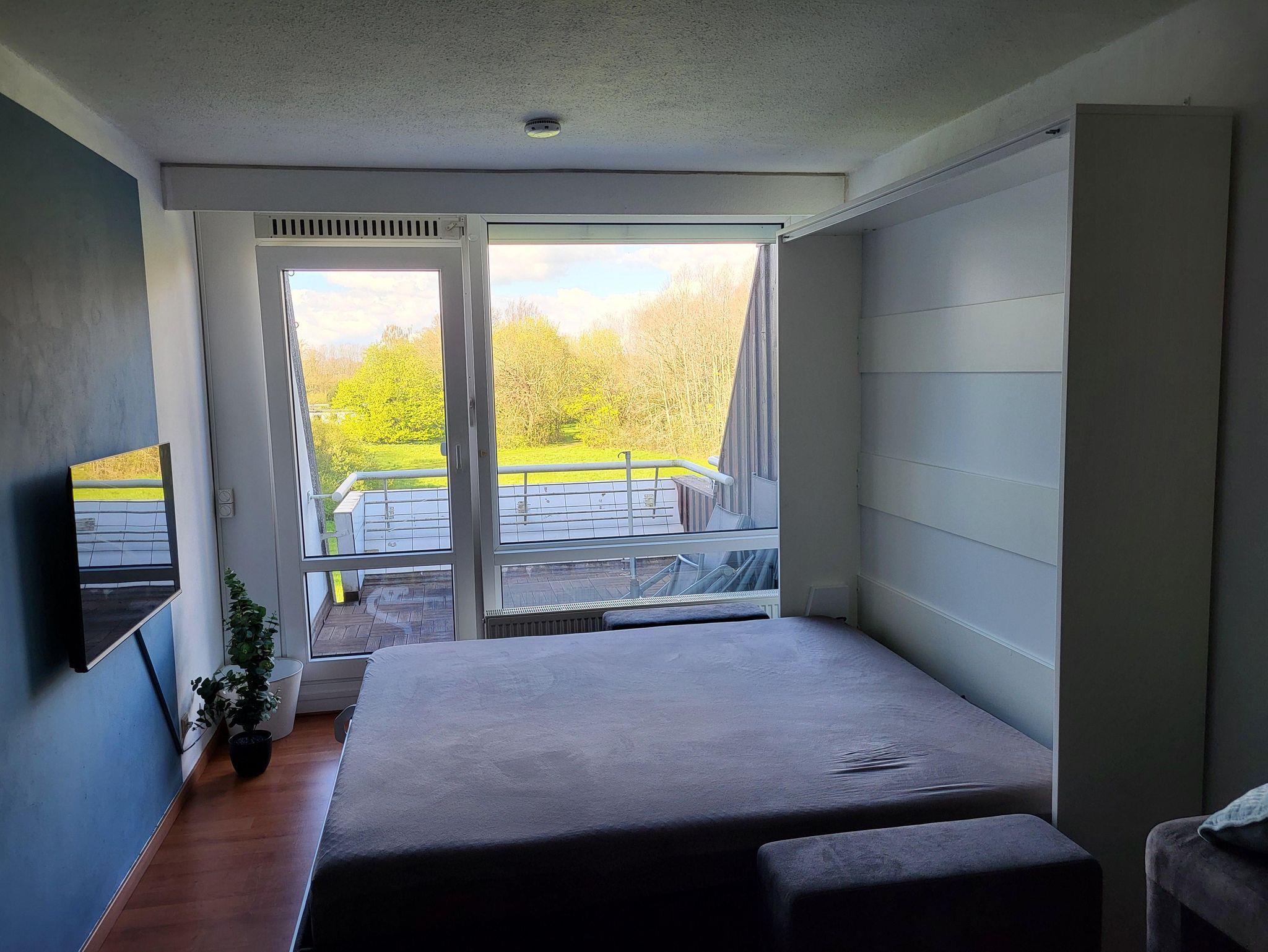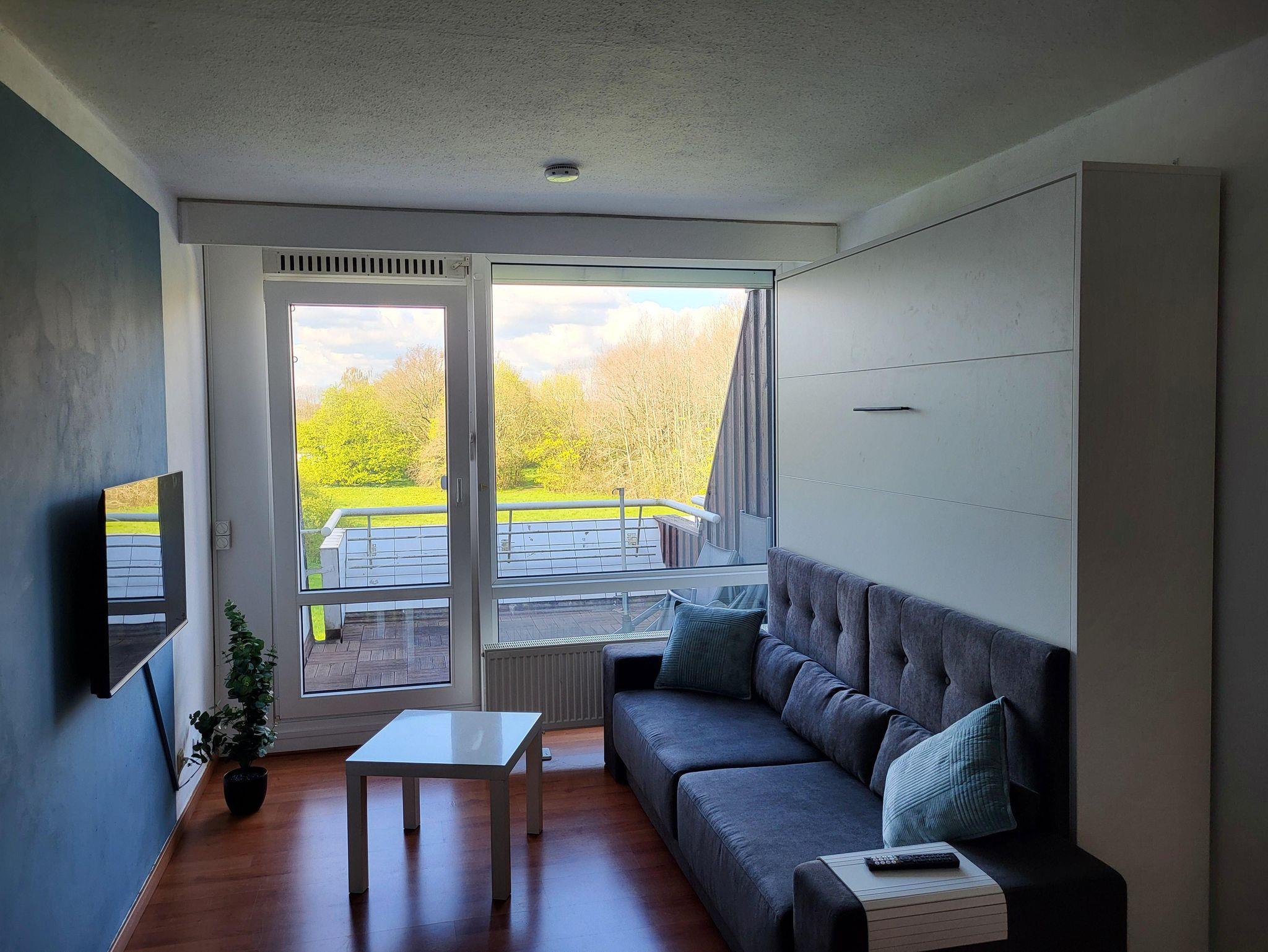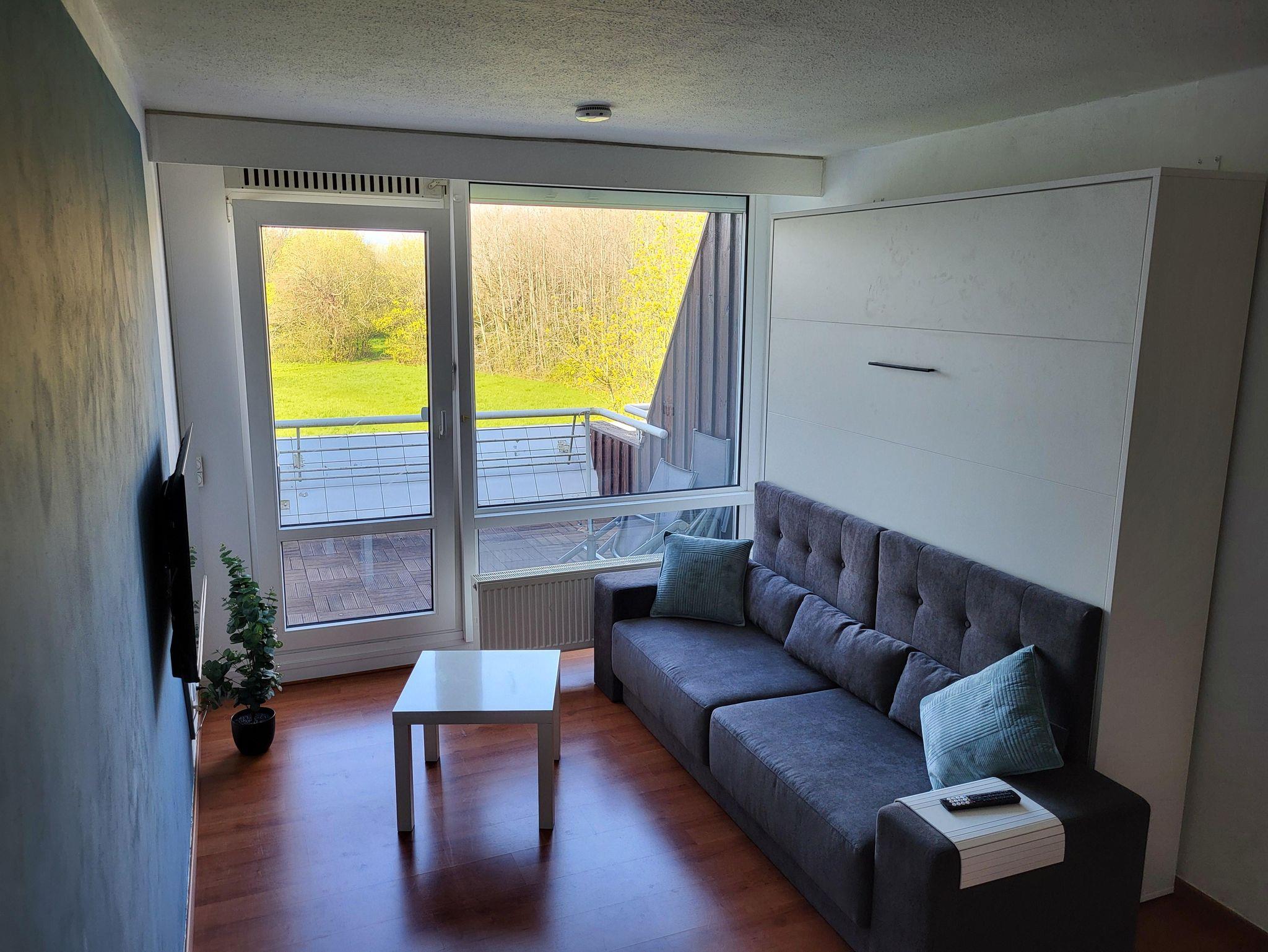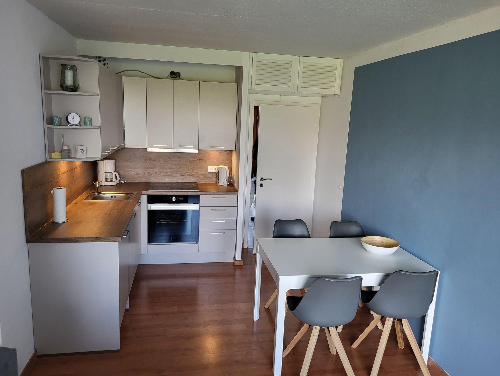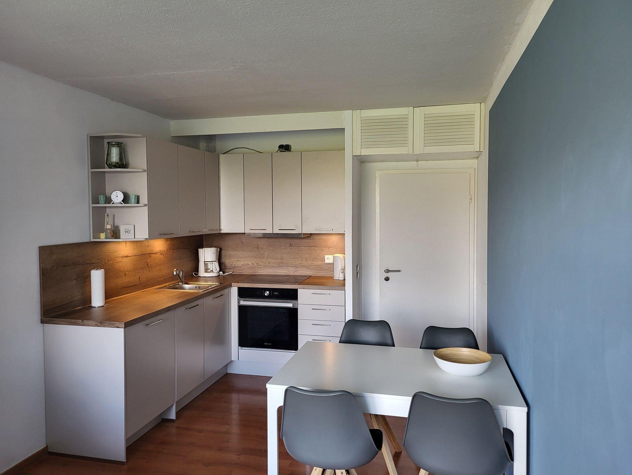 Das 1-Zimmer Nichtraucherapartment ist für 2 Personen geeignet und wurde im Frühjahr 2024 renoviert. Die Gesamtfläche von 33 m² enthält einen Wohn-/Schlafbereich mit voll ausgestatteter Küchenzeile (Induktionskochfeld, Backofen, Kühlschrank inkl. einem kleinen Gefrierfach und einer Spülmaschine), einem Duschbad und einem Flur mit geräumigem Wandschrank. Der Wohnraum verfügt über ein Schrankbett mit Federkernmatratze und integrierter Couch.