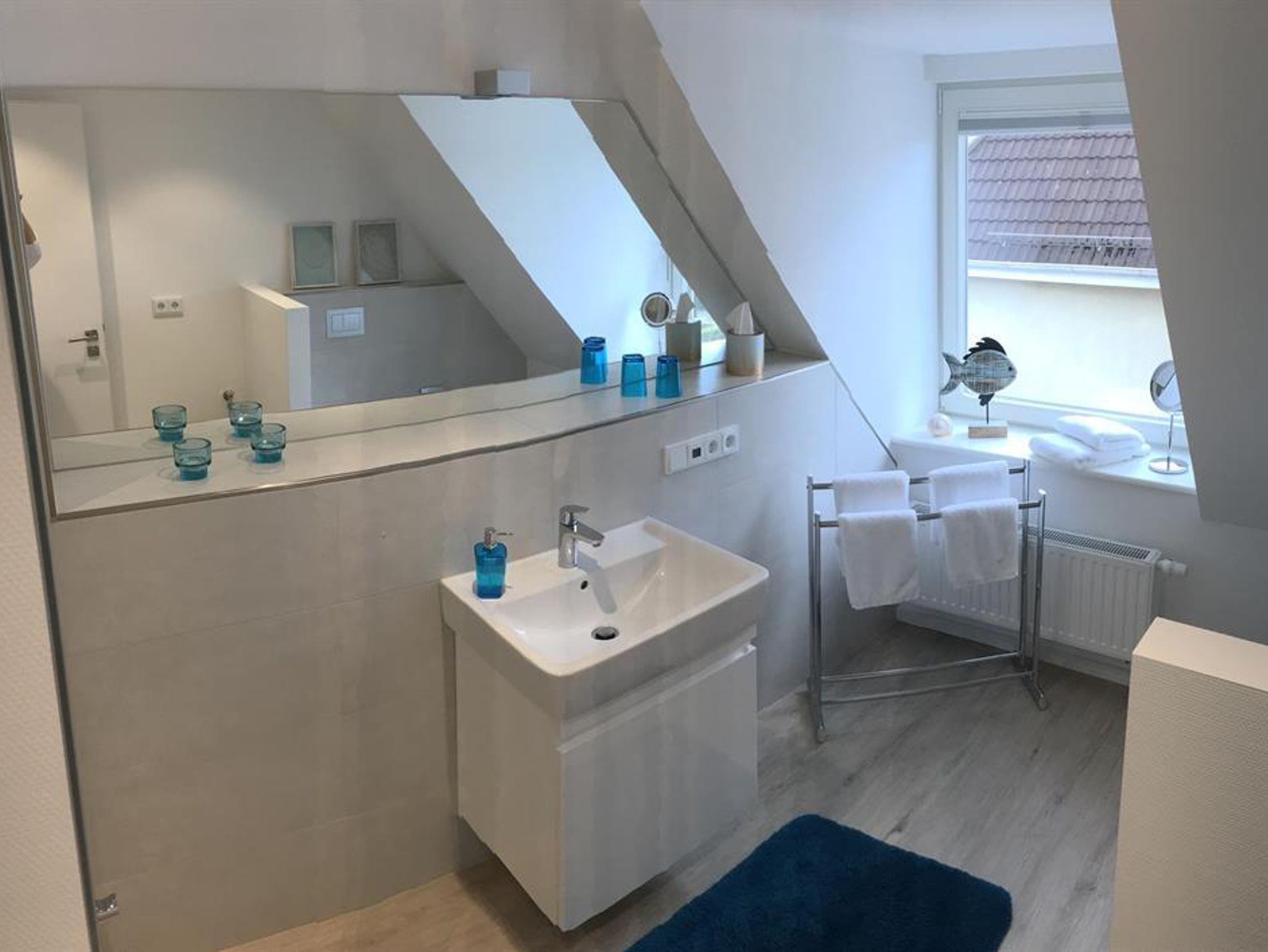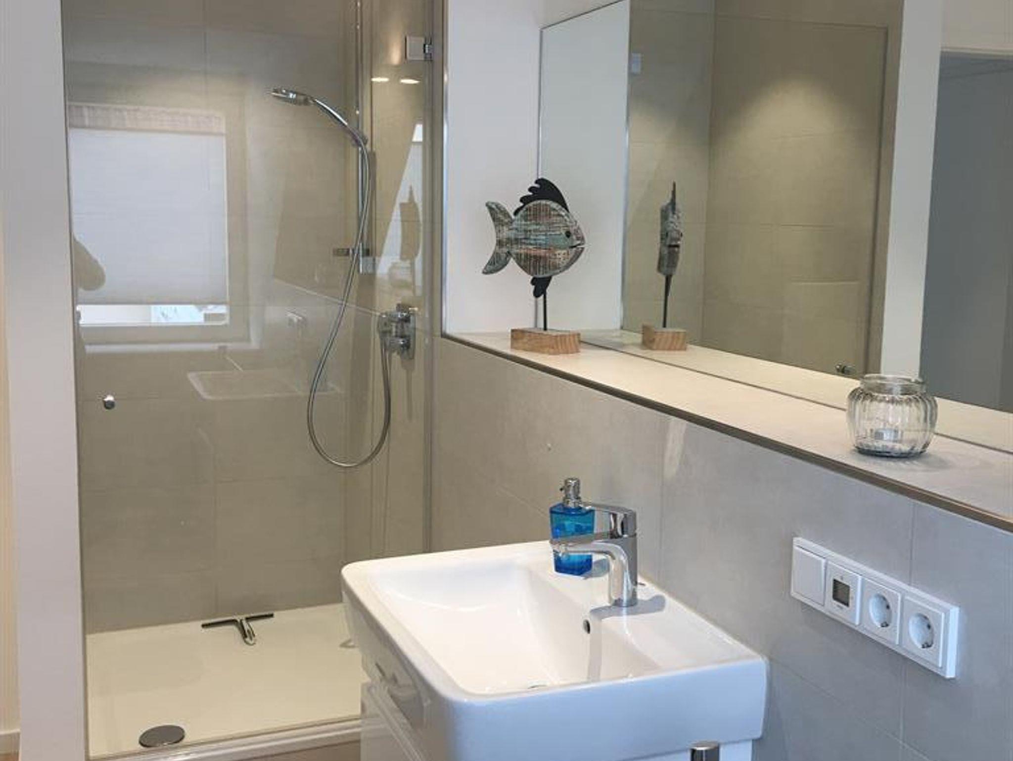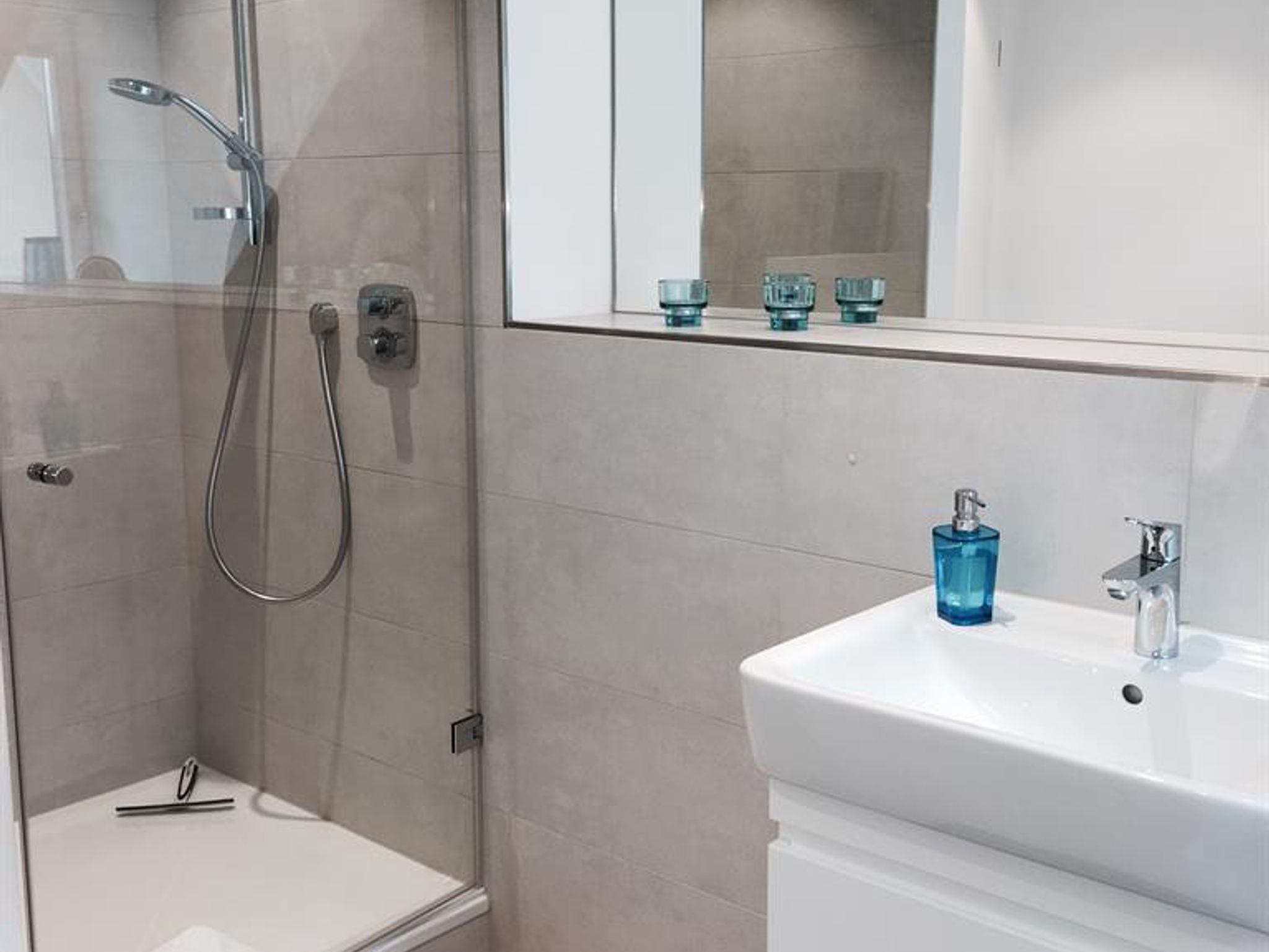 Das großzügige Bad ist mit einer leicht begehbaren und geräumigen Dusche ausgestattet.