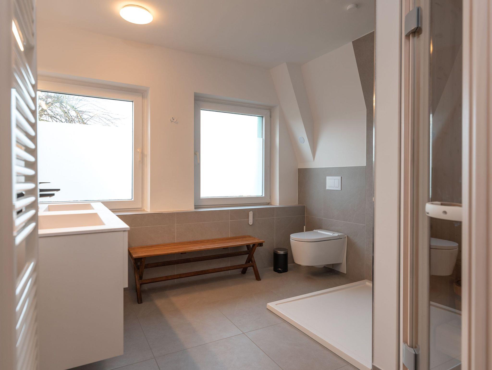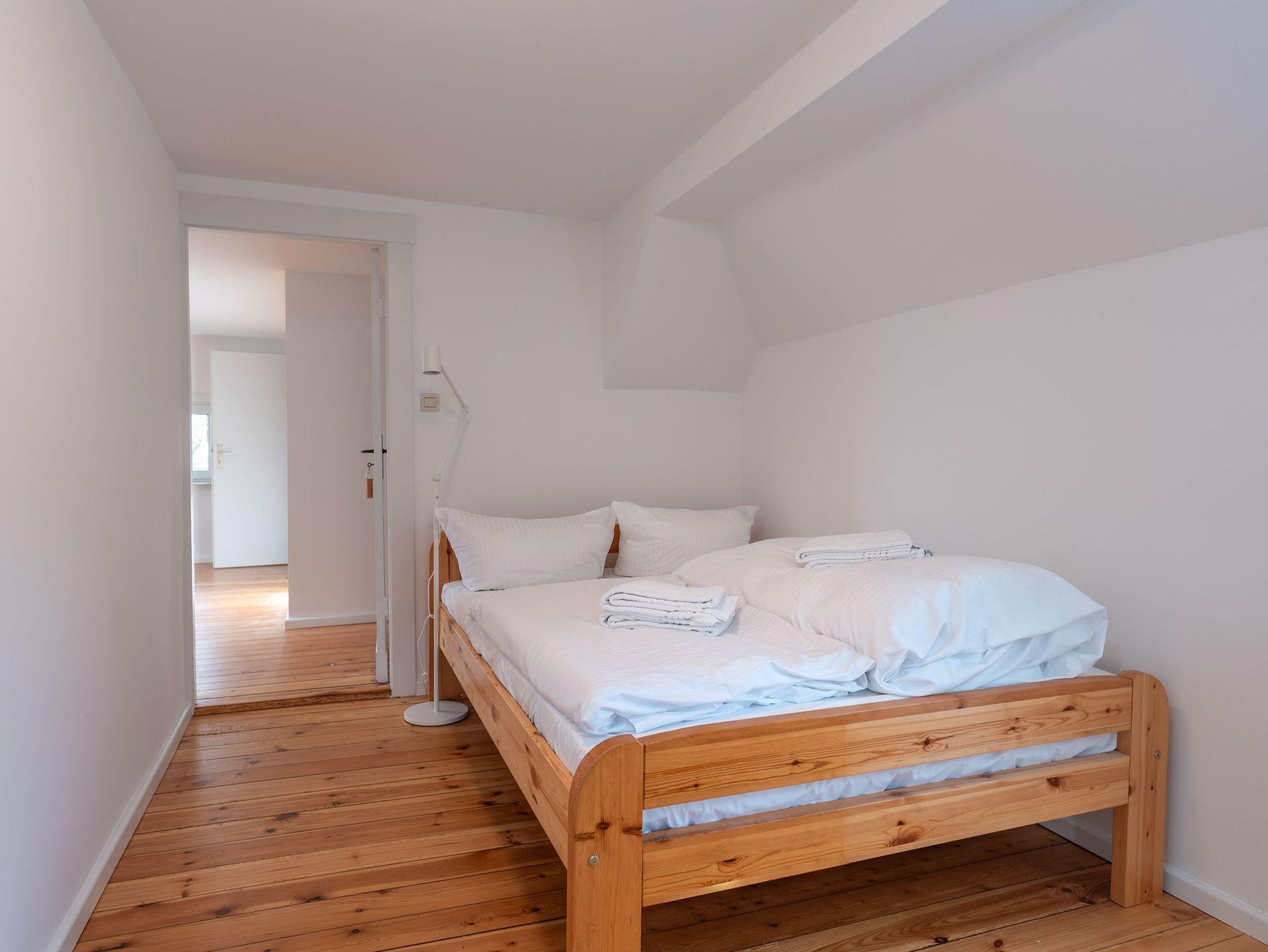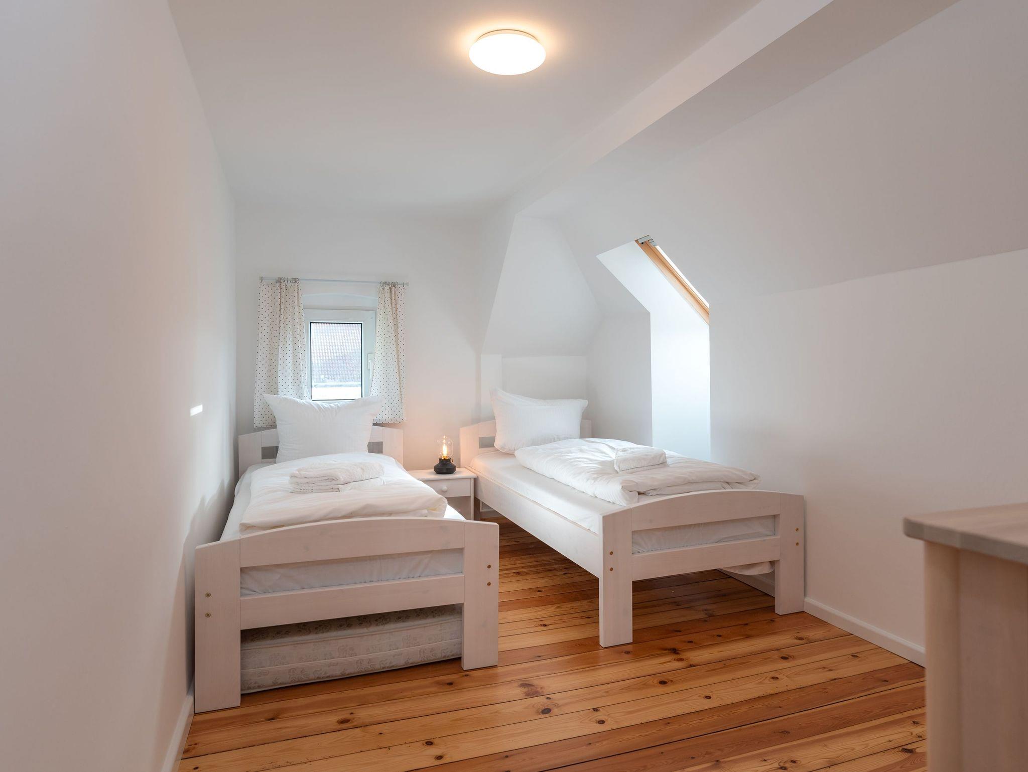 Die obere Etage hält einen Aufenthaltsraum bereit, ein Schlafzimmer mit einem Doppelbett (1,40m) sowie ein Schlafzimmer mit zwei Einzelbetten, ergänzt durch ein zusätzliches Gäste-WC, was die räumliche Flexibilität des Hauses unterstreicht.