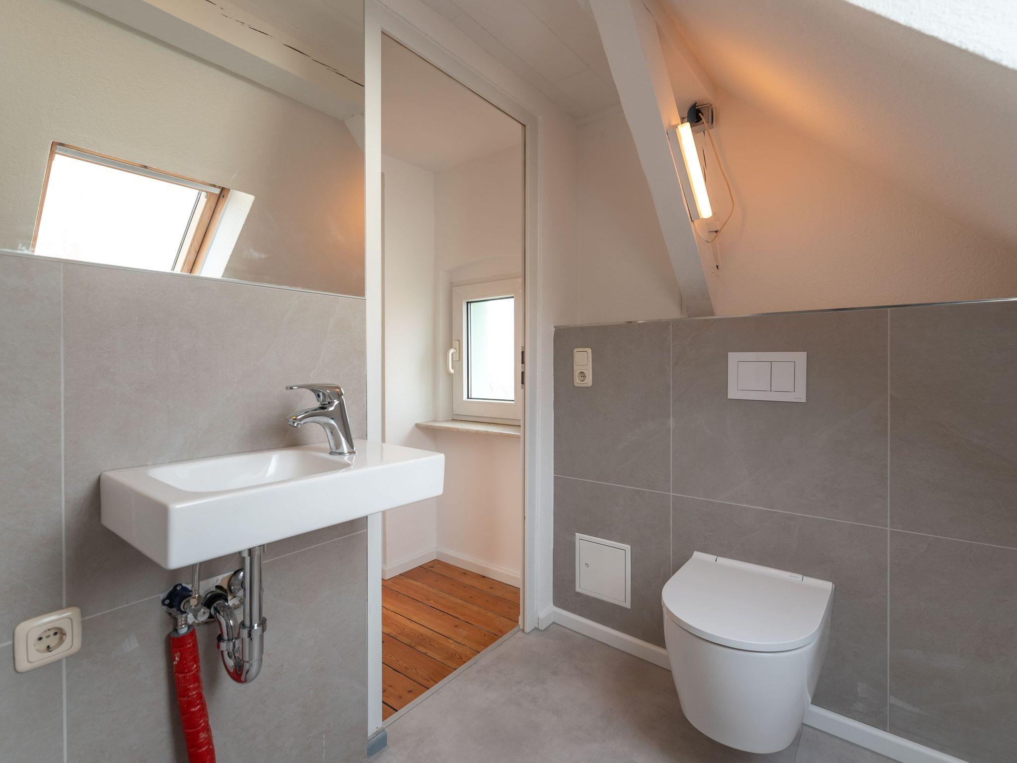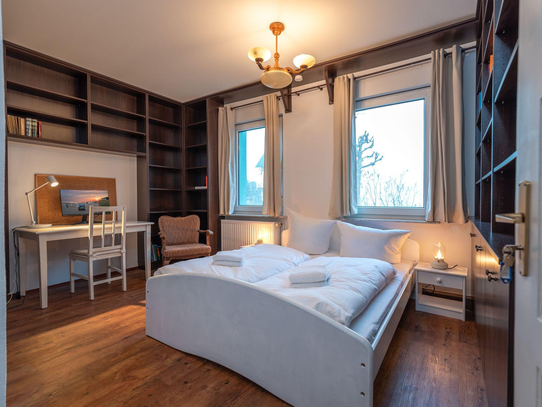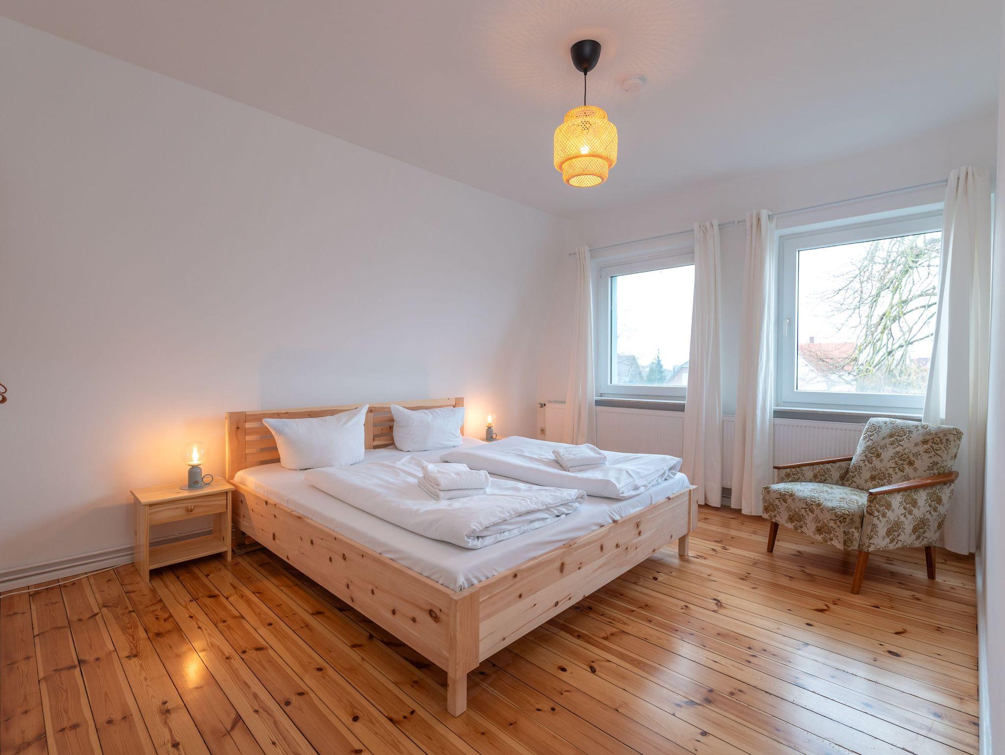 Die obere Etage hält einen Aufenthaltsraum bereit, ein Schlafzimmer mit einem Doppelbett (1,40m) sowie ein Schlafzimmer mit zwei Einzelbetten, ergänzt durch ein zusätzliches Gäste-WC, was die räumliche Flexibilität des Hauses unterstreicht.