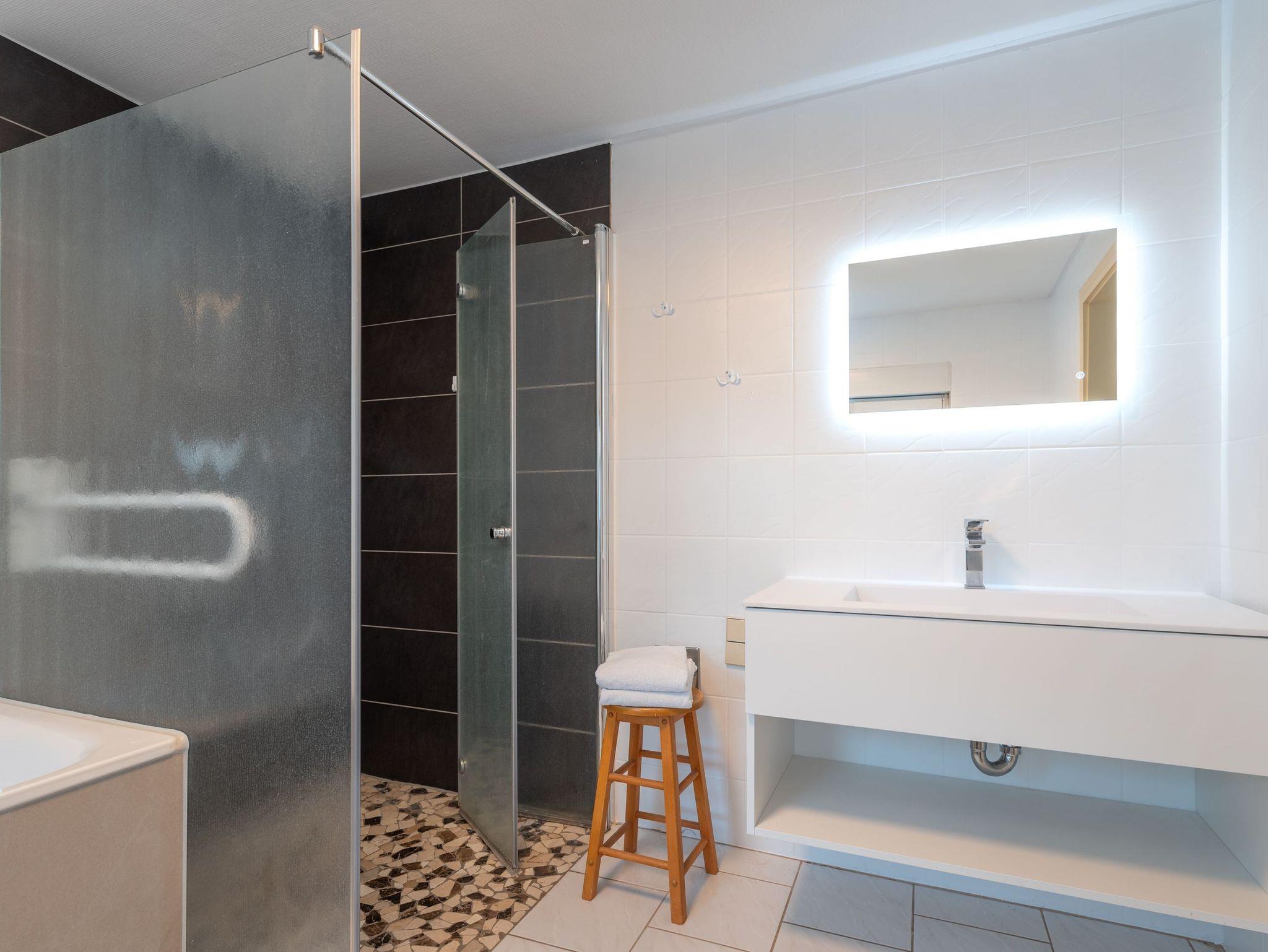 Auf der mittleren Etage befinden sich drei weitere Schlafzimmer, jedes mit einem Doppelbett und ausreichend Stauraum für die Urlaubsgarderobe. Ein weiteres Badezimmer, ausgestattet mit einer Dusche, einem WC und der wohltuenden Sauna, bietet Raum für Erholung und Entspannung.