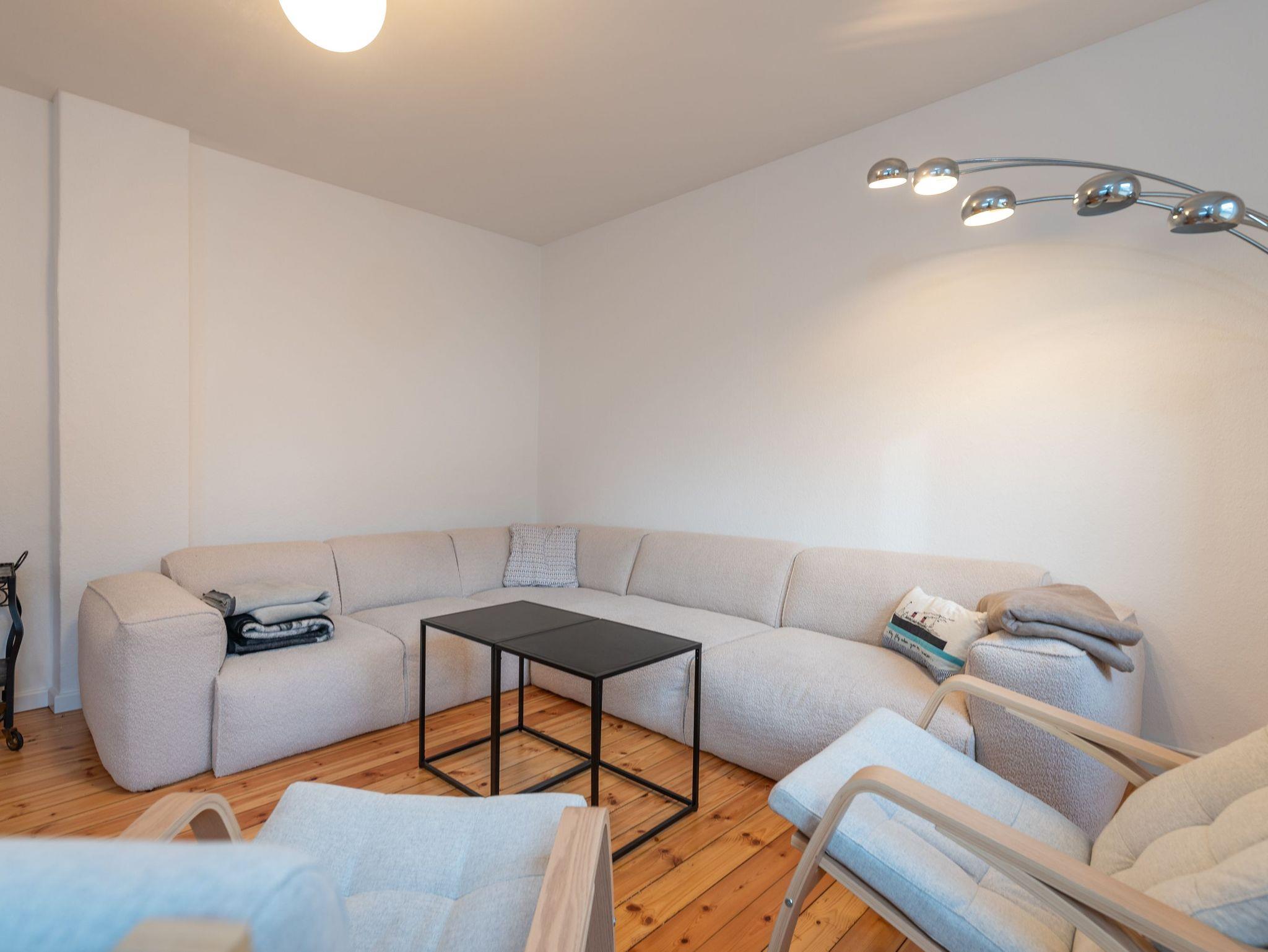 • großes Wohnzimmer mit Couch, Sesseln und Smart-TV