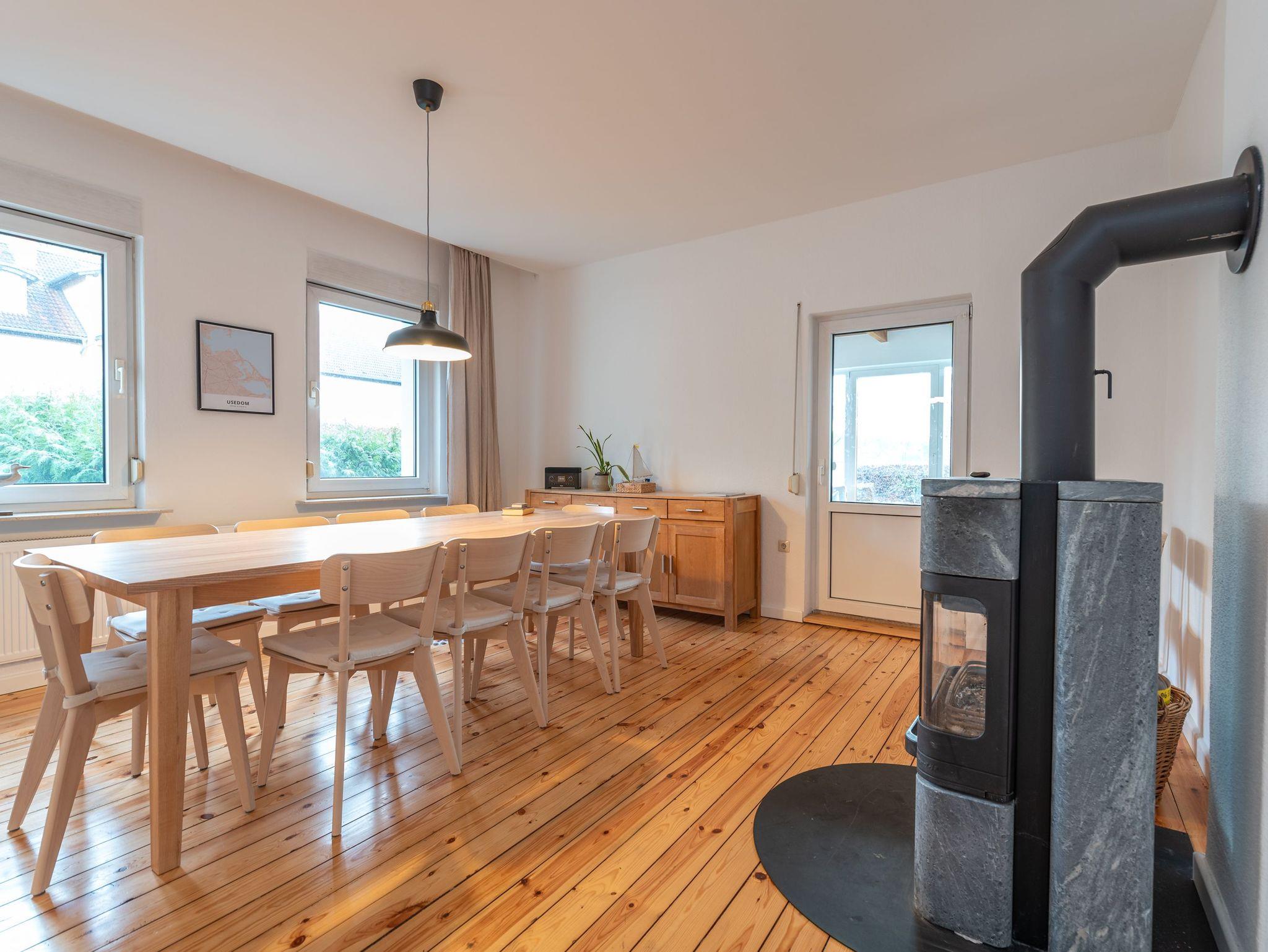 • Esszimmer mit großem Tisch für 12 Personen und Kamin