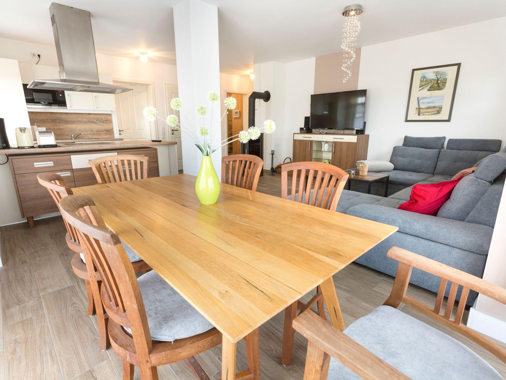 Im großzügigen Wohnbereich erwarten Sie eine gemütliche Wohnlandschaft, Kamin, Smart-TV, eine offen gestaltete Küche sowie ein großer Esstisch. Die Küche ist umfangreich ausgestattet mit Kühlschrank, Gefrierschrank, Ceran-Kochfeld, Backofen, Spülmaschine, Mikrowelle, Kaffeemaschine, Wasserkocher, Toaster und alle den kleinen Dingen des täglichen Bedarfs.