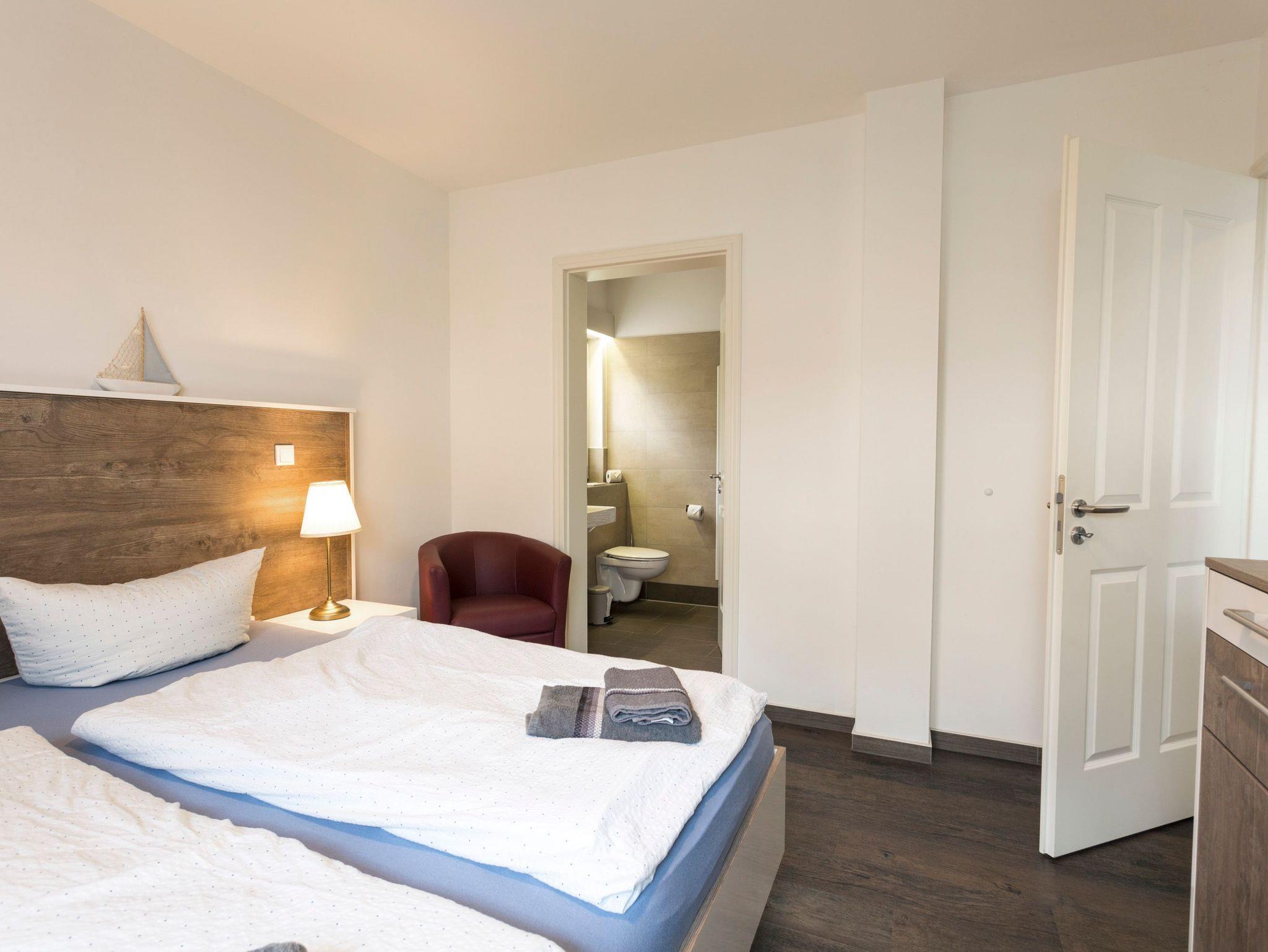 Die beiden Schlafzimmer sind mit Doppelbett (180x200; getrennte Matratzen, einzeln stellbar), Smart-TV, Kleiderschrank und Sessel ausgestattet. Die Fenster sind mit elektrischen Außenjalousien verdunkelbar und mit Insektenschutz versehen.