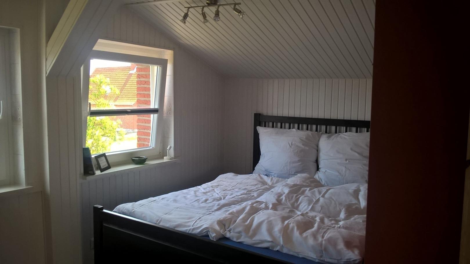 Das Doppelbett im Elternschlafzimmer (im 1. Stock) misst 160 x 200 cm. Im begehbaren Kleiderschrank mit Kleiderstange und Regalböden lassen sich bequem Kleidung, Taschen und Koffer verstauen.