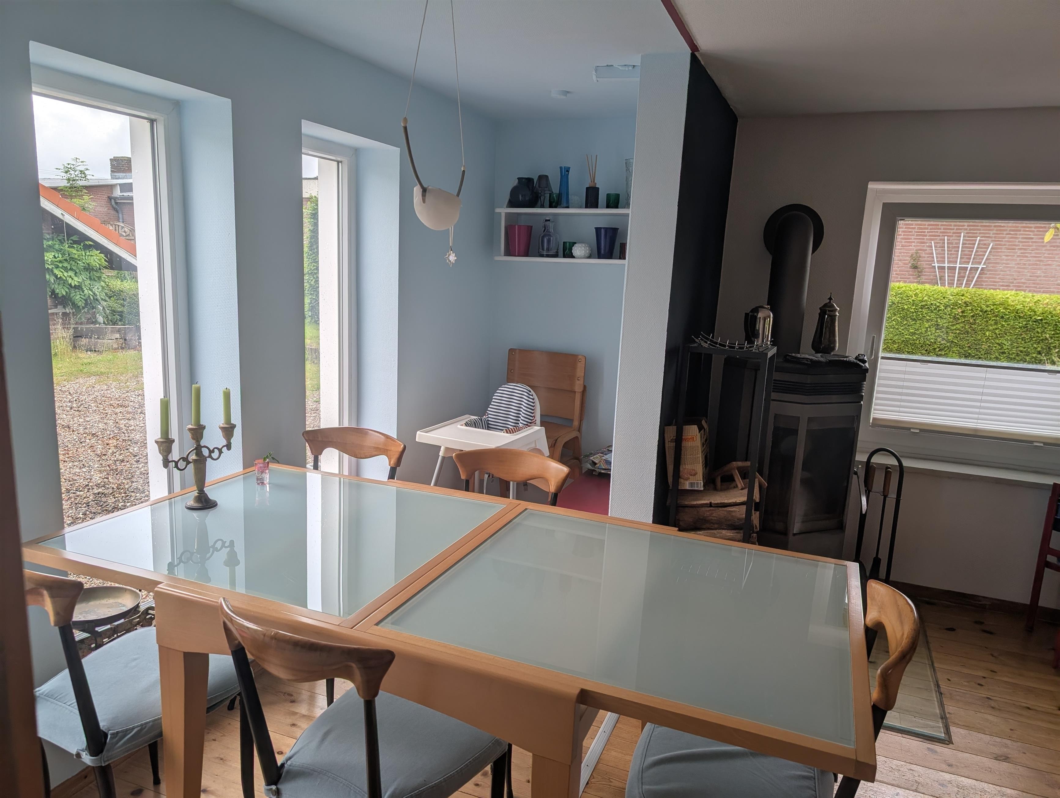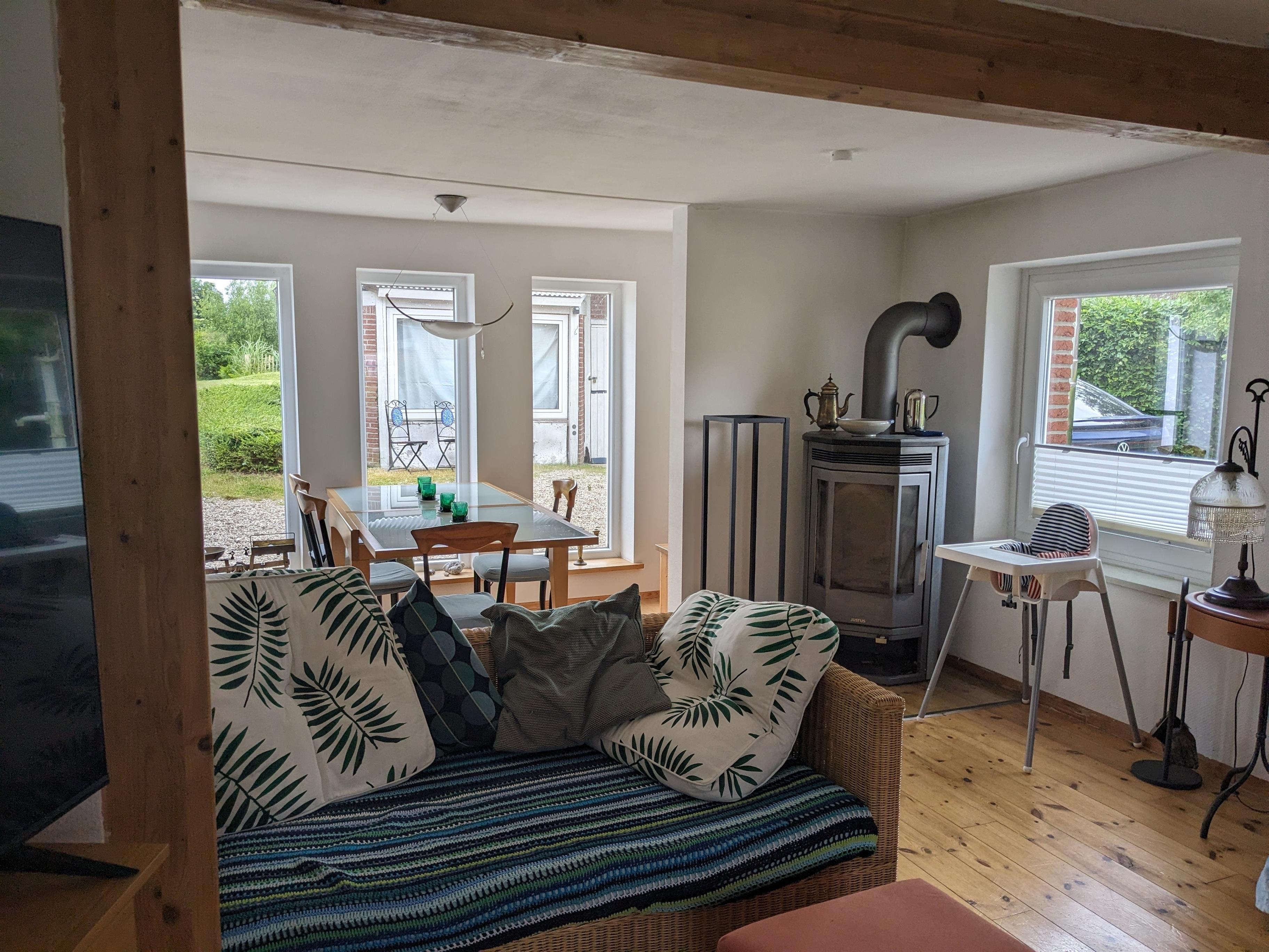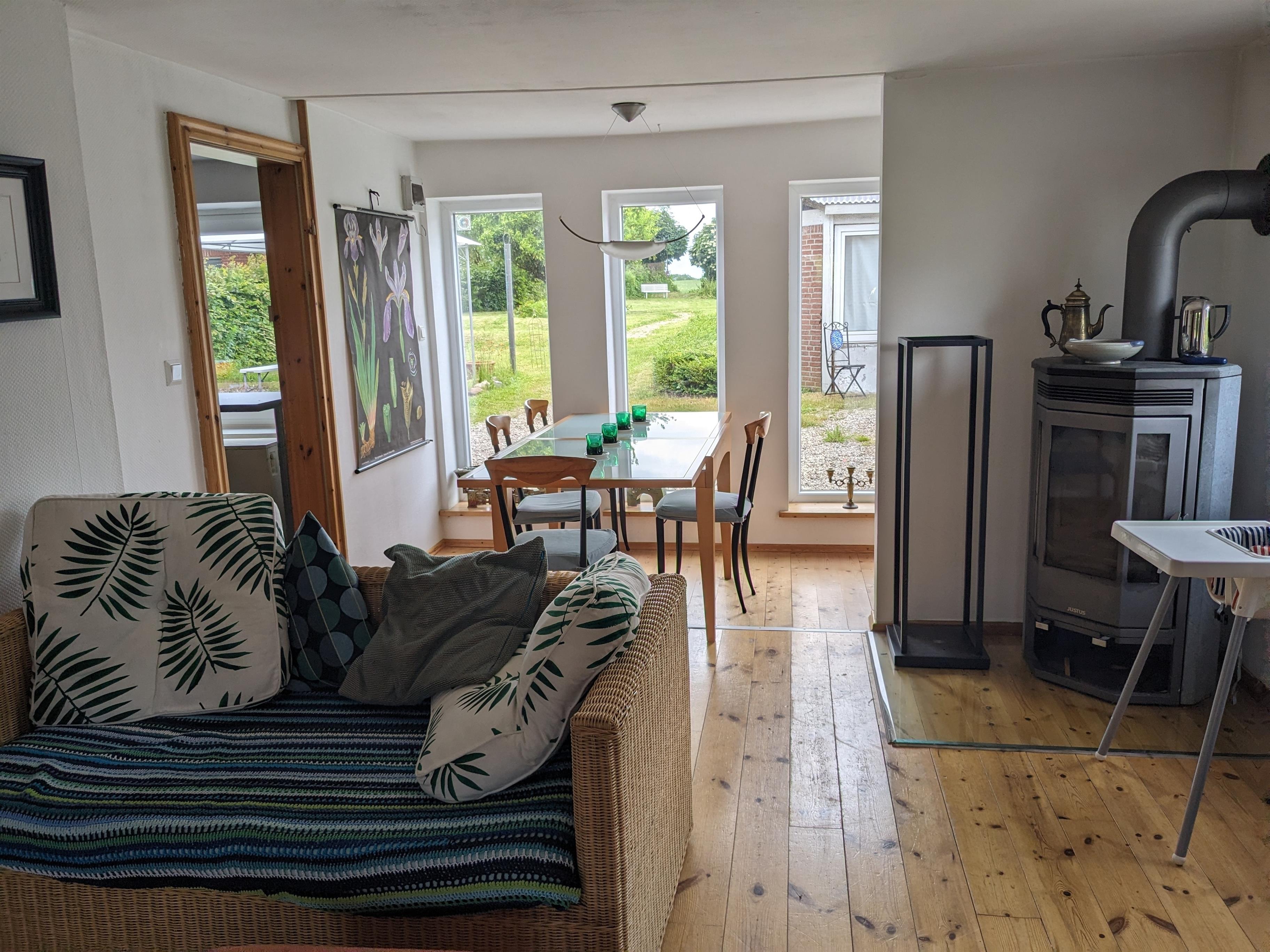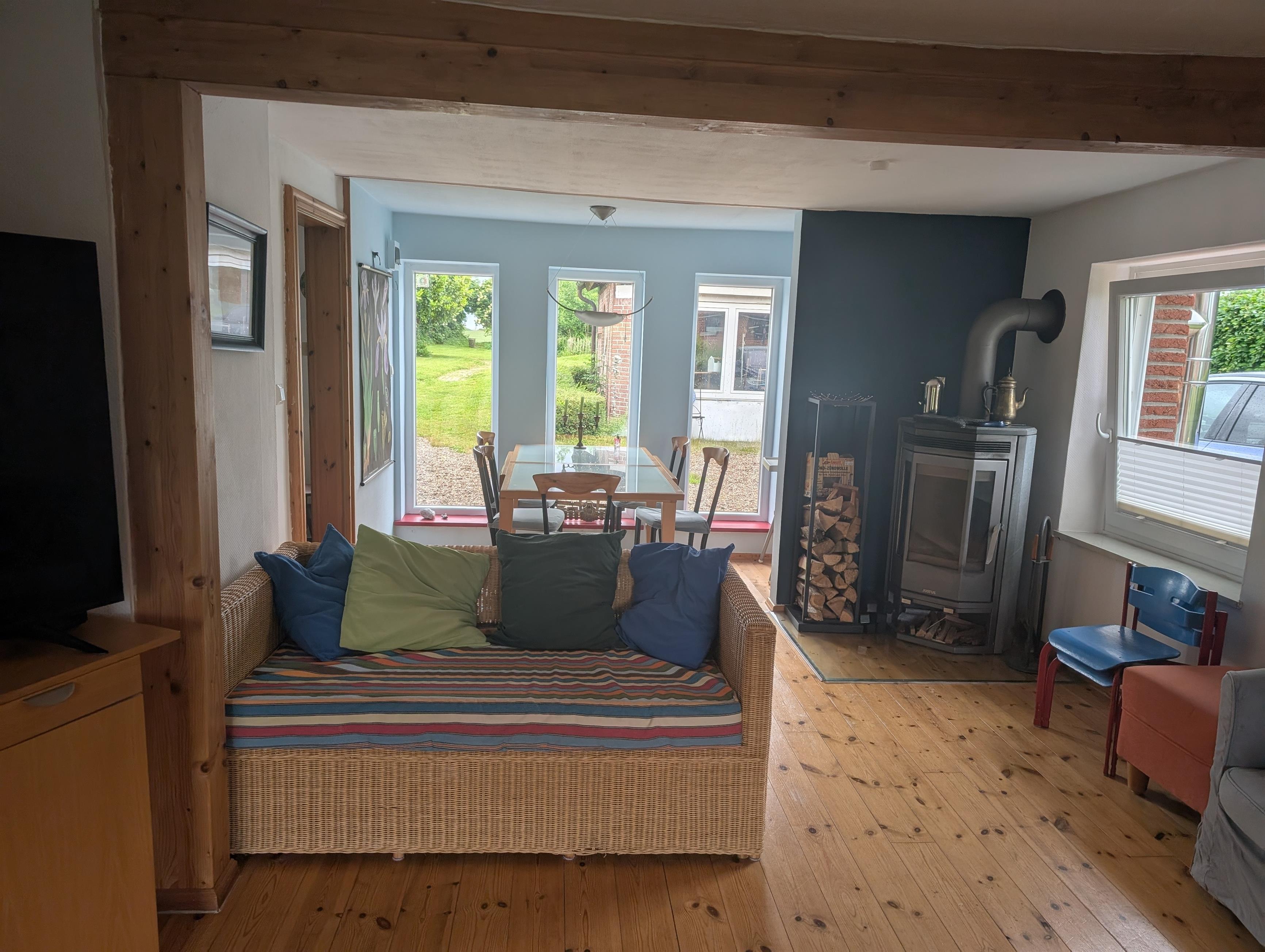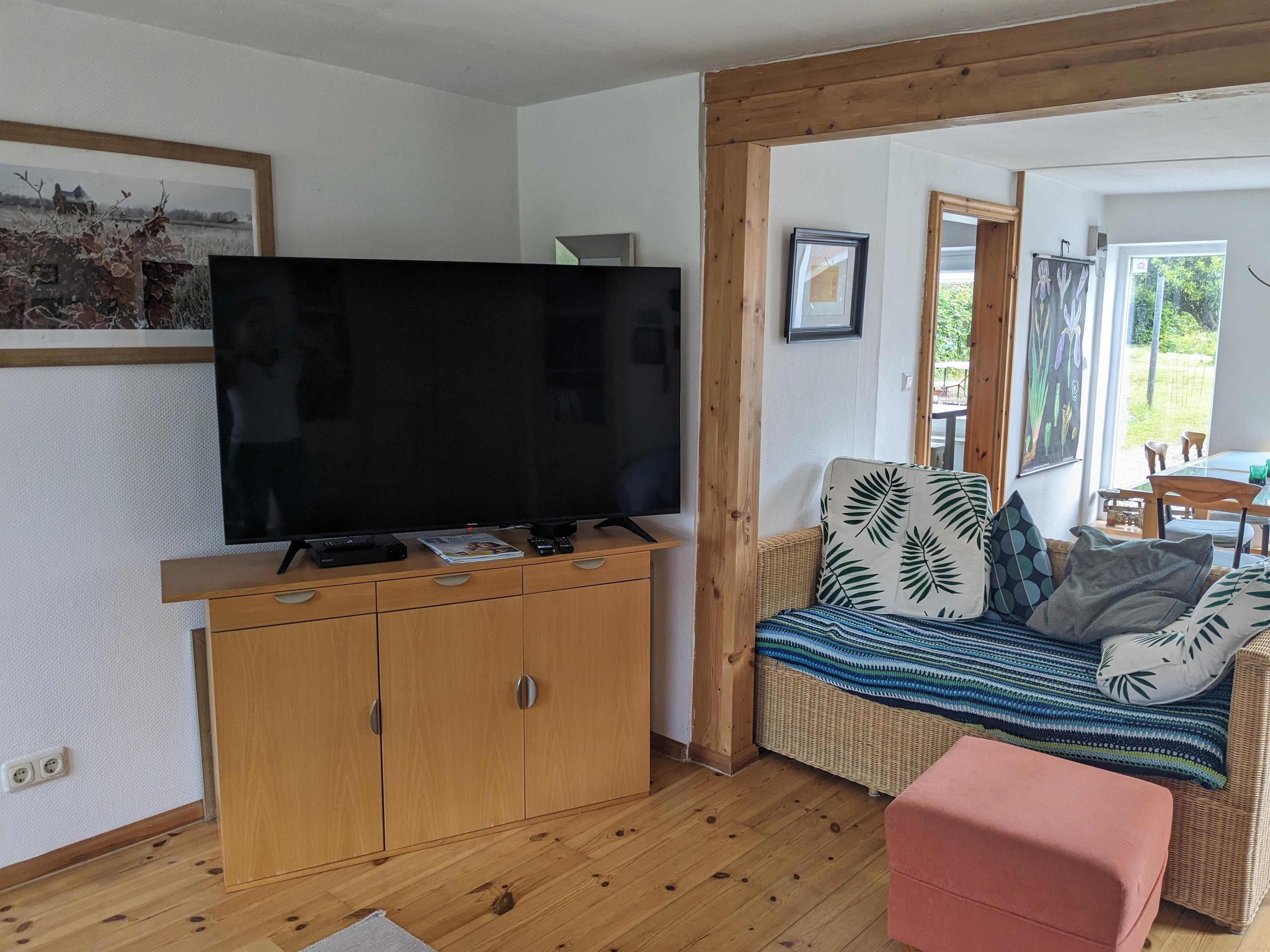 Das Wohnzimmer mit Essecke bietet mit ein gemütliches Umfeld und vor allem Platz für Gesellschaftsspiele und Fernsehabende. Ein Fernseher mit SAT-Anschluss und ein DVD-Player sorgen für Unterhaltung am Abend.