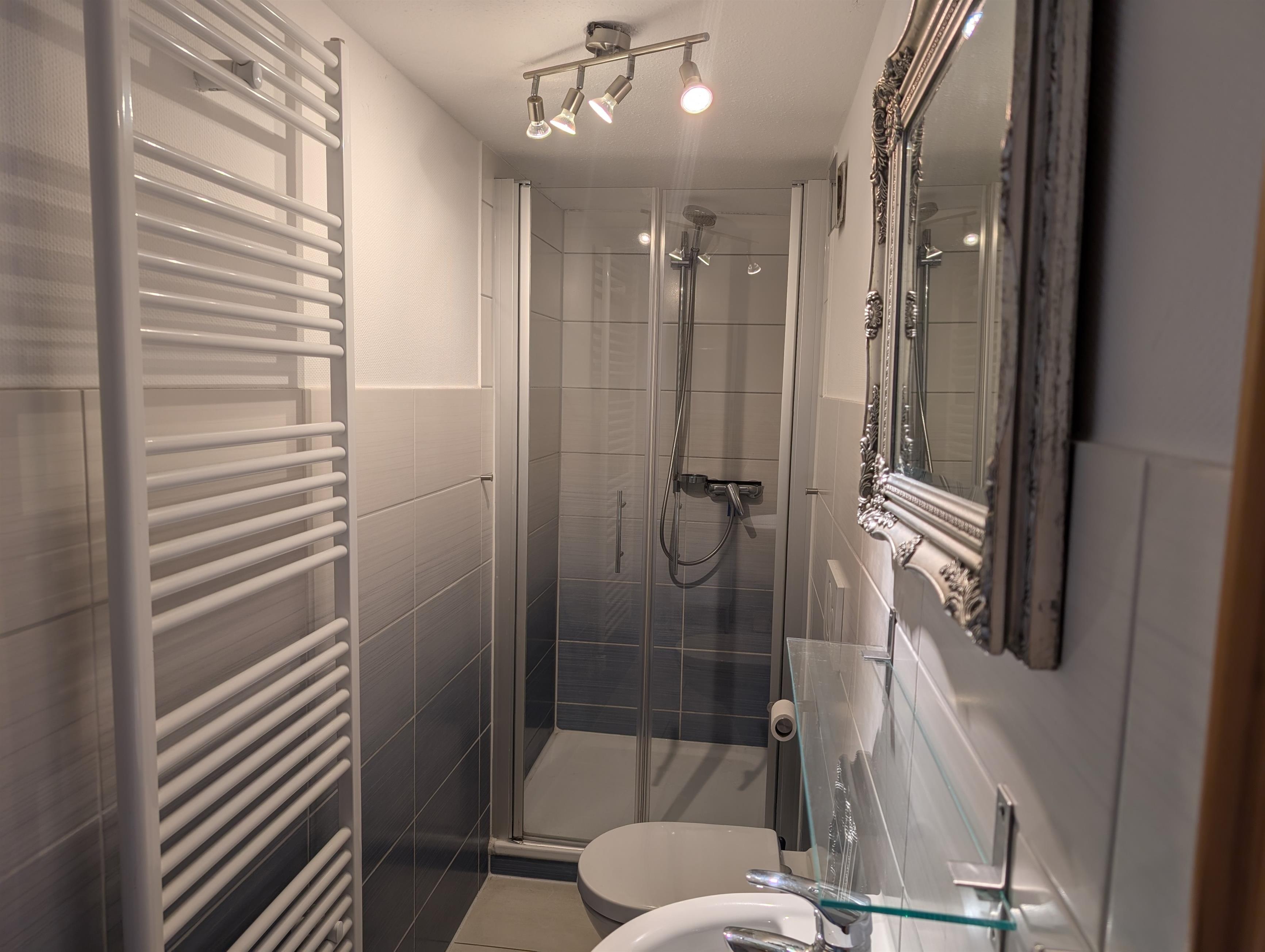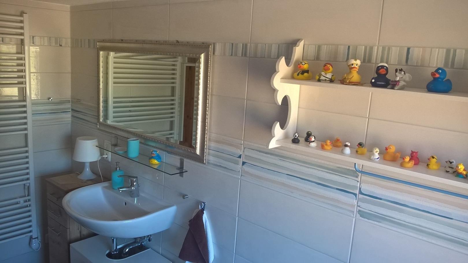 Das große Tageslicht-Bad (renoviert 2017) enthält Waschbecken, WC und Badewanne. Es ist auch genügend Ablagefläche für Ihre persönlichen Gegenstände vorhanden. Wickelauflage, Kinder-Toilettensitz und "Töpfchen" gehören auch zur Ausstattung. Hier befindet sich auch die Waschmaschine. Ein Duschbad wurde ebenfalls 2016 eingebaut.