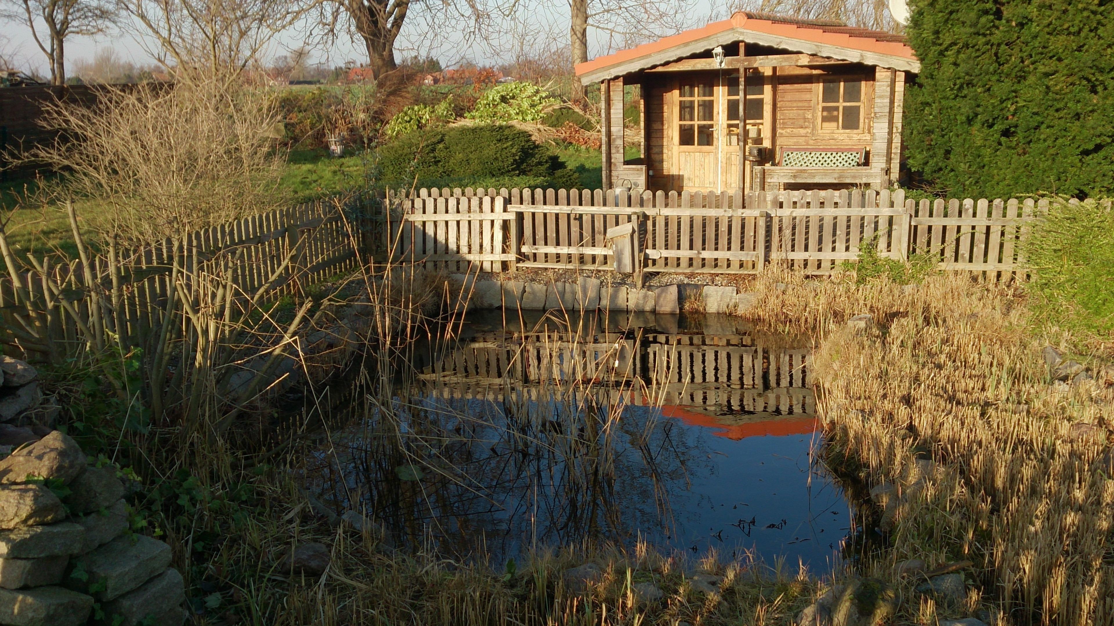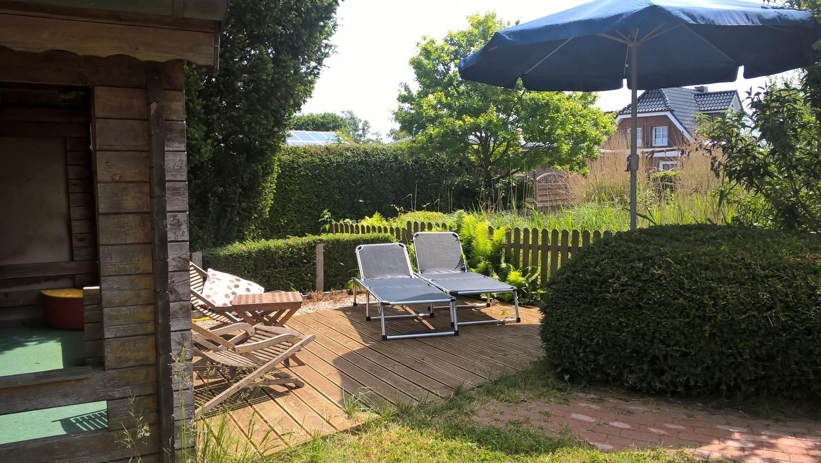 Garten: Das Grundstück bietet mit 1.400 qm viel Platz für Fußball, Federball und Frisbee; die ganz Kleinen freuen sich über Rutsche und Schaukel während sich die Eltern in den Liegestühlen auf der Terrasse beim (eingezäunten!) Goldfischteich entspannen können.