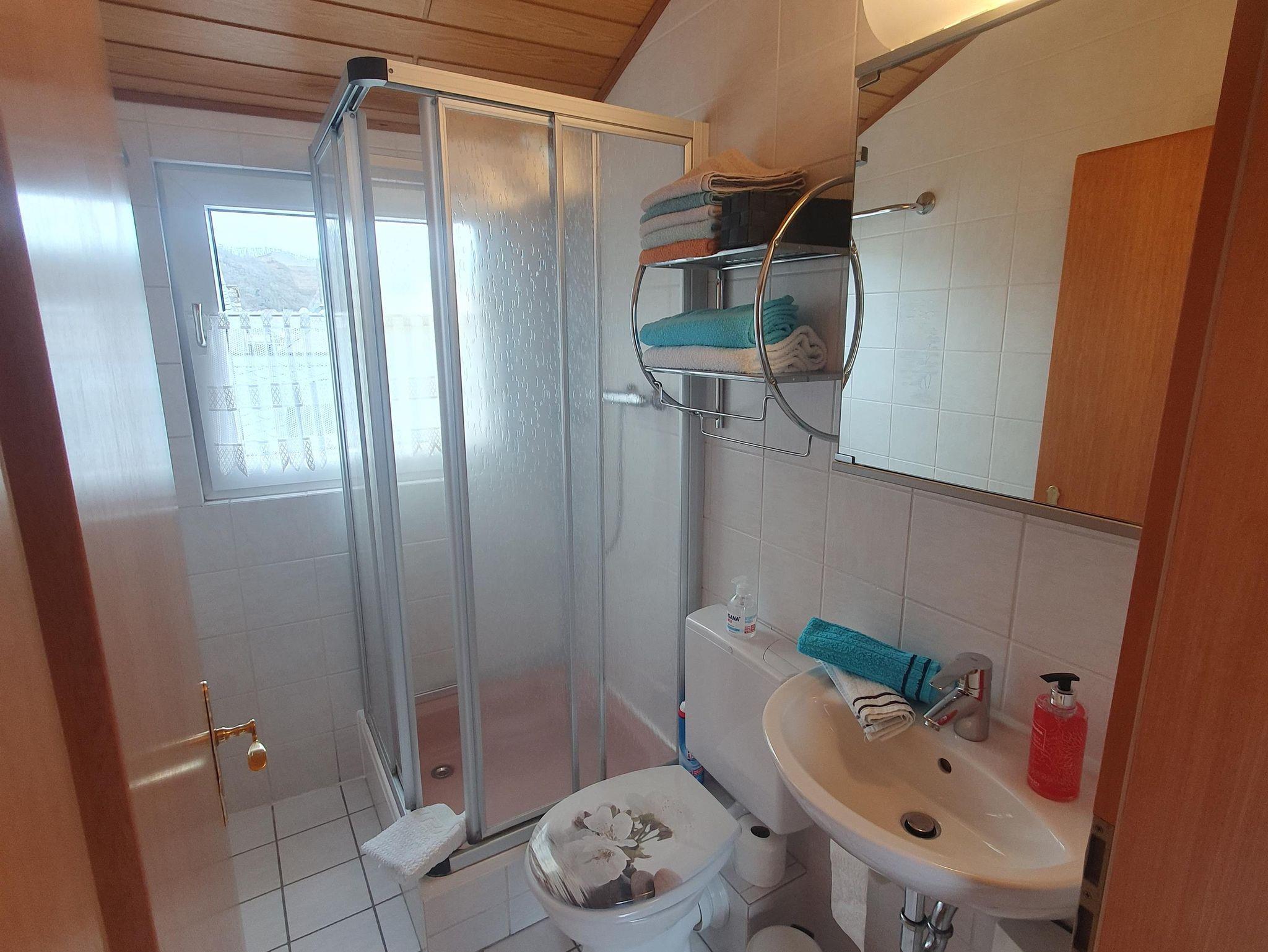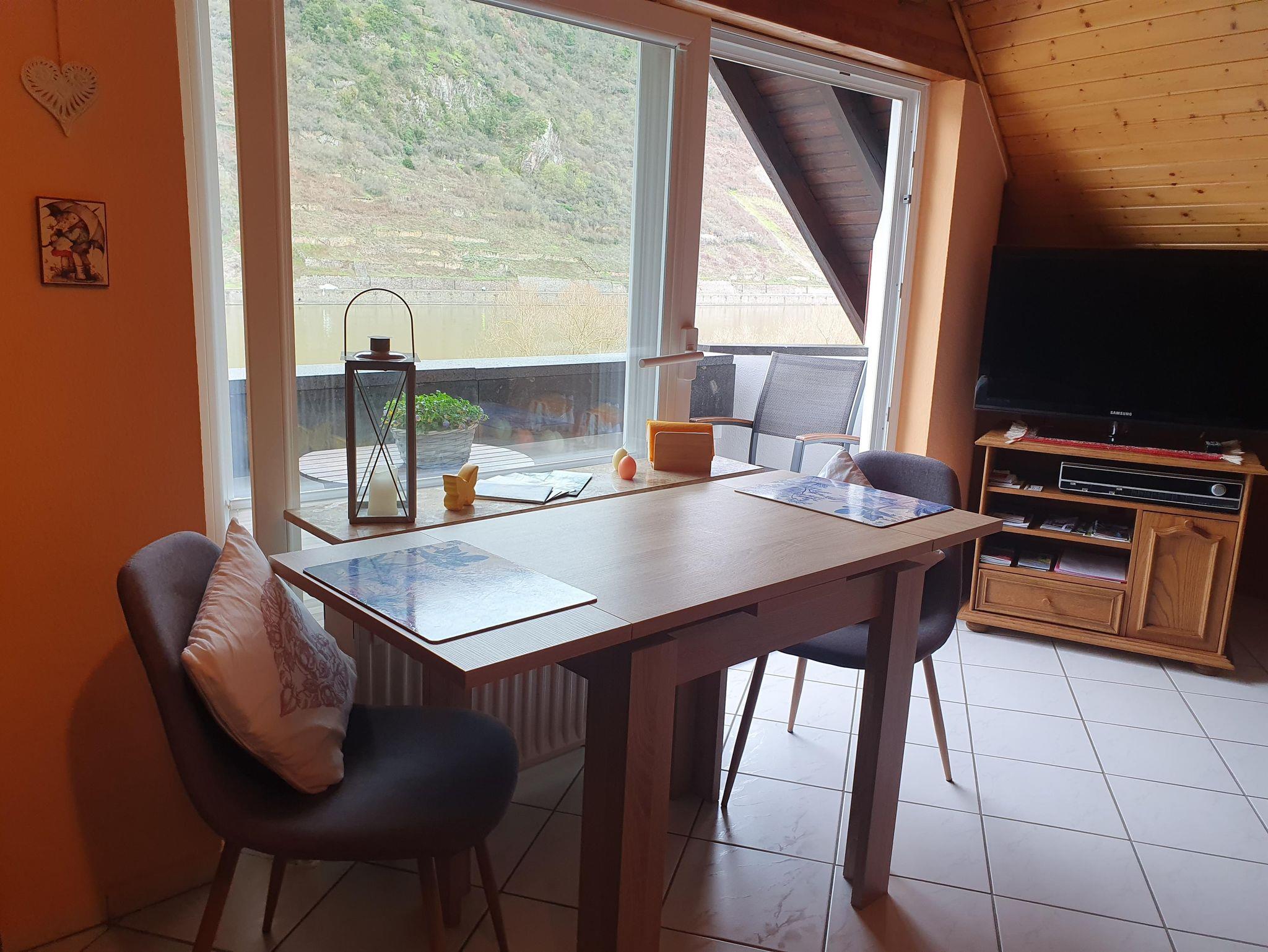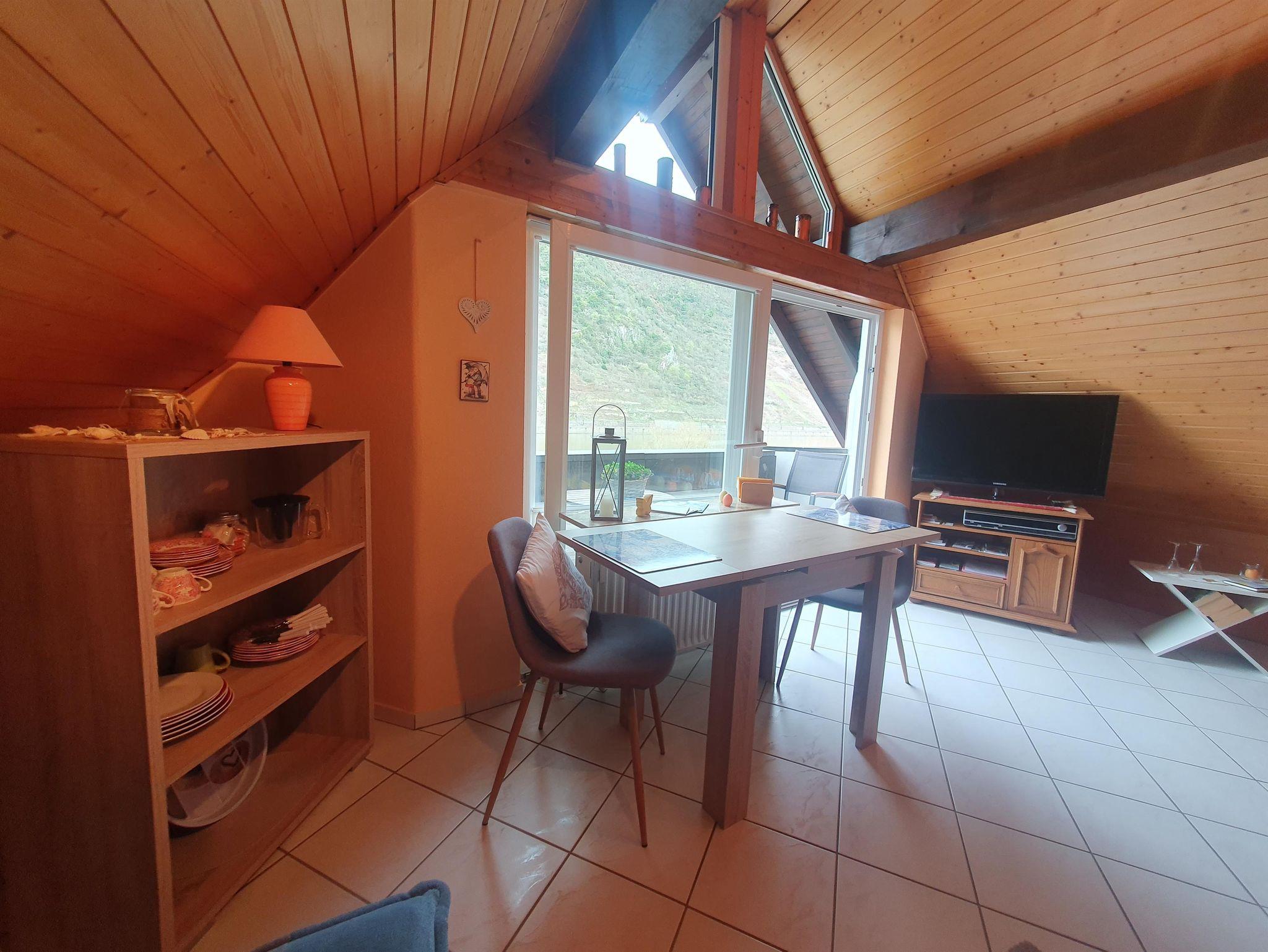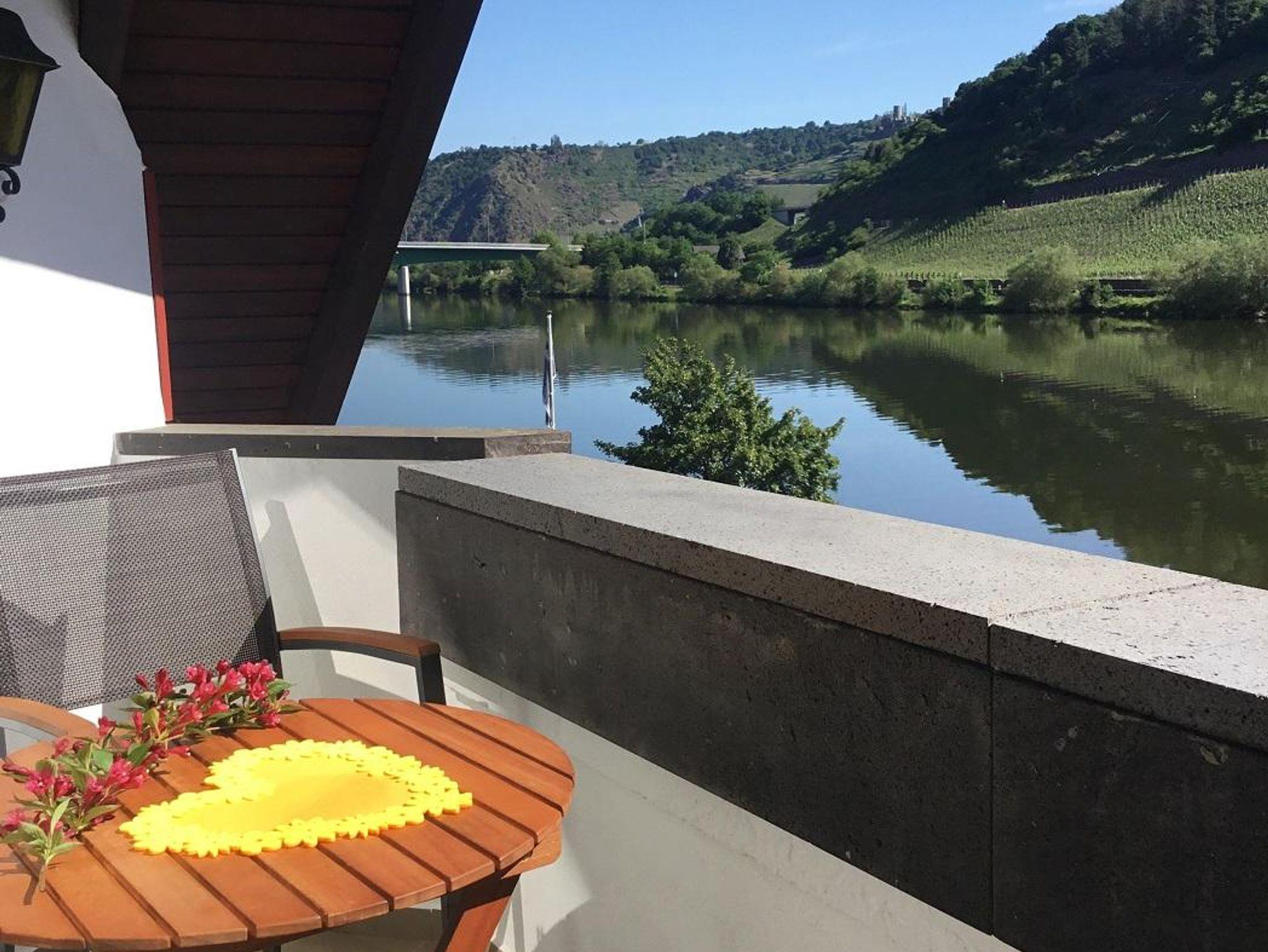 Das alte Fachwerkaus bietet eine 50 m² große wunderschöne und liebevoll eingerichtete Ferienwohnung, mit komplett eingerichteter Küche, Backofen, Kaffeemaschine, Wasserkocher, Eierkocher, Küchenutensilien, Geschirrspüler und vieles mehr. Die Wohnung ist mit Holz/Holzbalken und hellen Fließen ausgestattet. Sie ist lichtdurchflutet und hat einen schönen Balkon zur Mosel, die Weinberge, Burg Thurant. Die Aussichtslage ist toll, jede Jahreszeit lädt hier zum Verweilen ein. Im gemütlichen Wohnraum, Blicklage Mosel, befindet sich ein Flachbildschirm SAT-TV, Radio. Vom gemütlichen Sofa aus können Sie die Weinberge und die Mosel sehen. Die Essecke ist in Blicklage Mosel. Vom großen Boxspringbett 1,80 x 2,00 m, was natürlich mit frischer Bettwäsche bezogen ist, können Sie durch ein Panoramafenster den Himmel sehen. Im Bad ist eine Dusche, WC, Spiegelschrank mit Fön sowie Handtücher vorhanden.