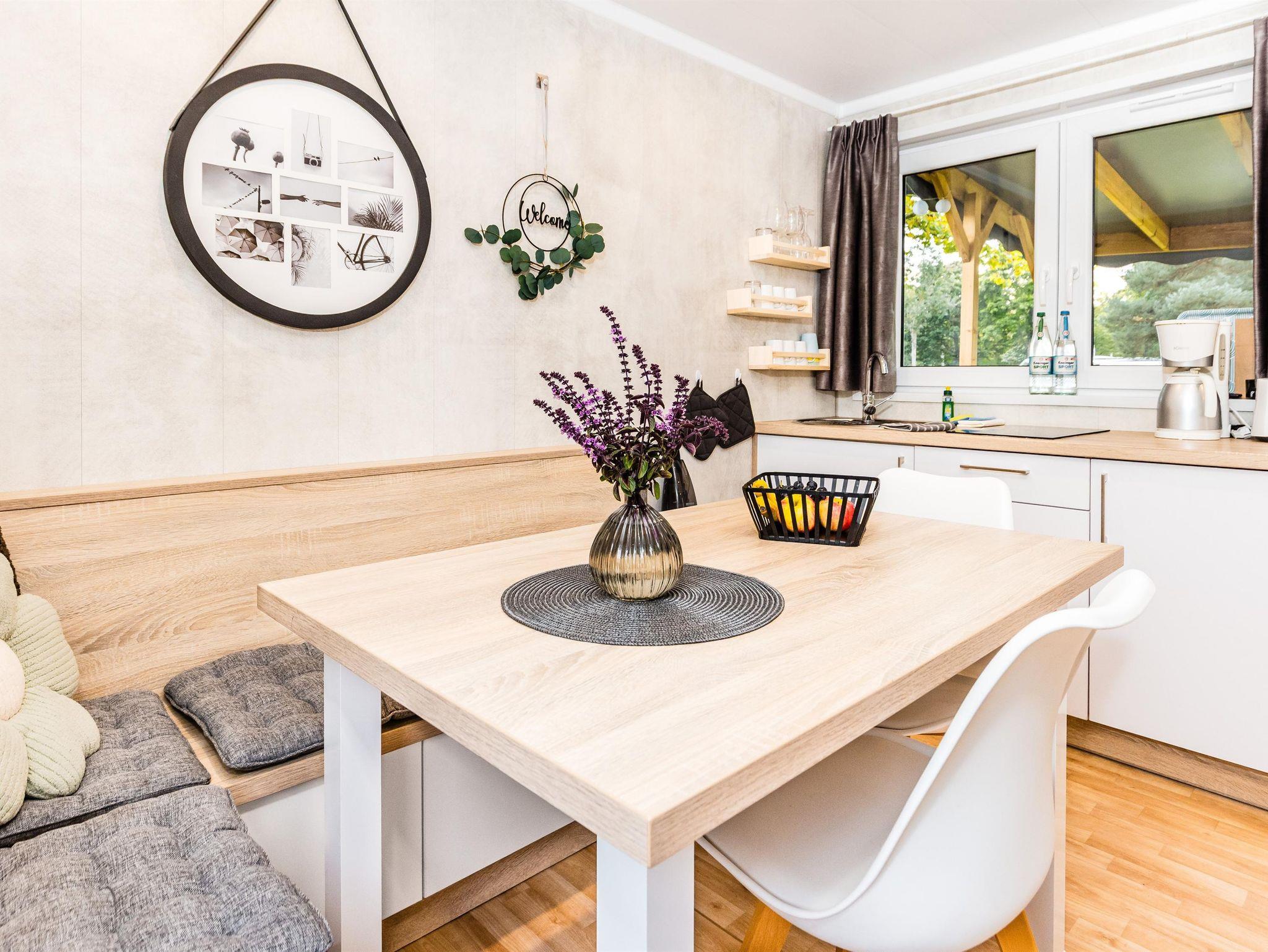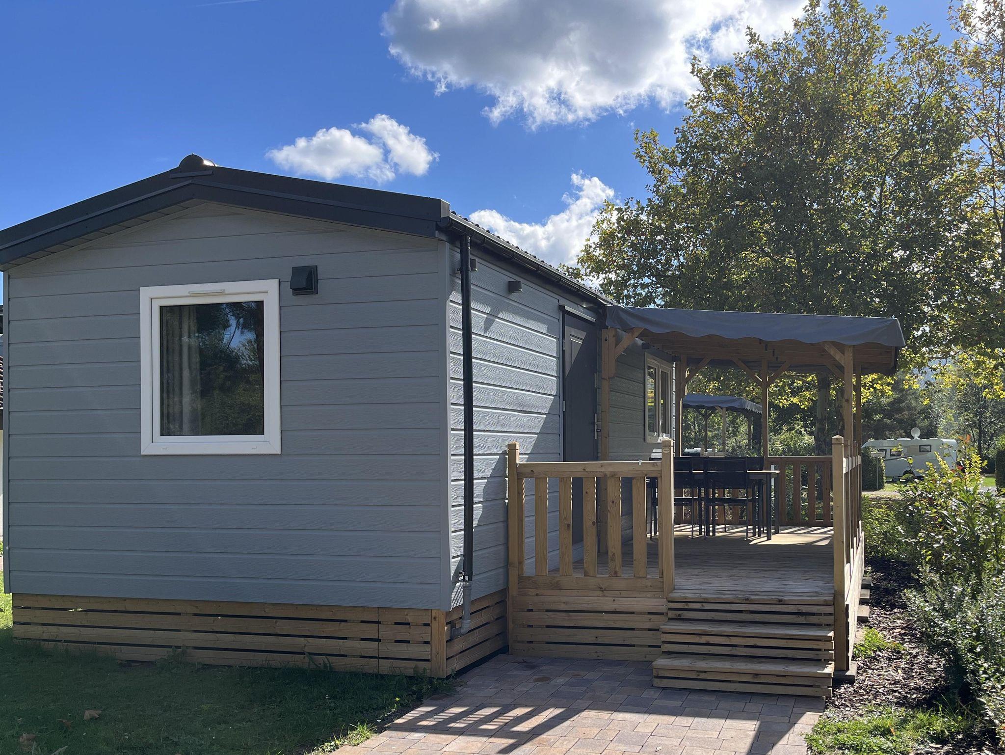 Sie wohnen in gemütlichen, liebevoll eingerichteten hochwertigen Mobile Home. Die Mobile Homes verfügen über ein Elternschlafzimmer und ein kleines Kinderzimmer mit 2 Kinderetagenbetten, Bettwäsche inklusive. Zudem finden Sie eine komplett eingerichtete Wohnküche mit Sitzecke, einen Herd mit mind. 2 Kochfeldern, Warmwasser, Kühlschrank und TV. Eine teilüberdachte Terrasse mit Sitzgelegenheiten für bis zu 6 Personen steht zur Verfügung.