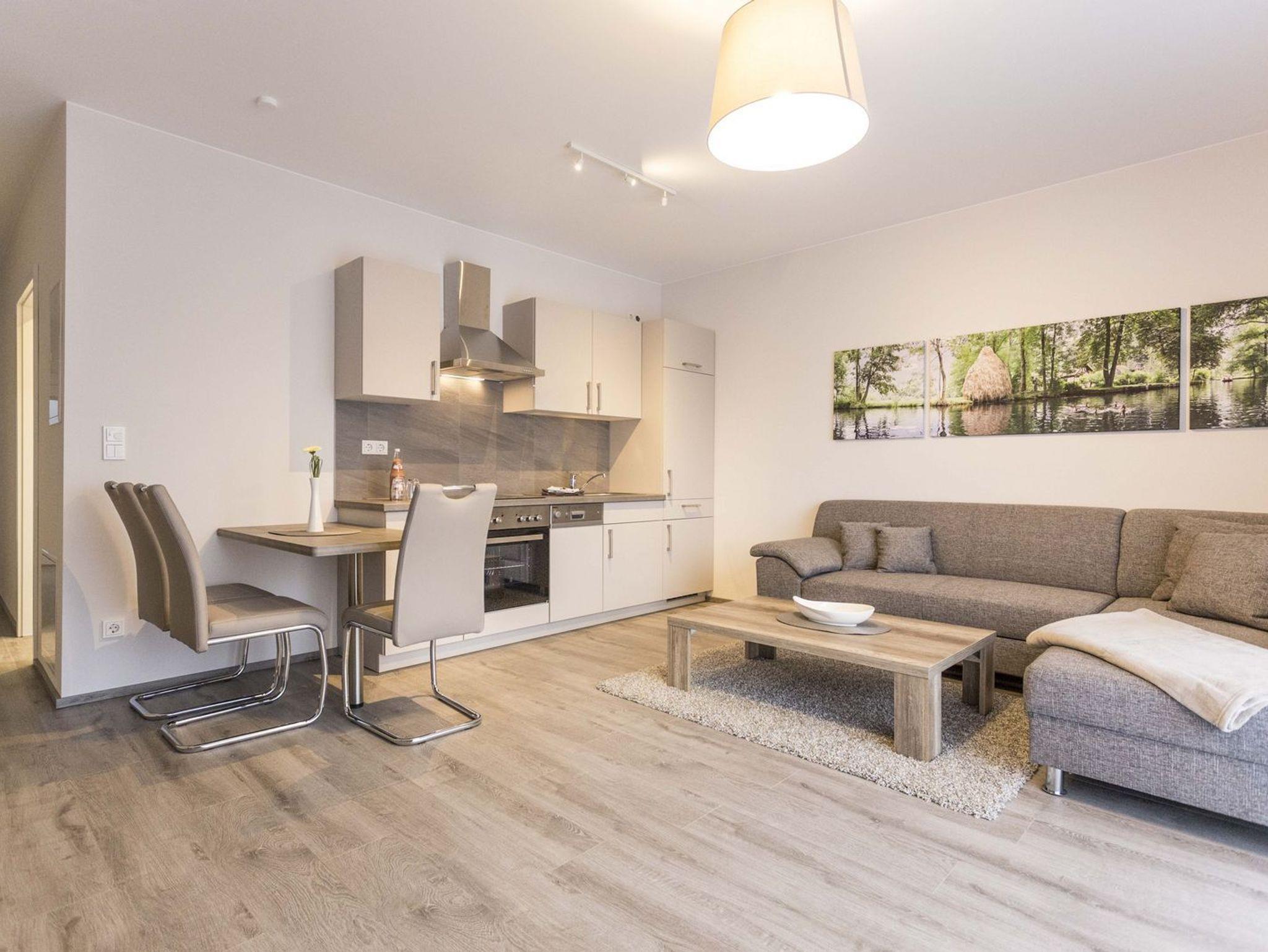 Die 8 Spreehaus-Apartments (60-75qm) wurden 2015 eröffnet und sind ideal für 2 bis 4 Personen. Sie sind gemütlich und modern ausgestattet und befinden sich direkt am Spreeufer. Jedes Apartment besitzt einen möblierten Balkon mit freien Blick direkt auf die Spree. Der moderne und helle Wohnbereich bietet eine bequeme Polstersitzgruppe mit Aufbettungsoption und ein Flat-TV, sowie einer ausgestatteten Küchenzeile mit Essbereich. Das Schlafzimmer verfügt über ein hochwertiges Boxspringbett. Im modernen Bad gibt es eine ebenerdige Dusche, einen Waschtisch mit einem großen Spiegel und ein WC.