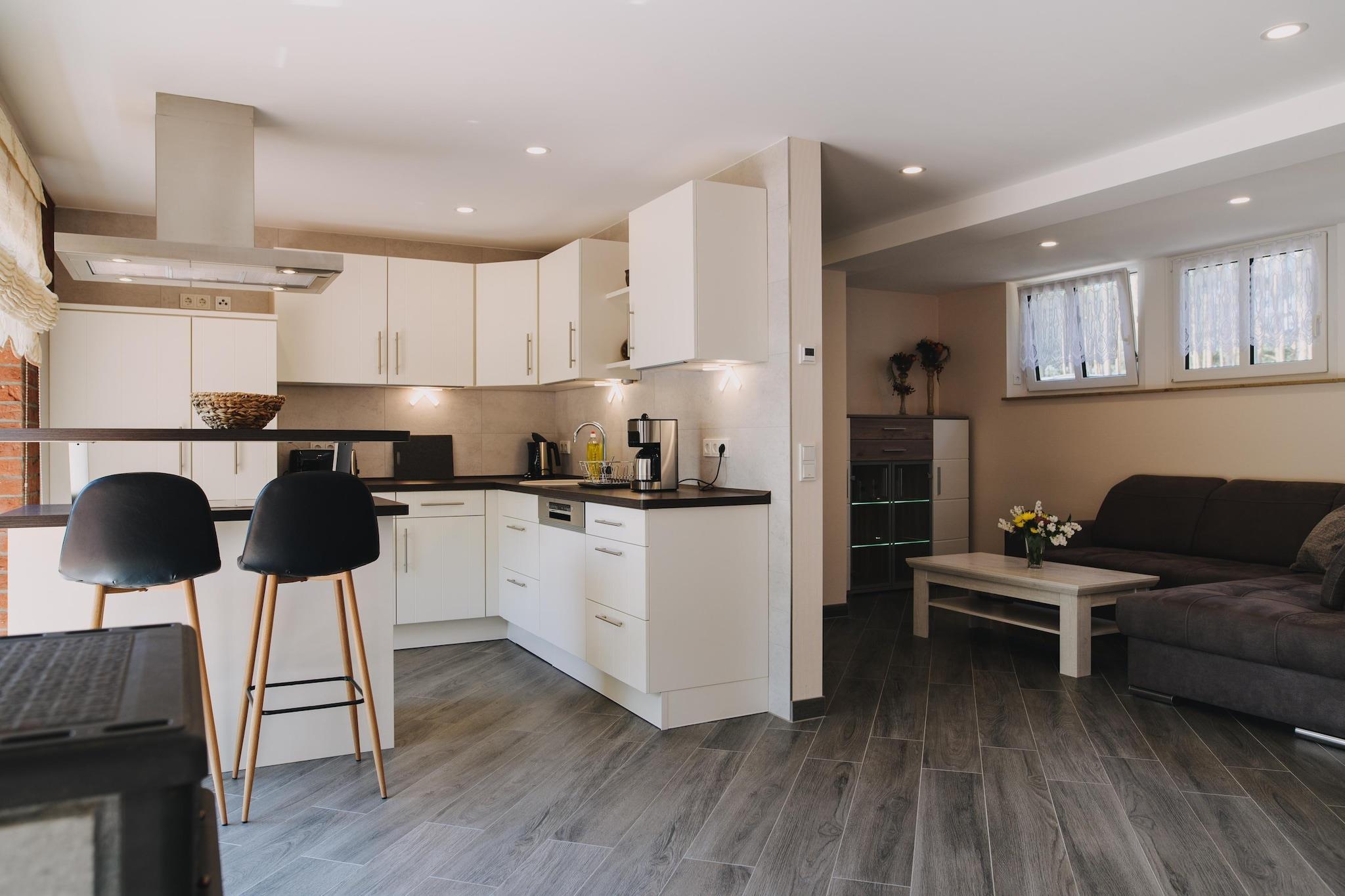 This newly renovated single-storey holiday home is located on the outskirts of Lübben, approx. 3km from the city center, directly in the countryside and on a property on a branch of the Spree. On the property there is a small guest house and an inn, a great children's playground and you have the opportunity to rent bicycles and borrow paddle boats for a canoe trip. Boat trips can be booked directly on site. Highlights included: final cleaning, laundry package, tea towels, WiFi, all consumption-based energy costs, parking space. Note: Wood for the fireplace is included for the first fireplace session. The firewood can then be purchased locally. Attention: Occupancy may only be 2 adults and 2 children up to 14 years old!