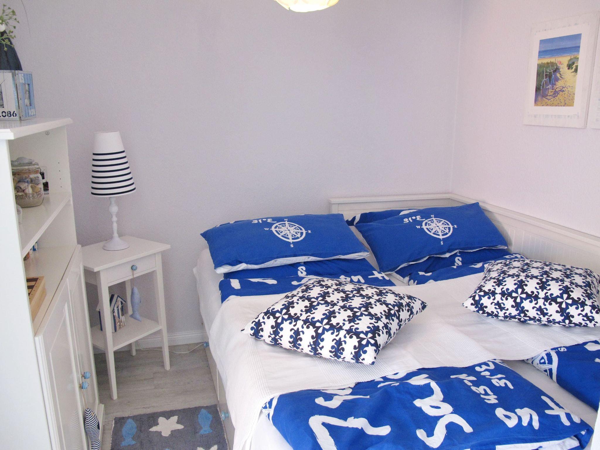 Diese exklusive 2-Zimmer-Wohnung im maritimen Wohnstil ist liebevoll und bis ins kleinste Detail hervorragend für Ihren Urlaub ausgestattet. Im hellen Wohnraum befinden sich eine bequeme Couch und ein Sessel mit Tisch. Neben der komfortablen Küchenzeile erwartet Sie ein Tresen mit schicken Hochstühlen. In der Wohnraumnische finden Sie ein schönes Doppelbett (160 cm x 200 cm) und eine Kommode vor. Das weitere Zimmer, abgehend vom Wohnzimmer, besteht aus einem Einzelbett (80 cm x 200 cm) sowie einem Kleiderschrank und einem Arbeitsbereich am Fenster. Abgehend vom Flur erreichen Sie das moderne Duschbad und das separate WC. Auf dem Balkon genießen Sie die frische Seeluft und schauen in die gepflegte Grünanlage.