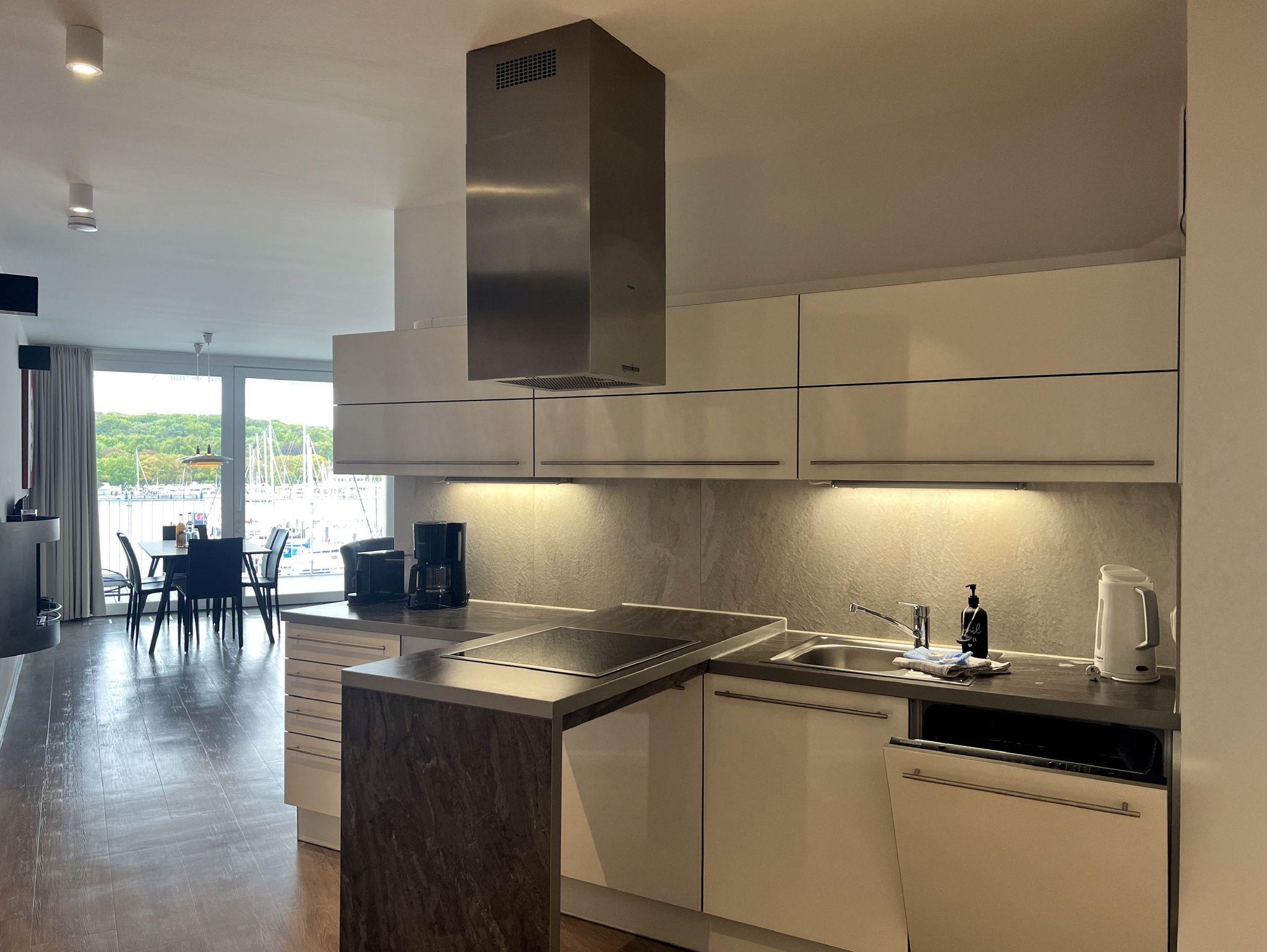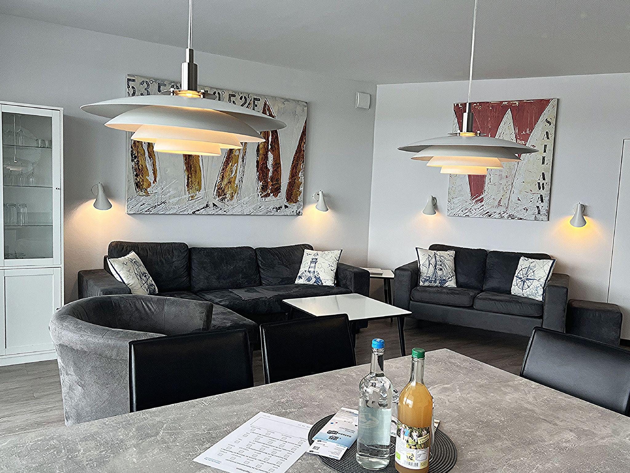 Regendusche. Im Wohnbereich sorgen am Abend die Flammen des Bioethanolkamins für eine gemütliche Atmosphäre, ebenso wie die vorbeifahrenden großen Schiffe mit ihrer eindrucksvollen nächtlichen Beleuchtung.