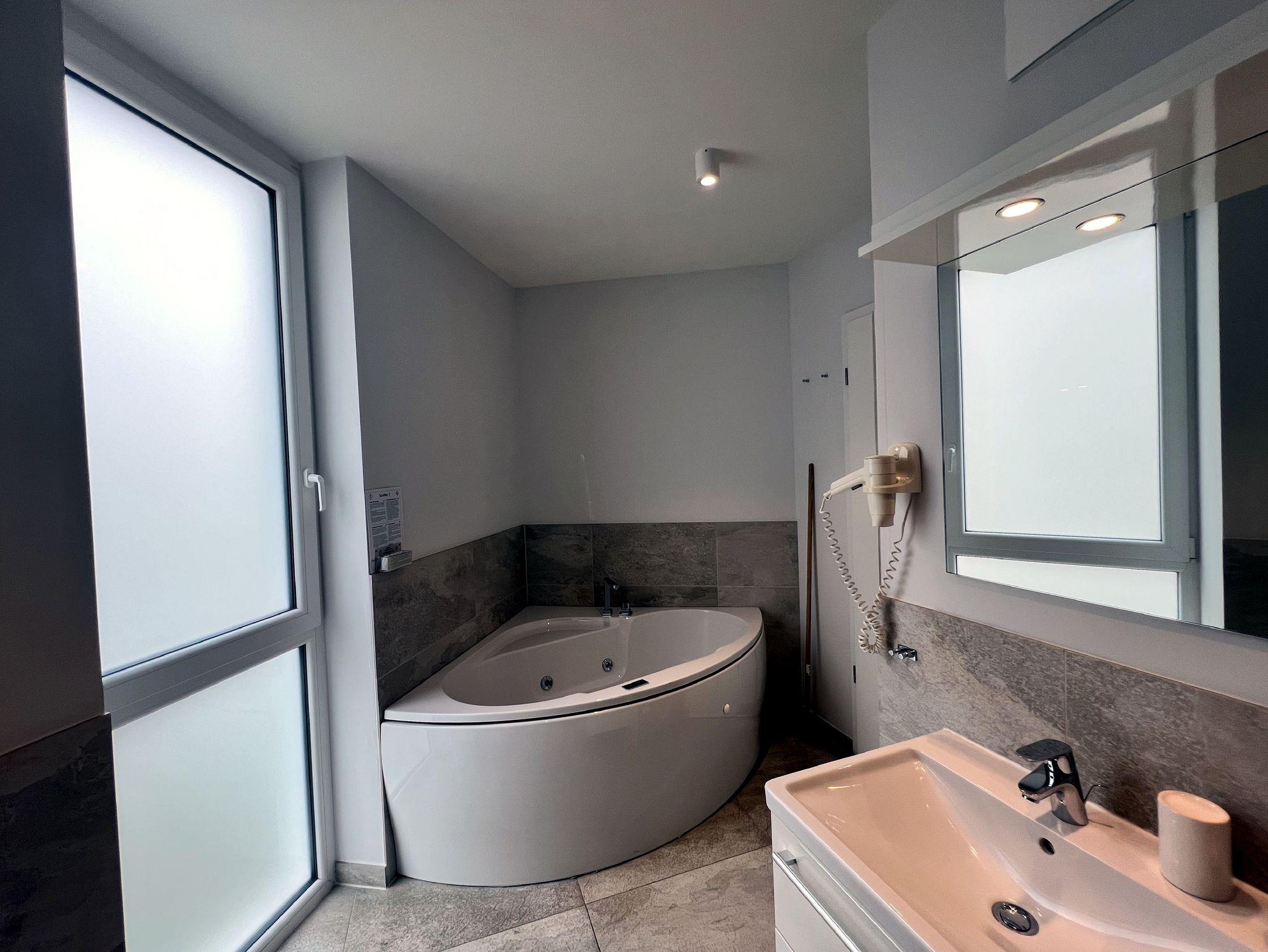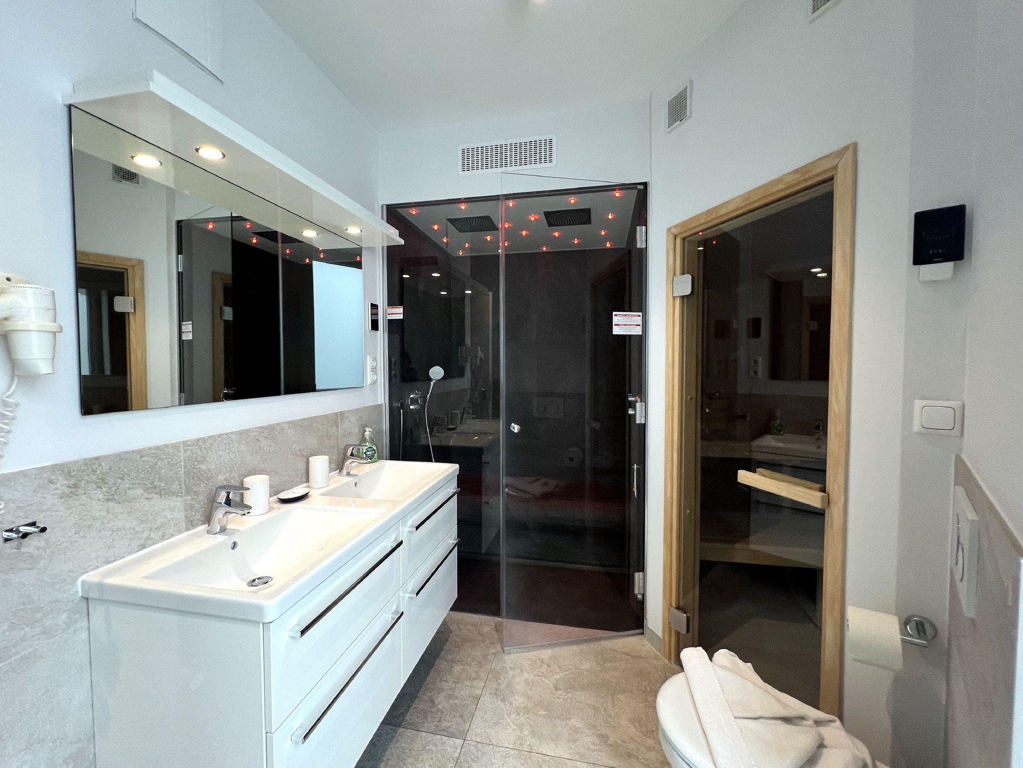 Die Wohnung ist stilvoll, hochwertig und modern eingerichtet. Ein besonderes Highlight ist ihr persönlicher Wellnessbereich mit Sauna, Whirlpool und Dampfbad mit integrierter Doppel-