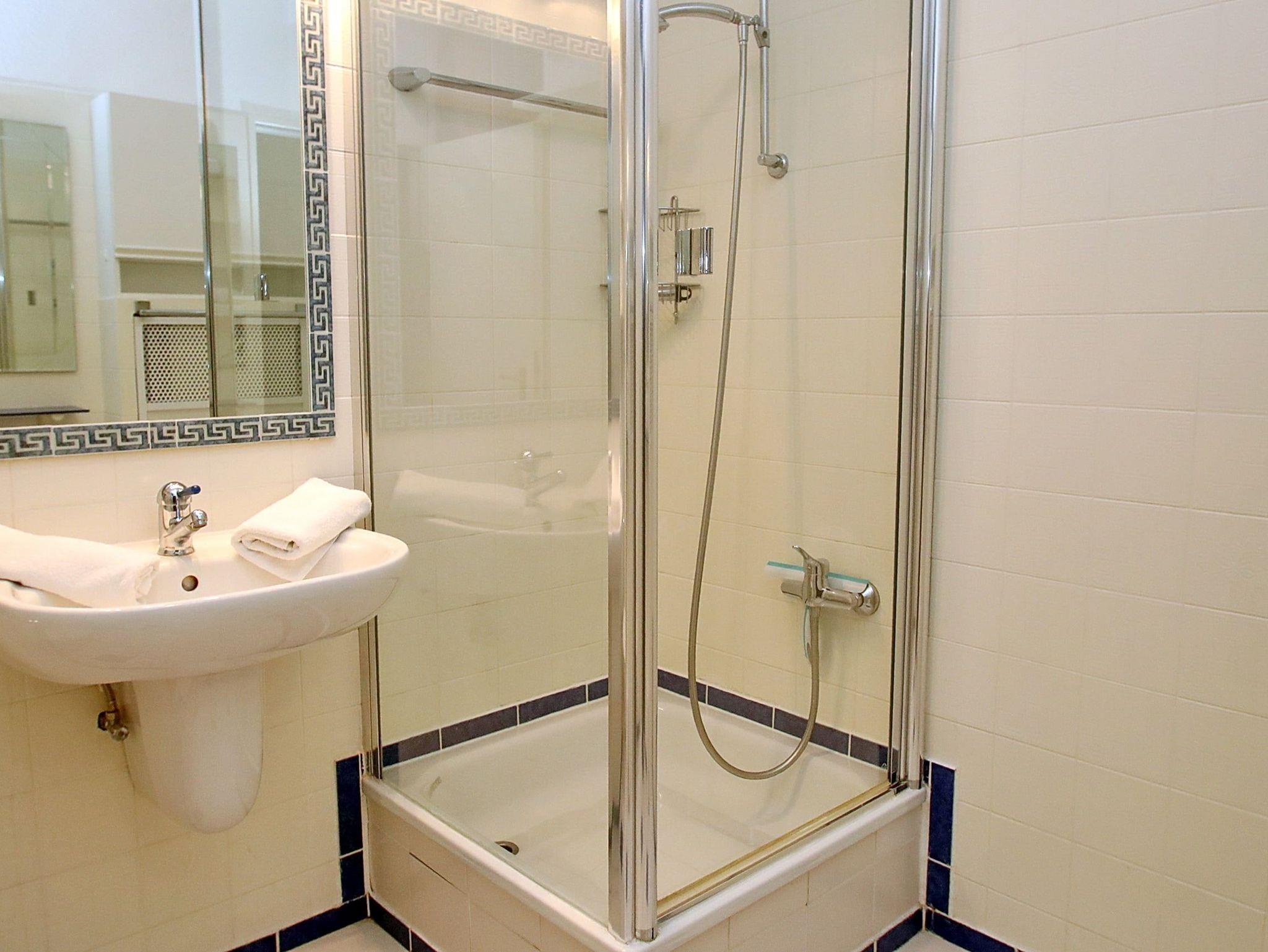 Terrasse, elektr. Außenjalousie, Küche, Geschirrspüler, Duschbad/WC, Fön, (Waschmaschine und Trockner im Haus), TV, DVD, Stereoanlage, kostenl. W-Lan, inkl. Tiefgaragenstellplatz (Einfahrtshöhe: 1,90 m).