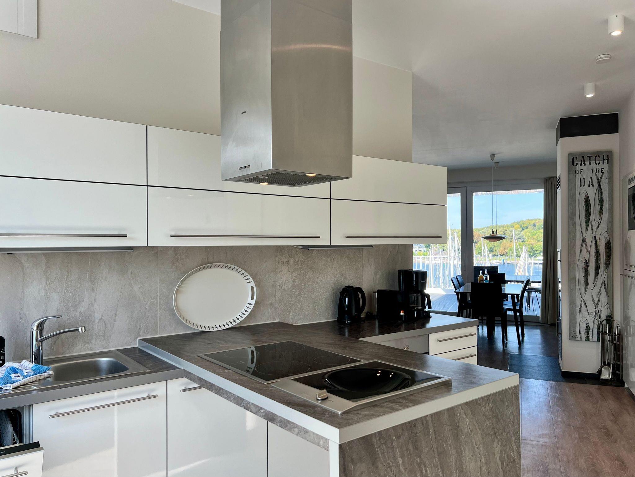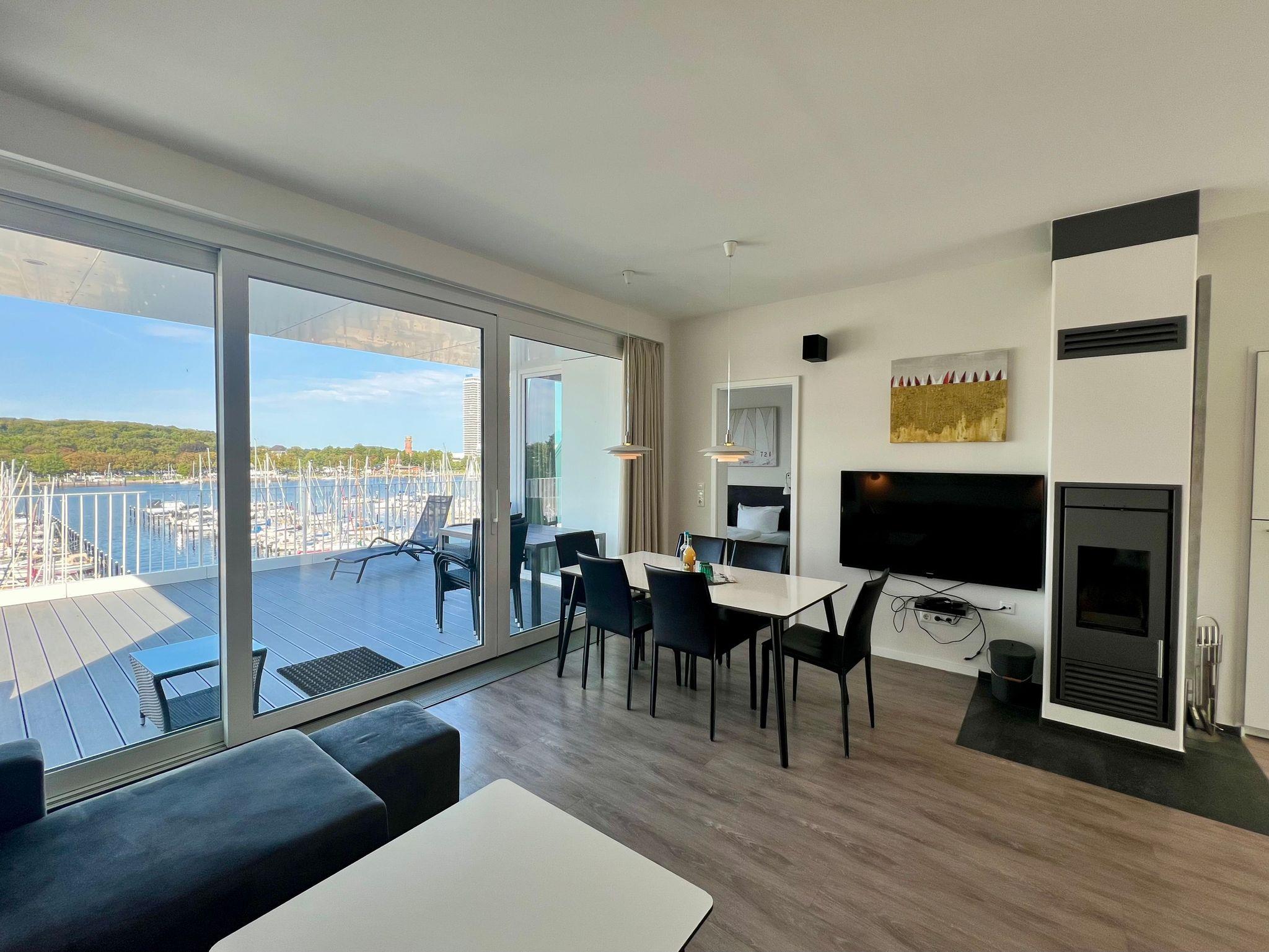 Regendusche. Im Wohnbereich sorgen am Abend die Flammen des Kamins für eine gemütliche Atmosphäre, ebenso wie die vorbeifahrenden großen Schiffe mit ihrer eindrucksvollen nächtlichen Beleuchtung.