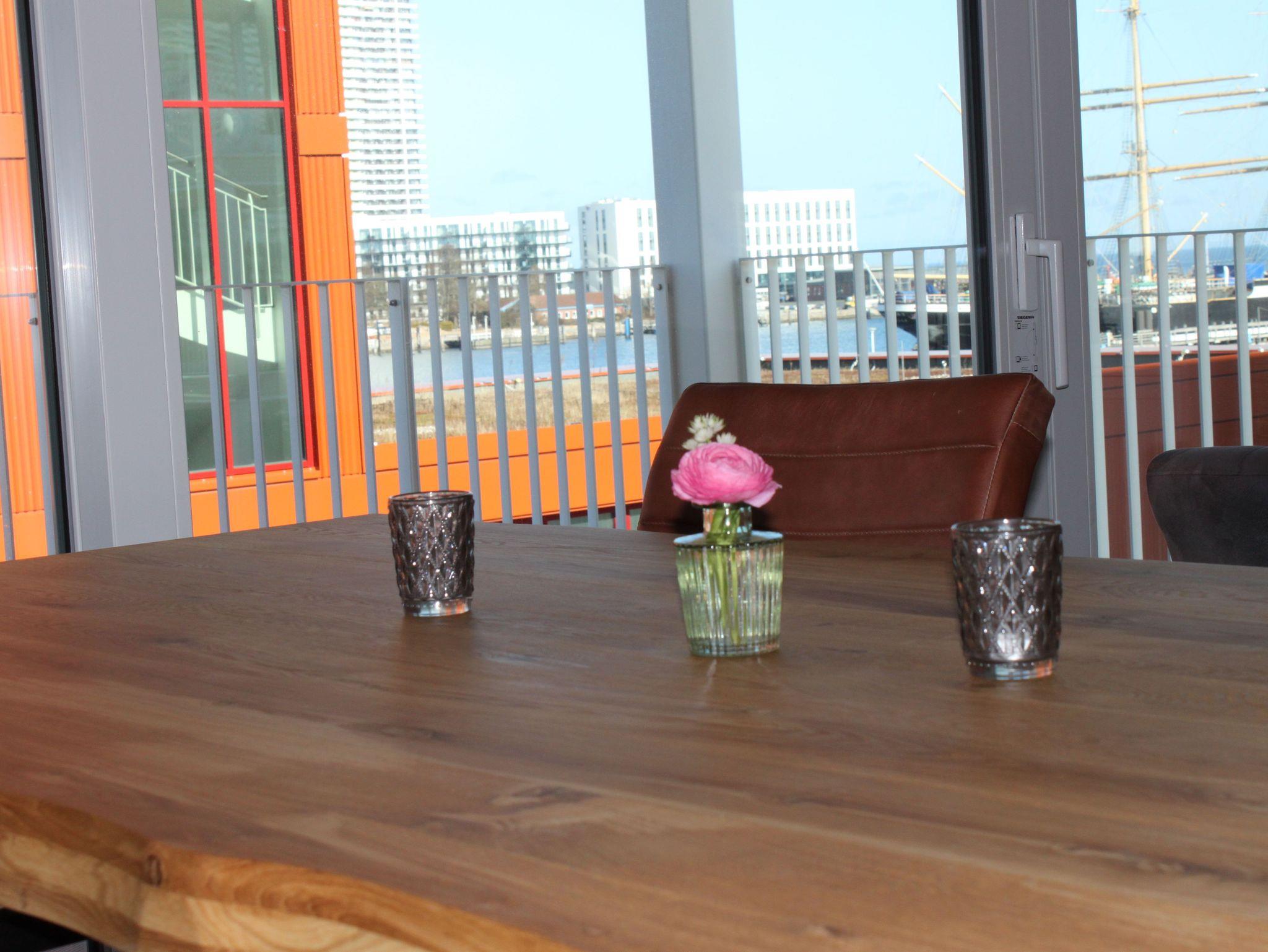 Regendusche. Im Wohnbereich sorgen am Abend die Flammen des Bioethanolkamins für eine gemütliche Atmosphäre, ebenso wie die vorbeifahrenden großen Schiffe mit ihrer eindrucksvollen nächtlichen Beleuchtung.