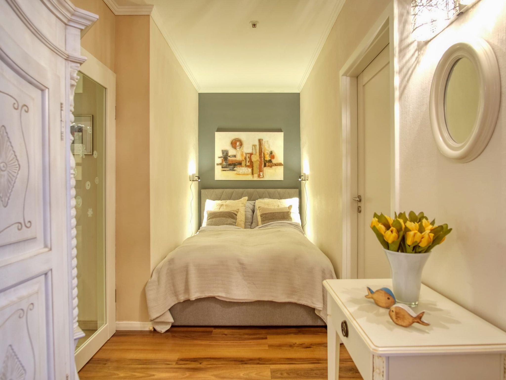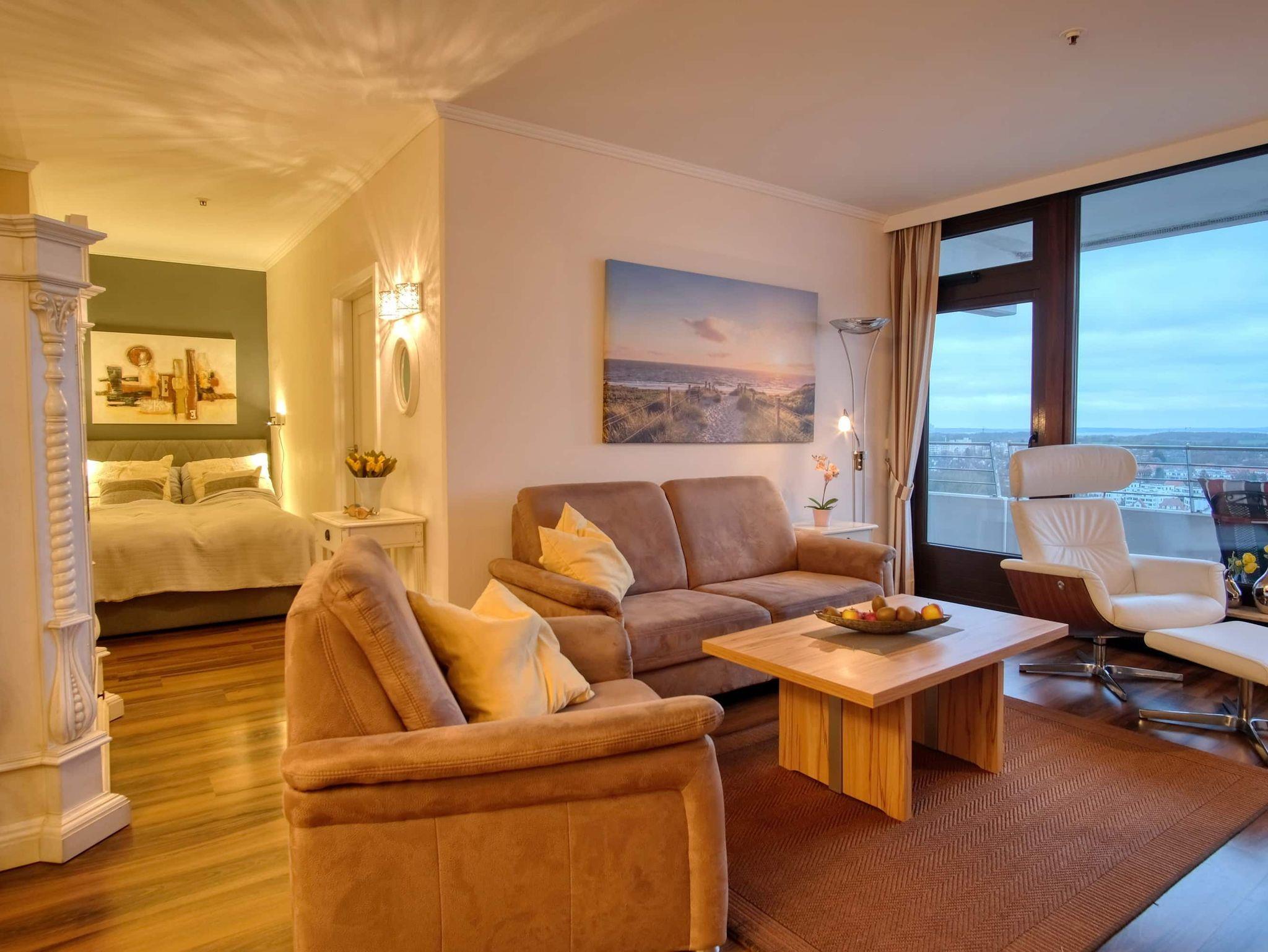 Dieses elegante, exklusive Appartement entspricht höchsten Ansprüchen und lädt sofort zum Wohlfühlen ein. Im sehr geschmackvoll eingerichteten Wohnbereich befinden sich eine gemütliche zweiteilige Couchgarnitur mit Tisch, eine moderne Vitrinen Wohnwand und eine Essecke neben der neuen Küche. Des Weiteren befindet sich separat in der Wohnraumnische eine hochwertiges Doppelbett (140 cm x 200 cm). Im schönen Schlafzimmer stehen ein bequemes Doppelbett (2x 90 cm x 200 cm) und ein großzügiger Kleiderschrank. Das moderne, helle Duschbad geht vom Flur ab. Schicke Accessoires verleihen diesem farblich abgestimmten Appartement ein ganz besonderes Ambiente. Den großen Balkon erreichen Sie von beiden Zimmern. Hier genießen Sie einen fantastischen Blick auf den Strand und die Lübecker Bucht.