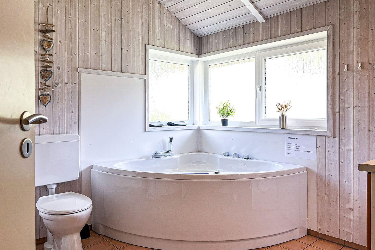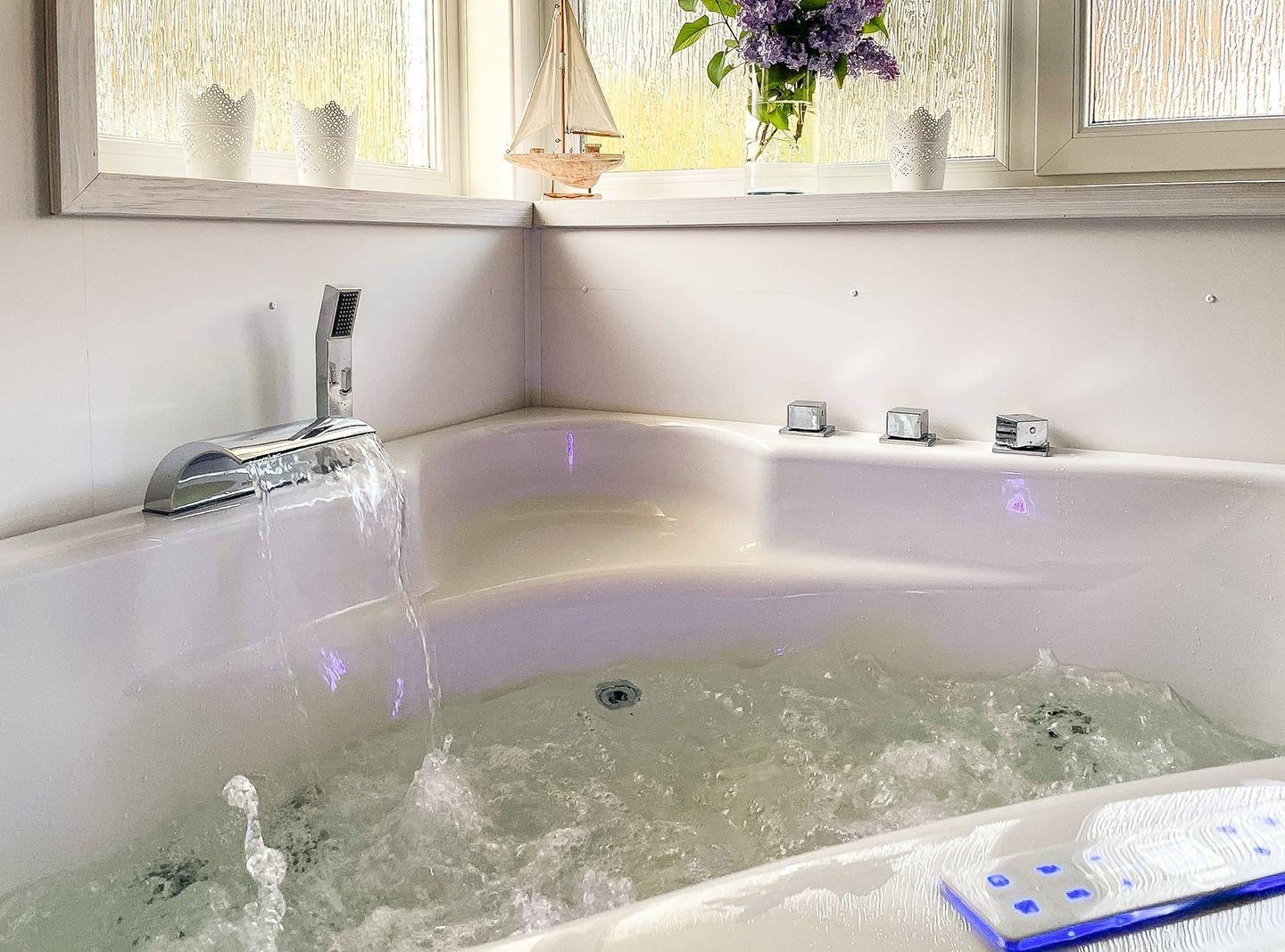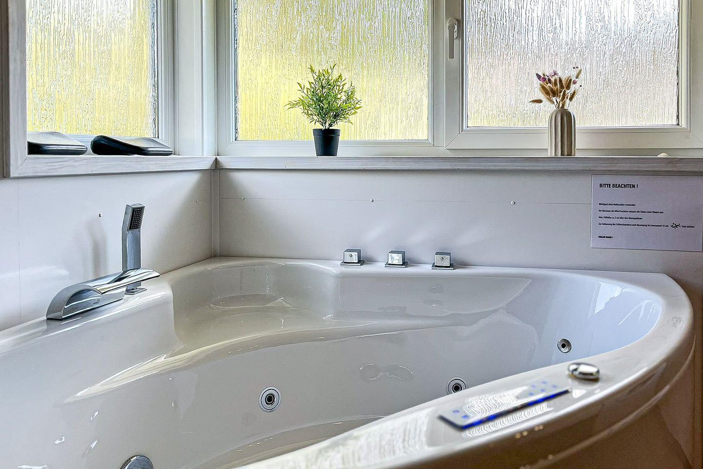 Das Badezimmer bietet eine Sauna, einen Whirlpool (für bis zu 2 Personen), eine bodengleiche Dusche, ein WC und ein Waschbecken.